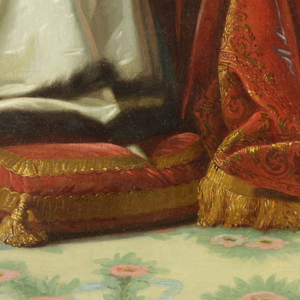 Olio su tavola. Copia del celebre ritratto di "Maria Antonietta con un libro", ultimo ritratto ufficiale di corte, dipinto da Louise Elisabeth Vigée-Le Brun, amica e coetanea della regina (al retro cartiglio con riferimento all'opera originale). La tavola, restaurata e parchettata nell'800, è presentata in bella cornice dorata di metà '800.