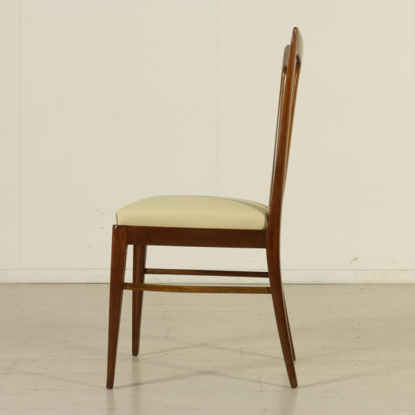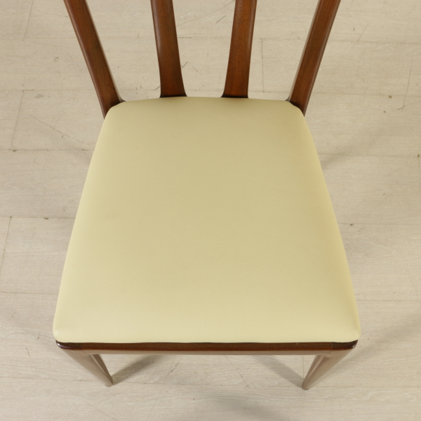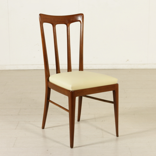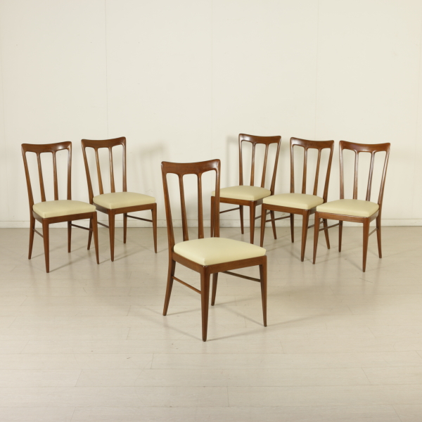 Gruppo di sei sedie; legno di faggio tinto, imbottitura in espanso, rivestimento in similpelle.