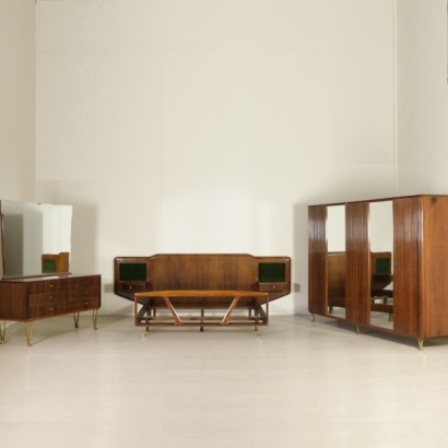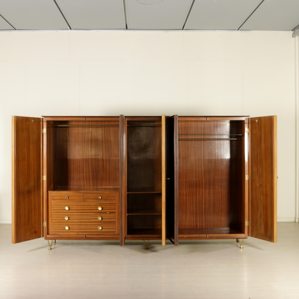 Mobile armadio anni 50; legno impiallacciato bois de rose, ante con pannello grissinato e vetro a specchio; eleganti gambe in fusione di ottone.
