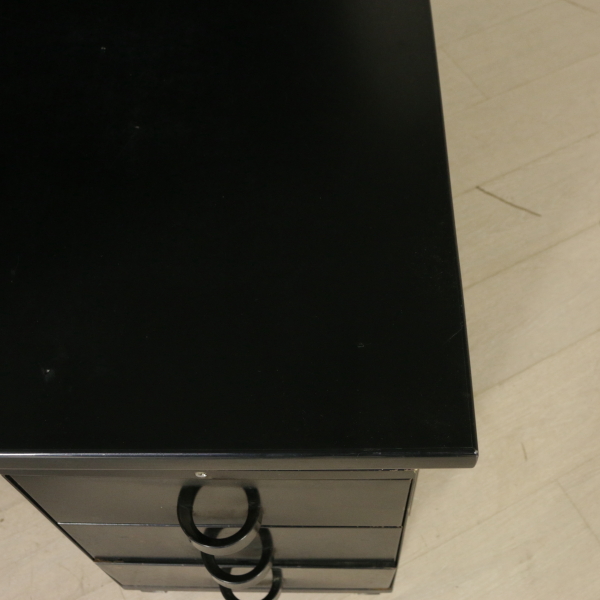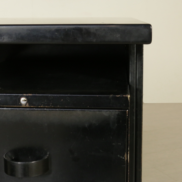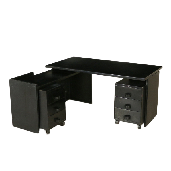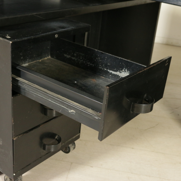 Scrivania Tecno ad angolo con due cassettiere; legno e metallo laccato.