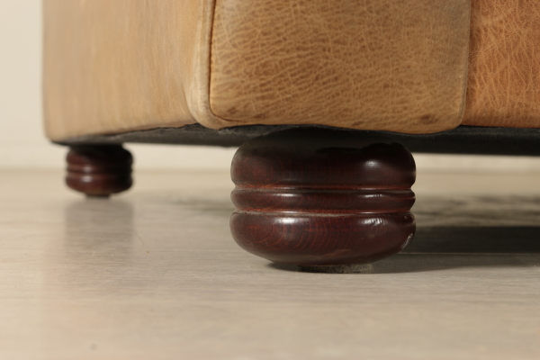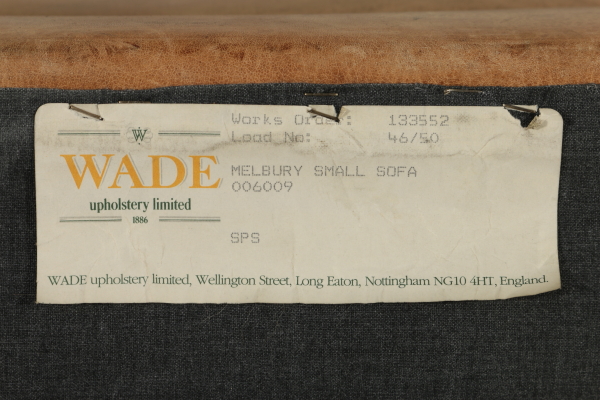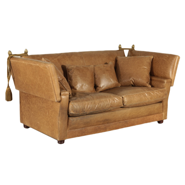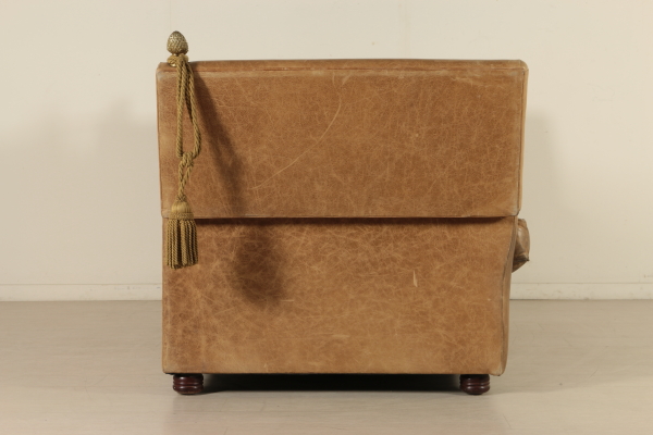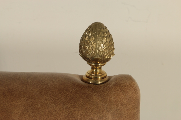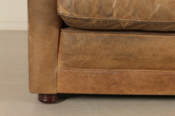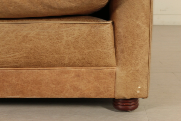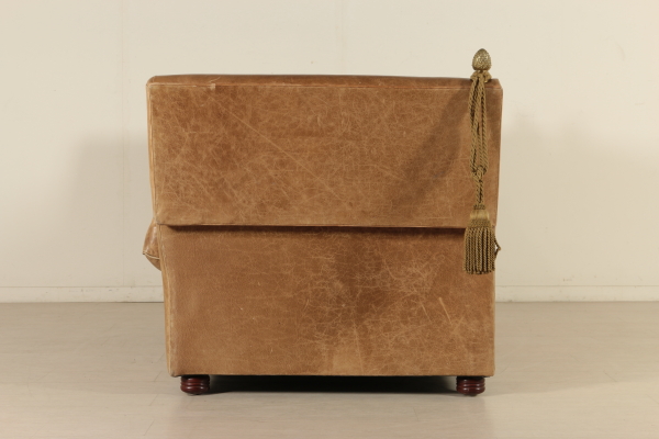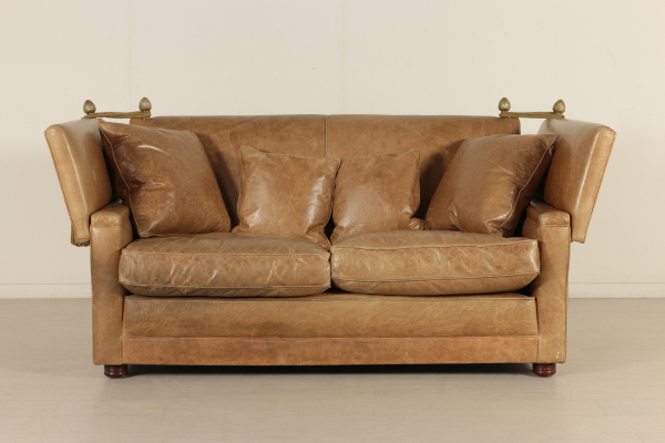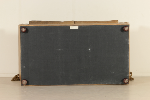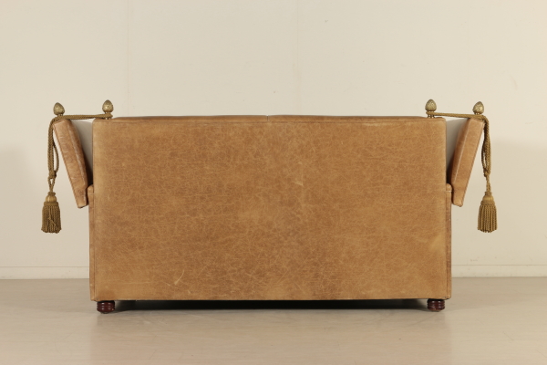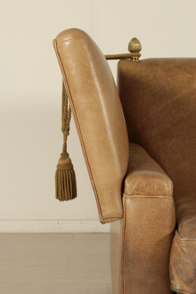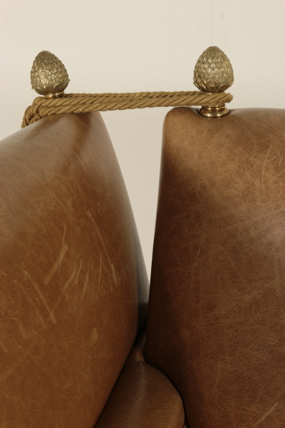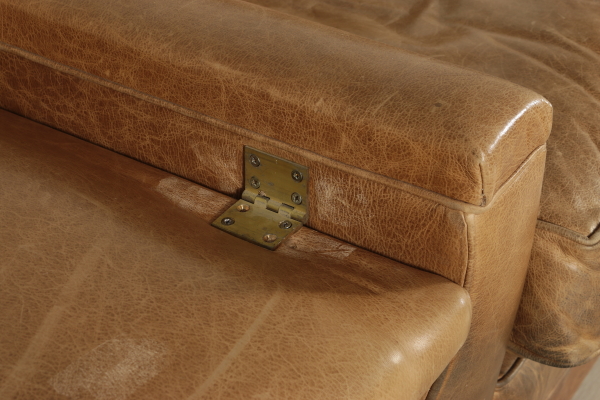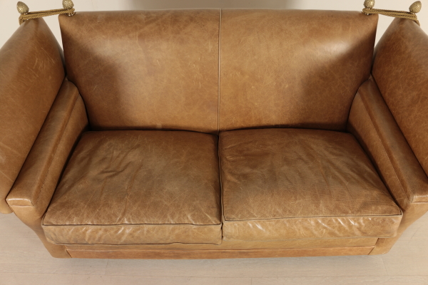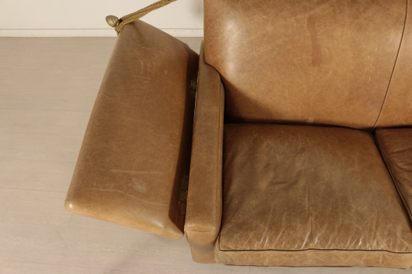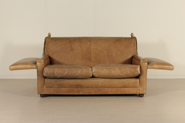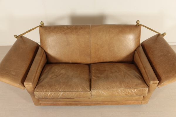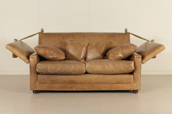Divano a due posti con braccioli reclinabili; imbottitura in espanso, rivestimento in pelle.