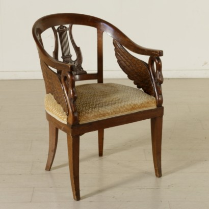 Elegante poltrona retta da gambe a sciabola, presenta montanti con cigni dalle ampie ali e cartella a lira finemente intagliata con maschere greche differenti tra loro. Seduta imbottita.