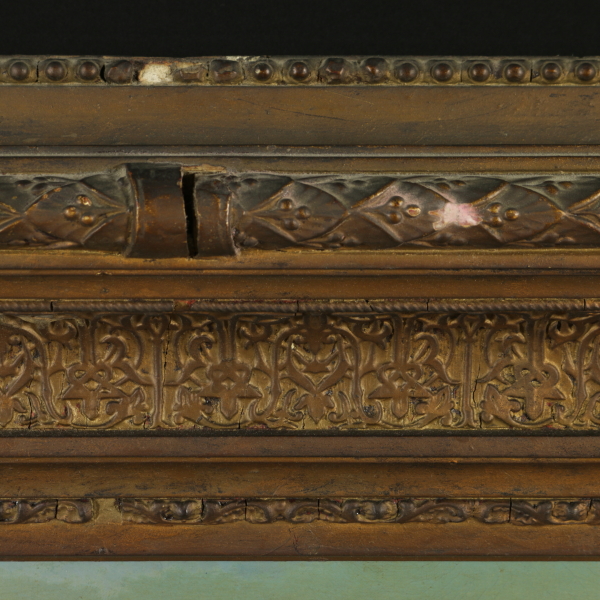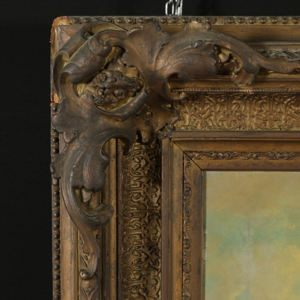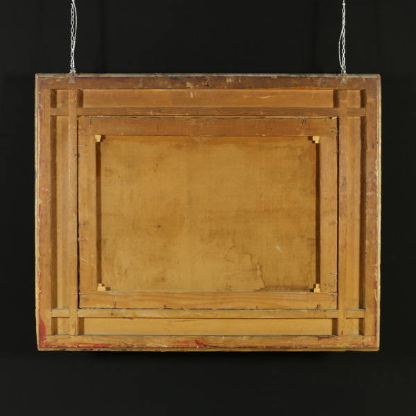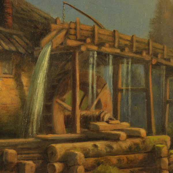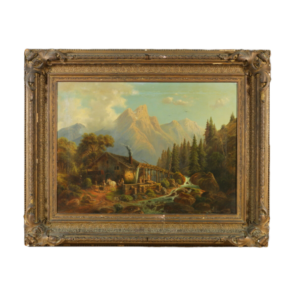 Olio su tela. Nella cornice di un paesaggio di montagna con ruscello, campeggia al centro un suggestivo sistema di conduzione dell'acqua, che affianca la baita davanti alla quale vi sono diverse figure riprese in un momento di vita quotidiana. Presentato in cornice coeva.