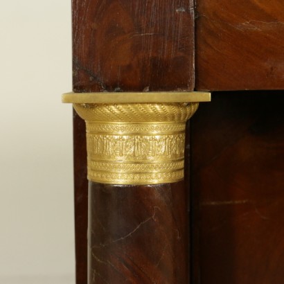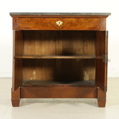 Credenza francese dai montanti con colonne intere con capitelli in ottone e piedi a plinto. Cassetto nella fascia e coppia di ante. Cassetto sottopiano apribile a ribalta cela inserto in pelle e tre cassetti. Piano in marmo. Fregi in bronzo dorato.