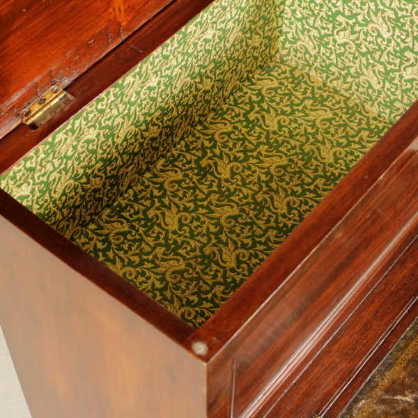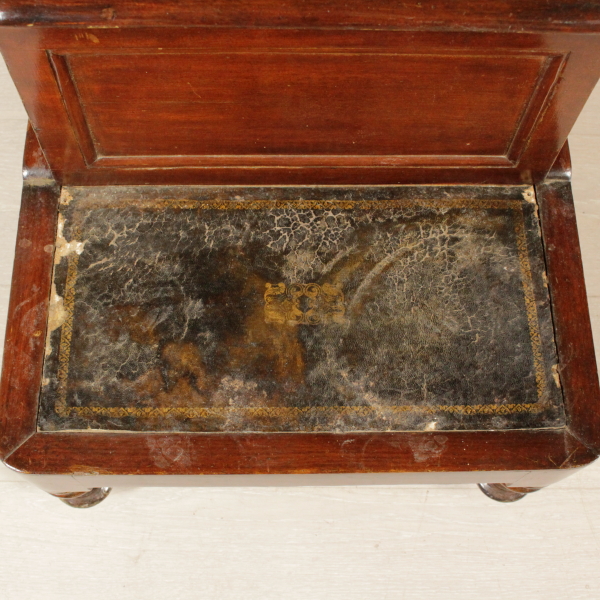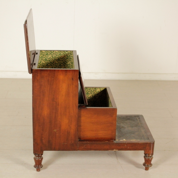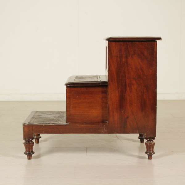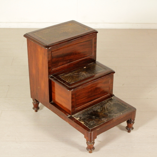 Scala da libreria retta da piedi torniti, presenta tre gradini di cui due apribili. Inserti in pelle decorata.