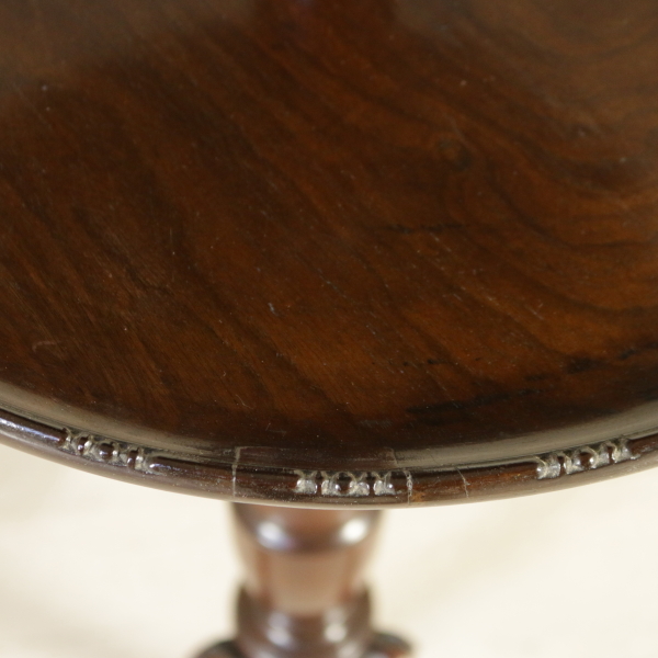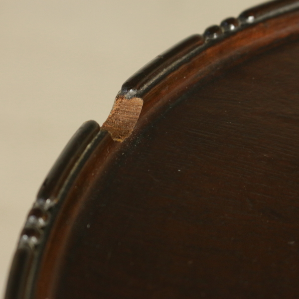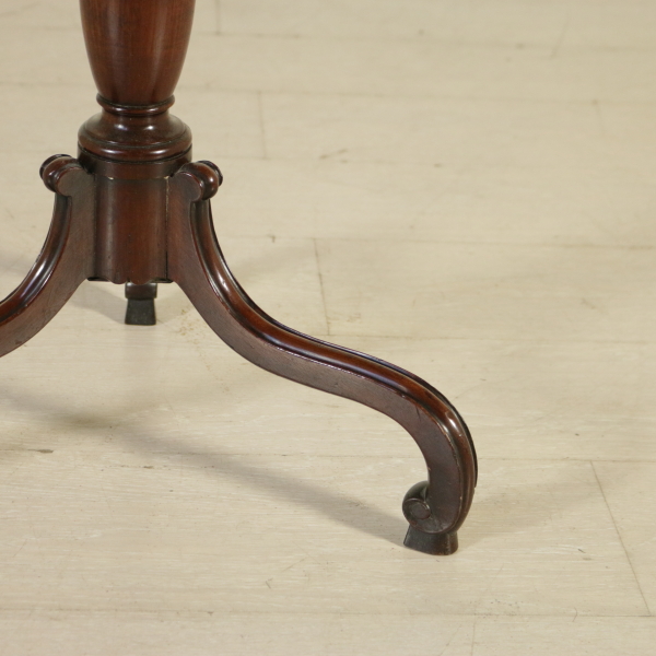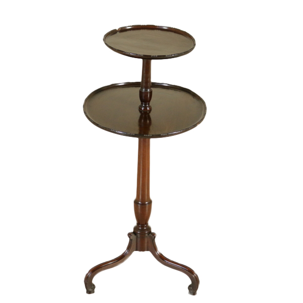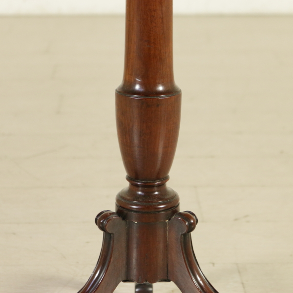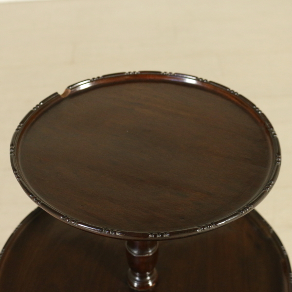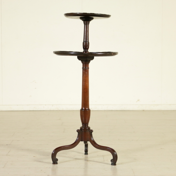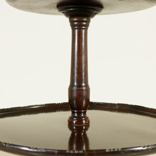 Balaustro tornito in mogano terminante con tre piedi mossi e intagliati. Coppia di piani tondi in noce dal bordo intagliato.