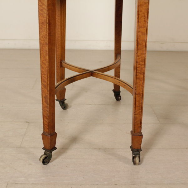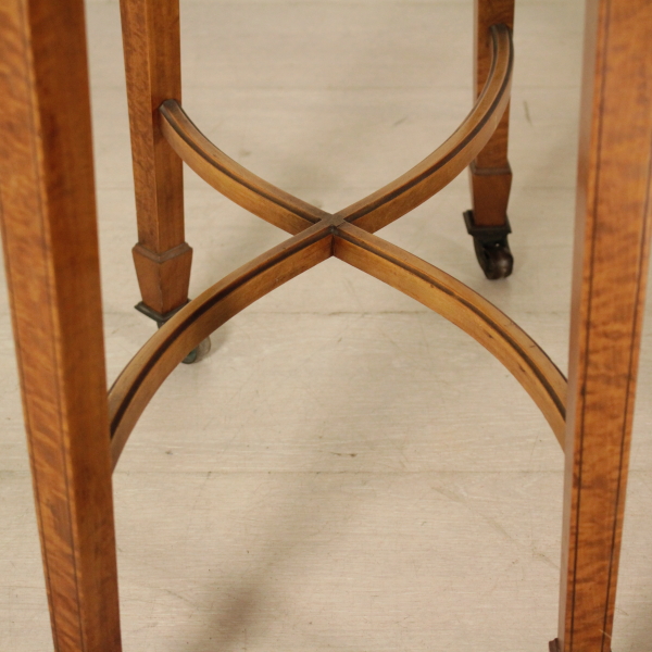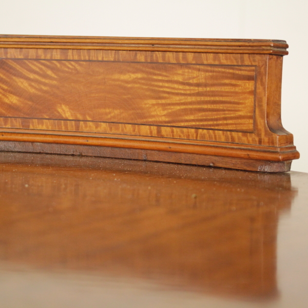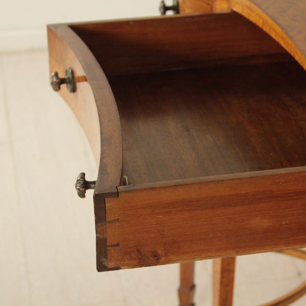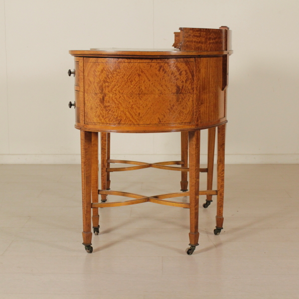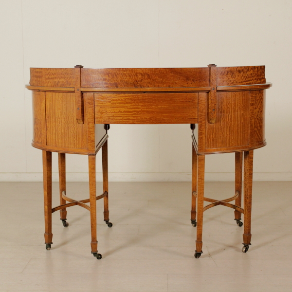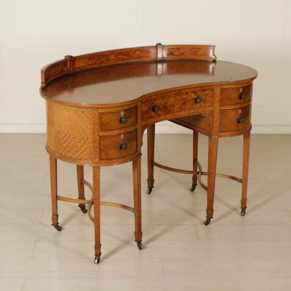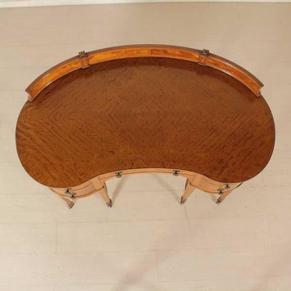 Scrivania a fagiolo da centro retta da otto gambe raccordate a crociere. Presenta cinque cassetti con cassetti con impugnature in bronzo. Piano con alzatina, filettature in palissandro.