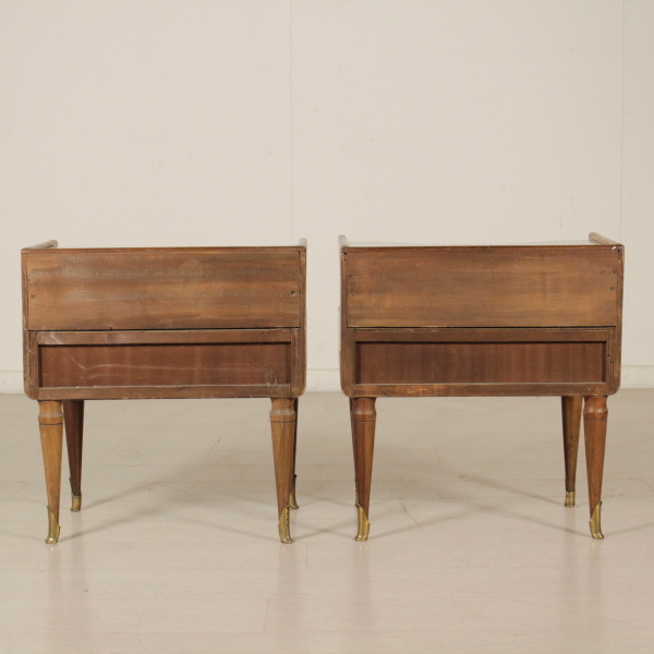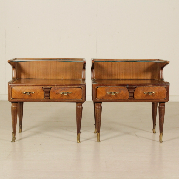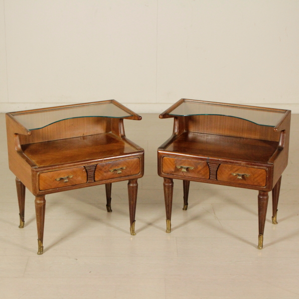 Coppia di comodini; legno impiallacciato mogano, vetro, ottone.