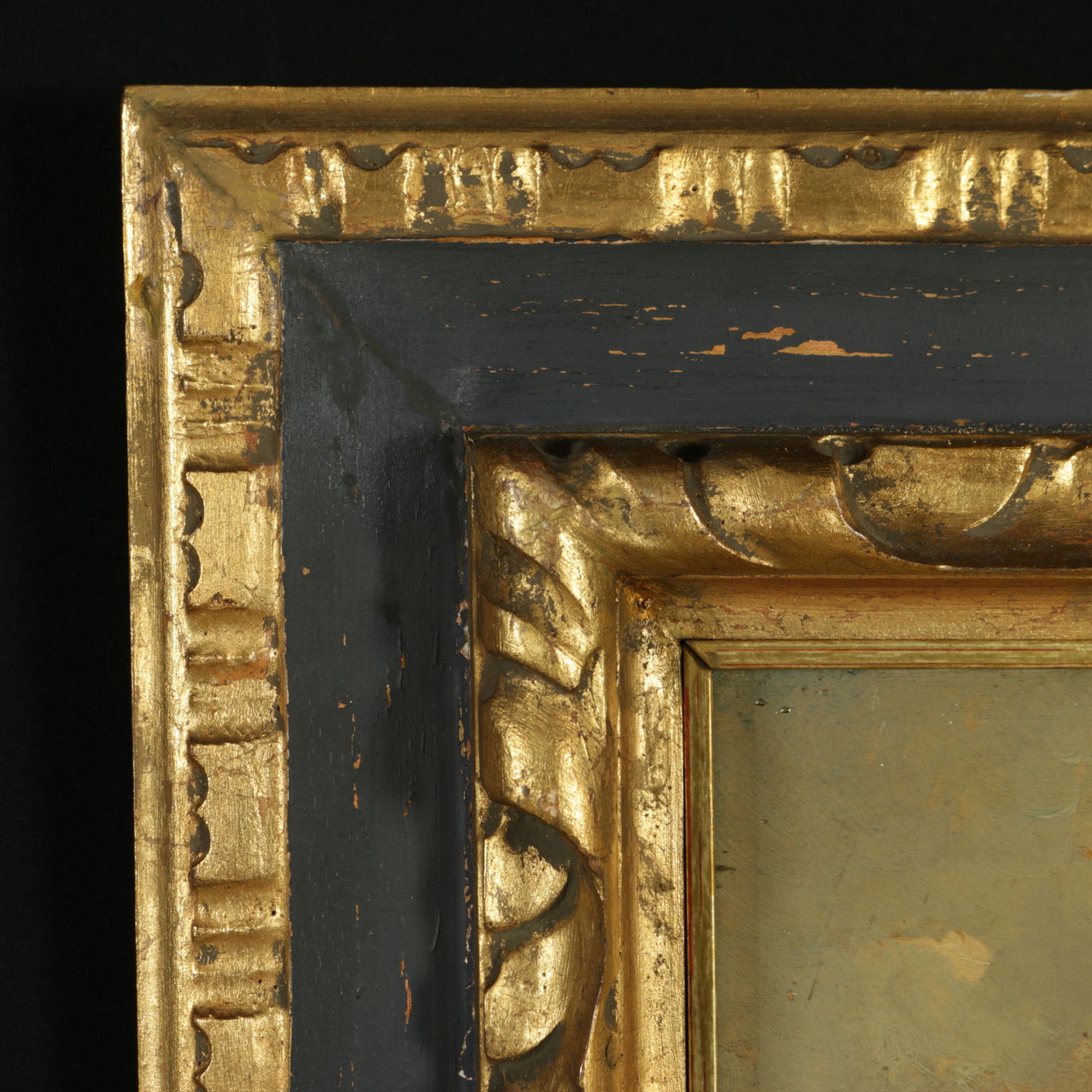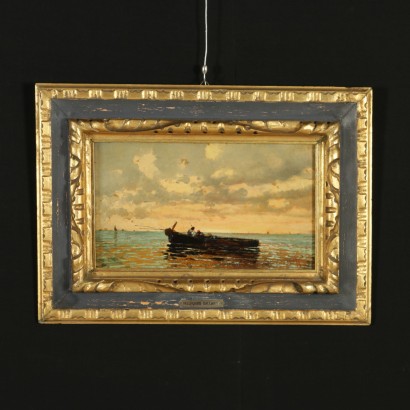 Olio su tavola. Firmato in basso a destra. Suggestiva veduta marina, con la barca ferma nella bonaccia e i pescatori seduti che aspettano un segnale dalle lenze calate. In bella cornice coeva.
