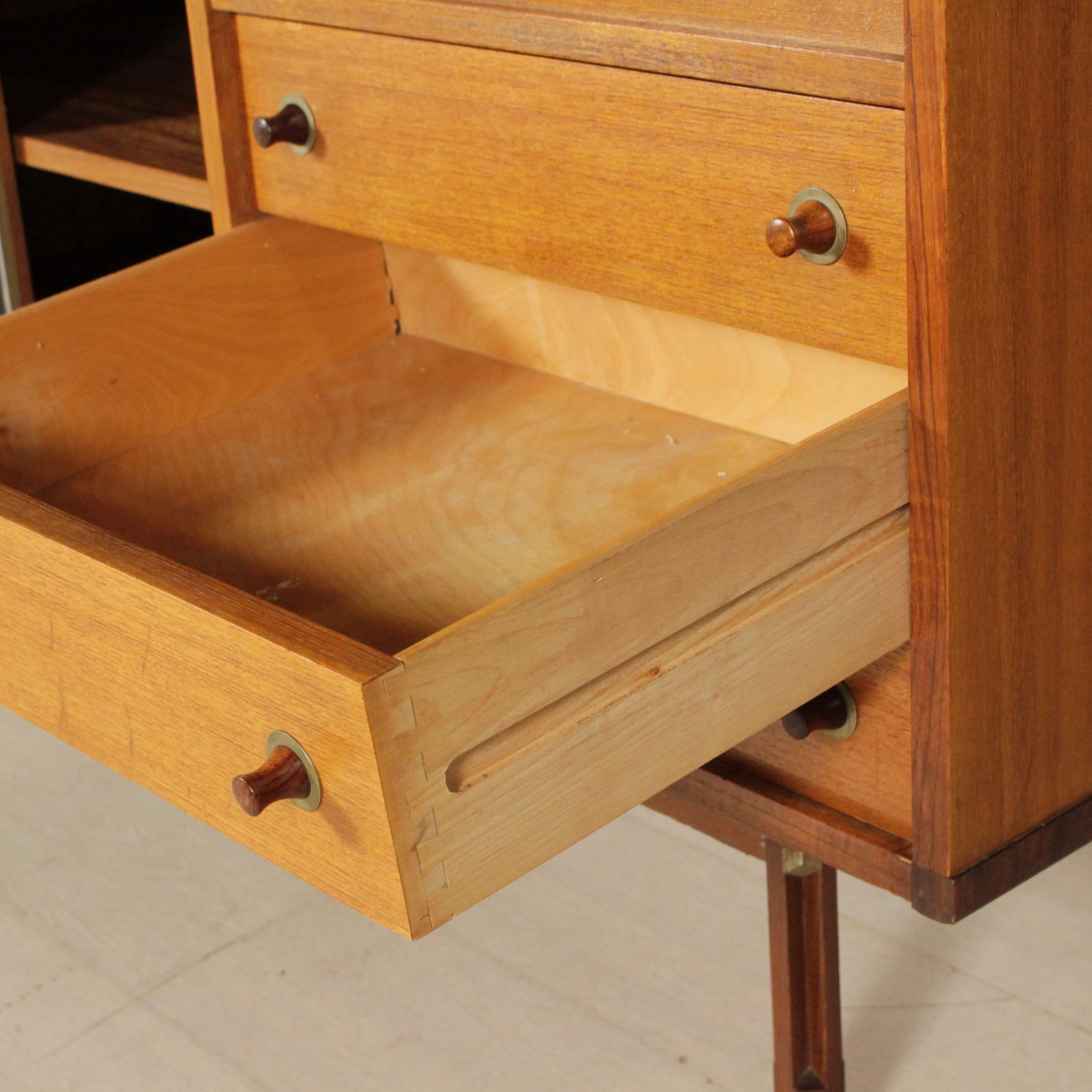 Credenza anni 60 con ante scorrevoli e anta a ribalta; legno impiallacciato teak, finta pelle, alluminio e ottone.