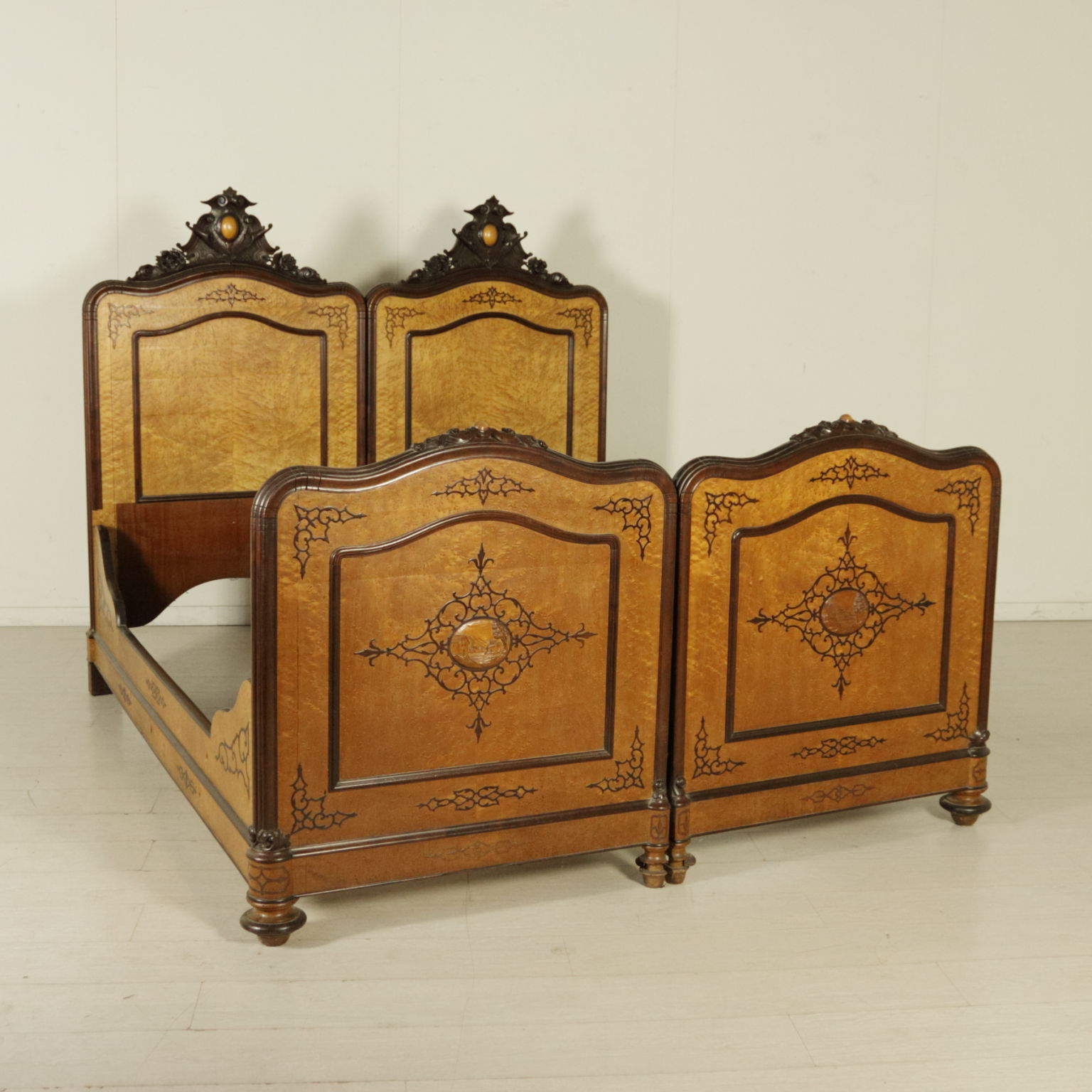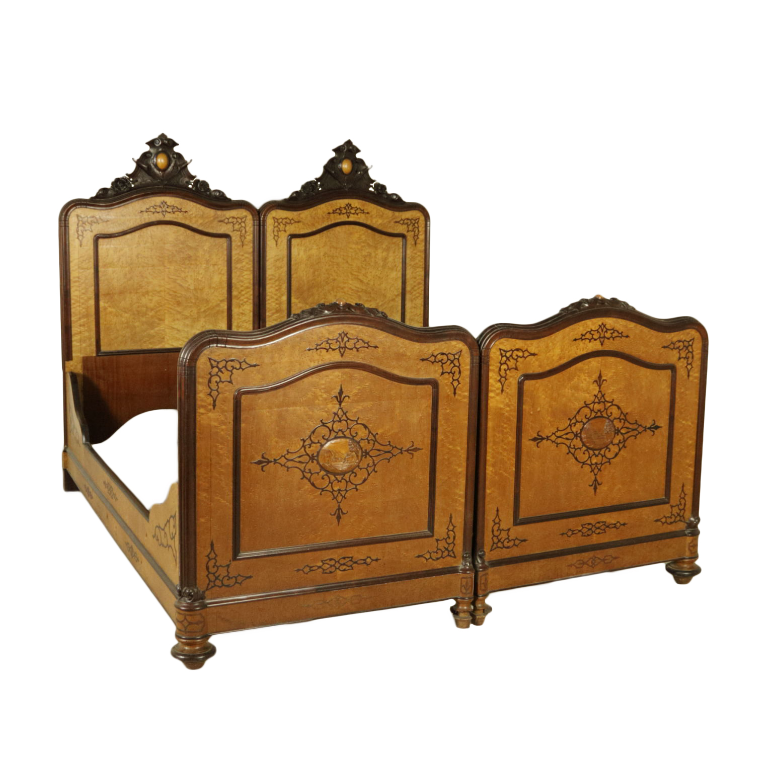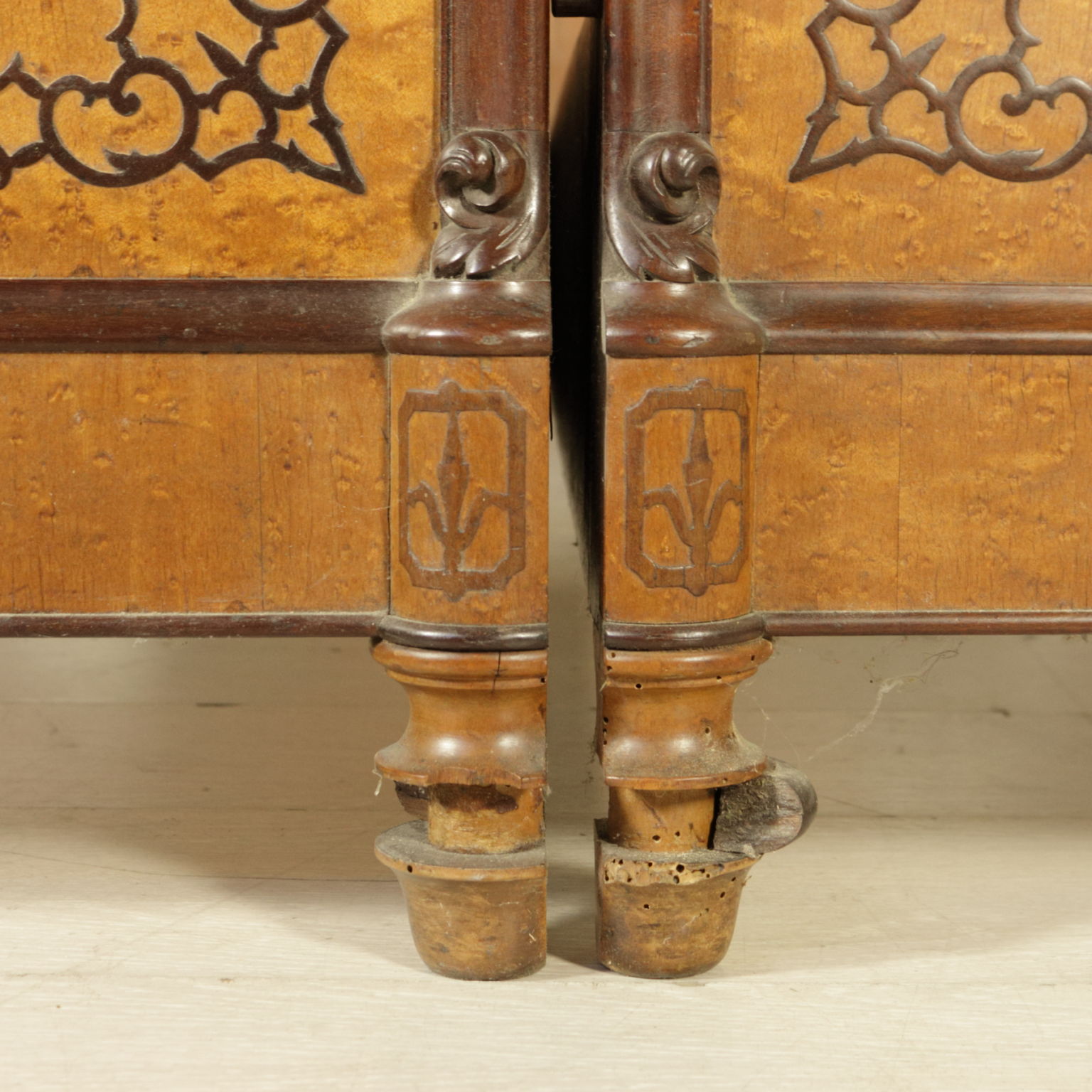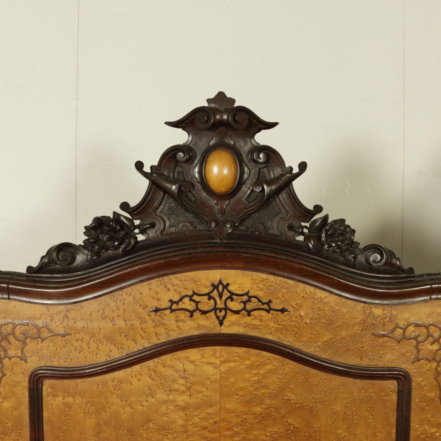 Descrizione Coppia di letti Luigi Filippo, produzione italiana della metà del XIX Secolo. Pannelli in radica di acero con cornici e fregi. Cimasa riccamente intagliata con cameo in acero.