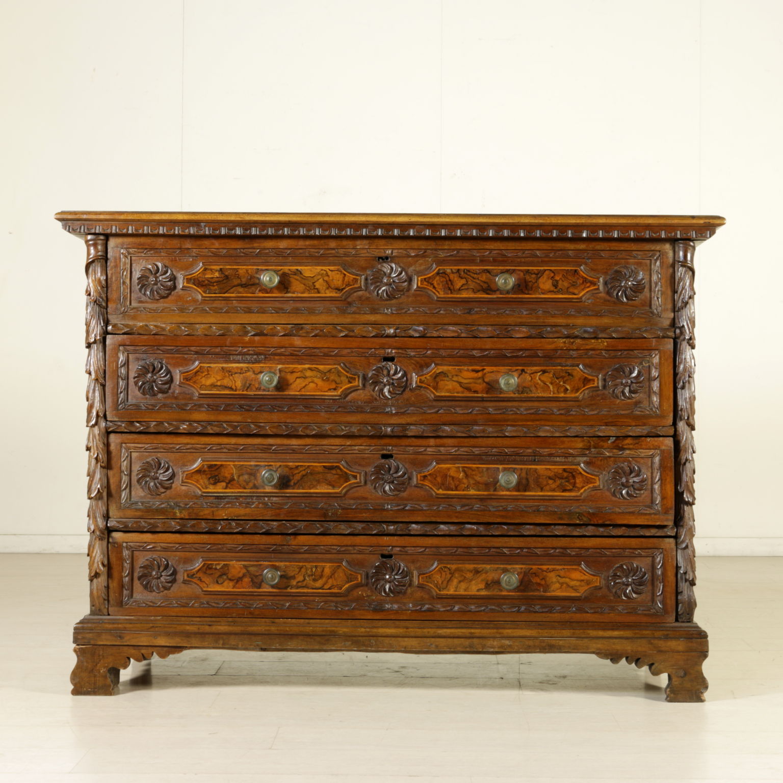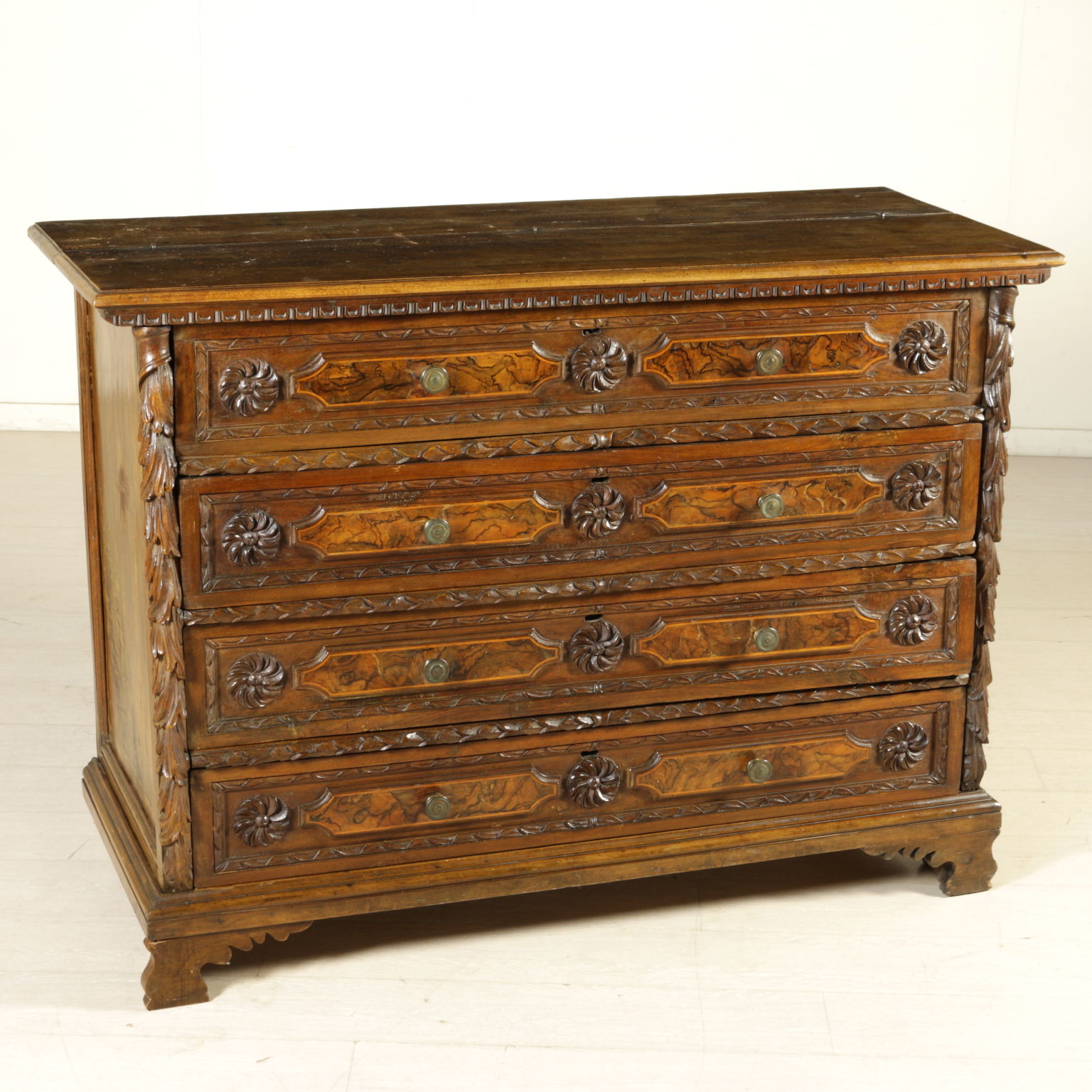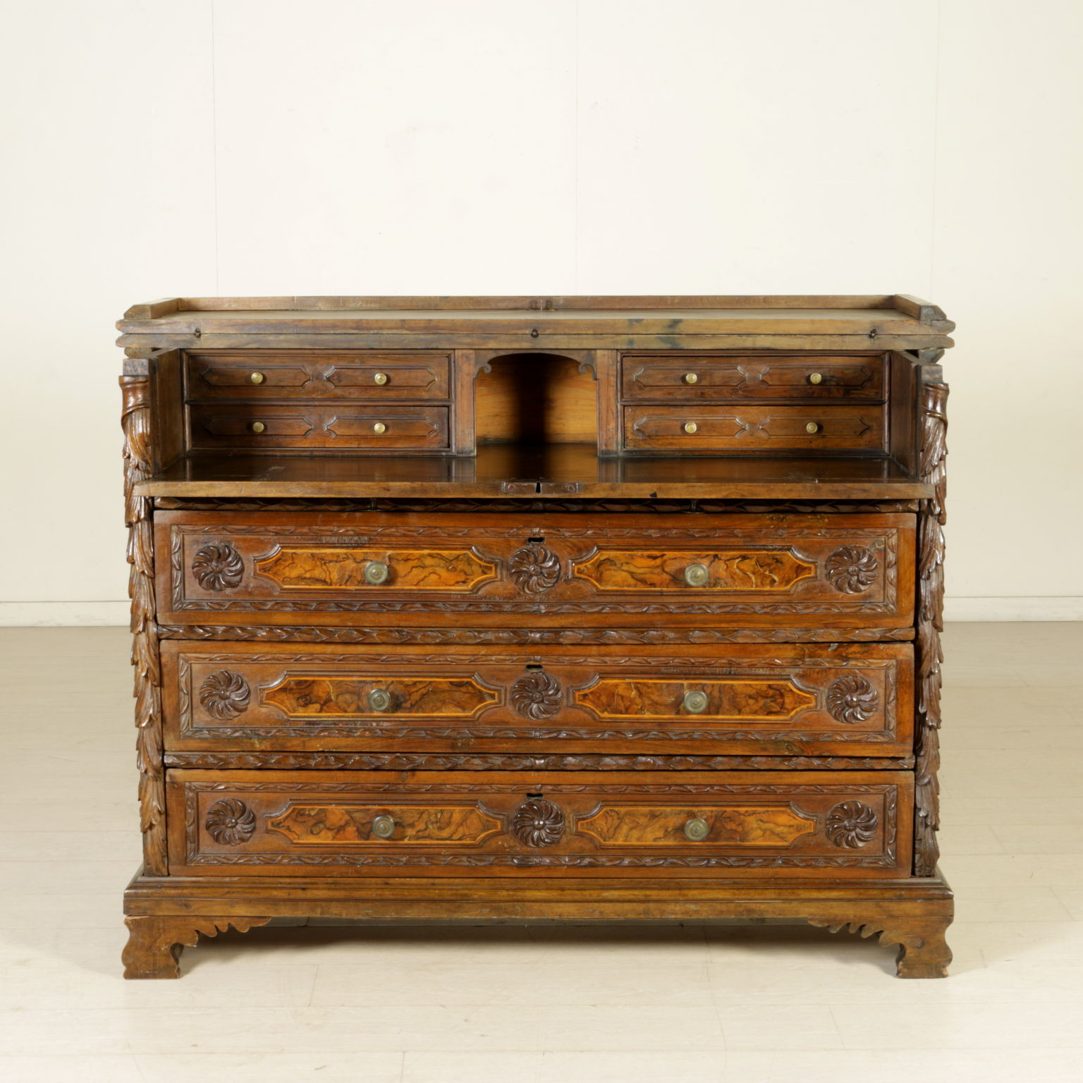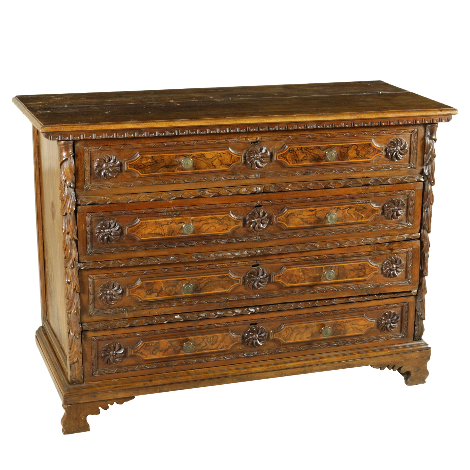 Elegante canterano a quattro cassetti con formelle lastronate in radica di noce. Il primo cassetto presenta fronte apribile a ribalta, che cela quattro cassetti e vano. Fronte riccamente intagliato con motivi fogliacei, filettature e piedi a mensola.
