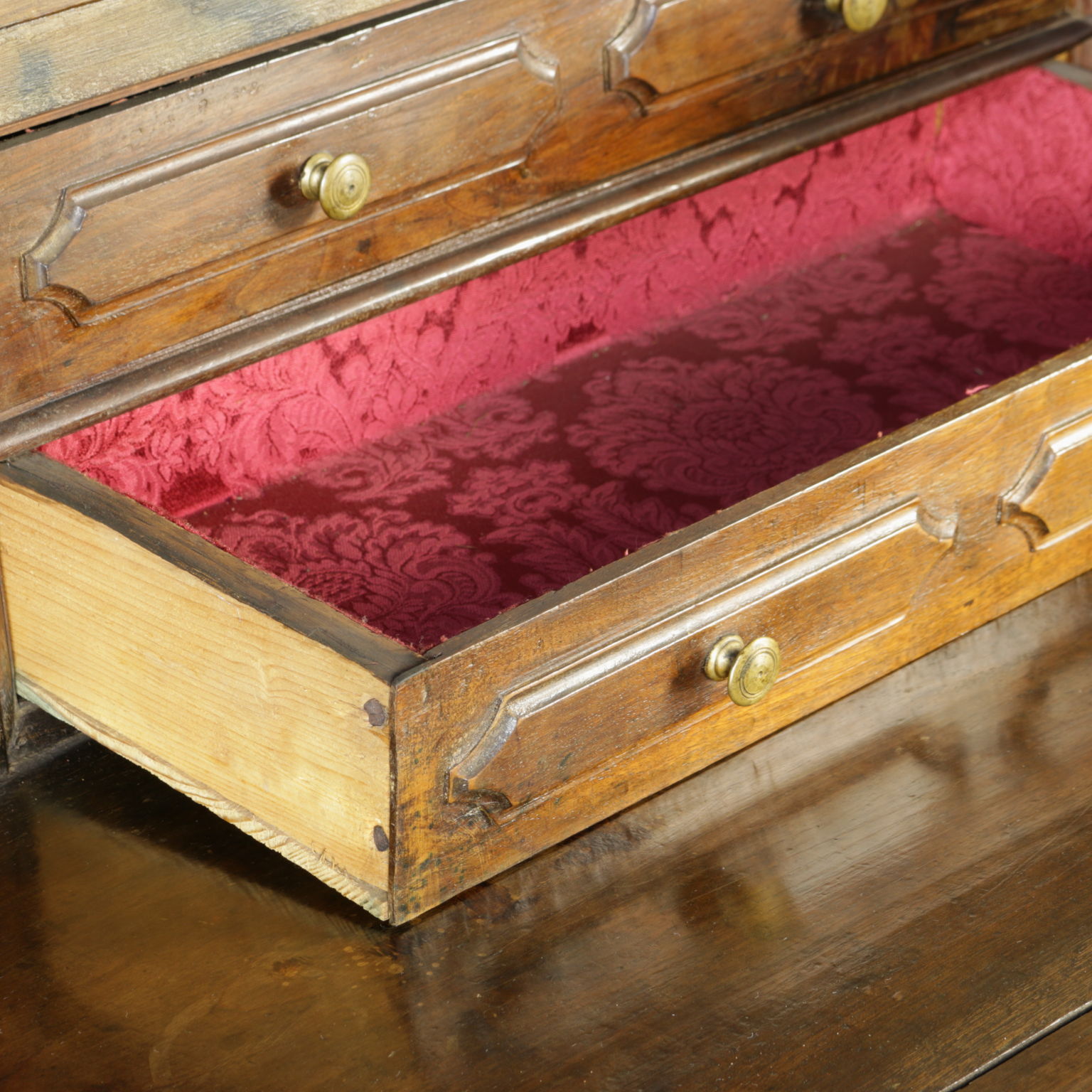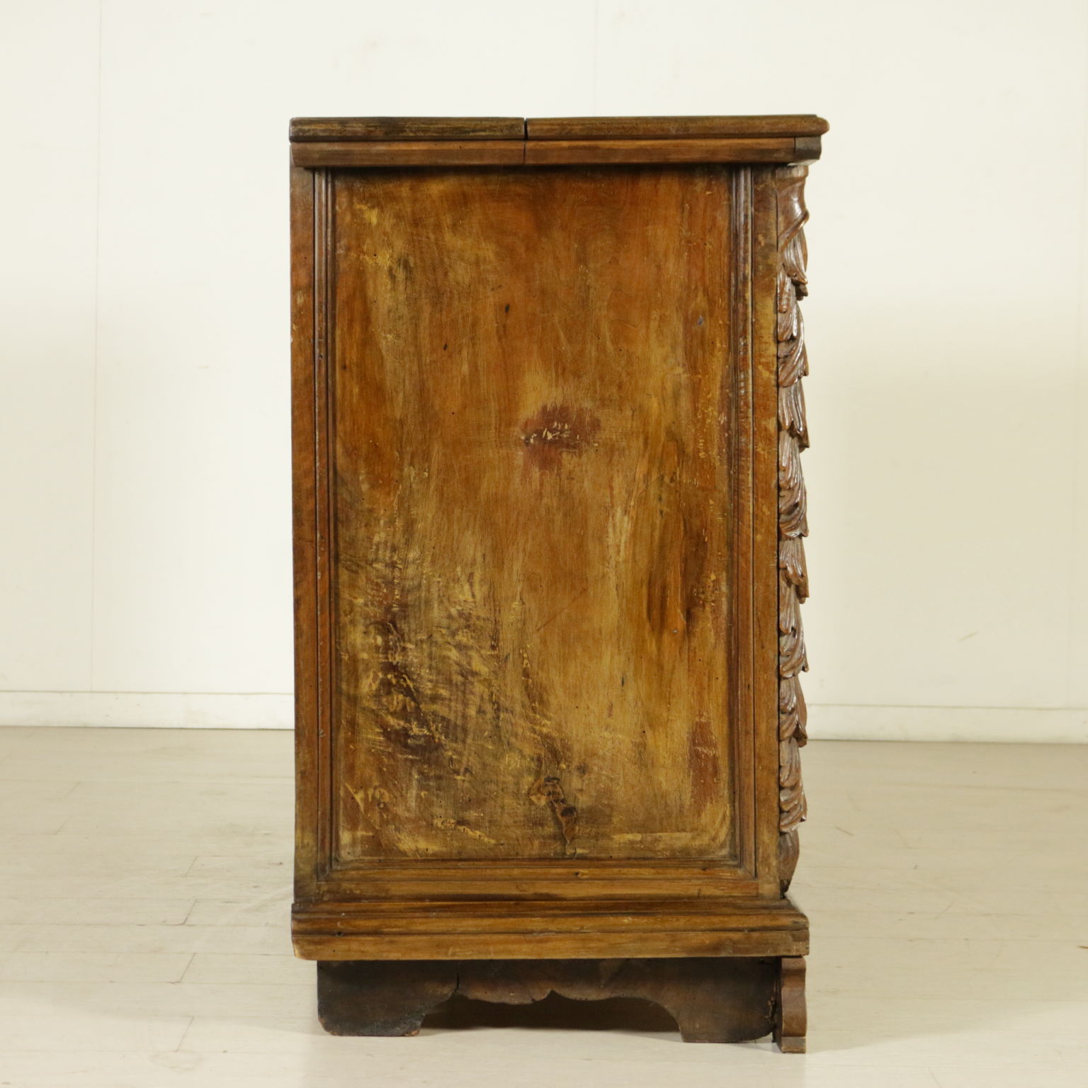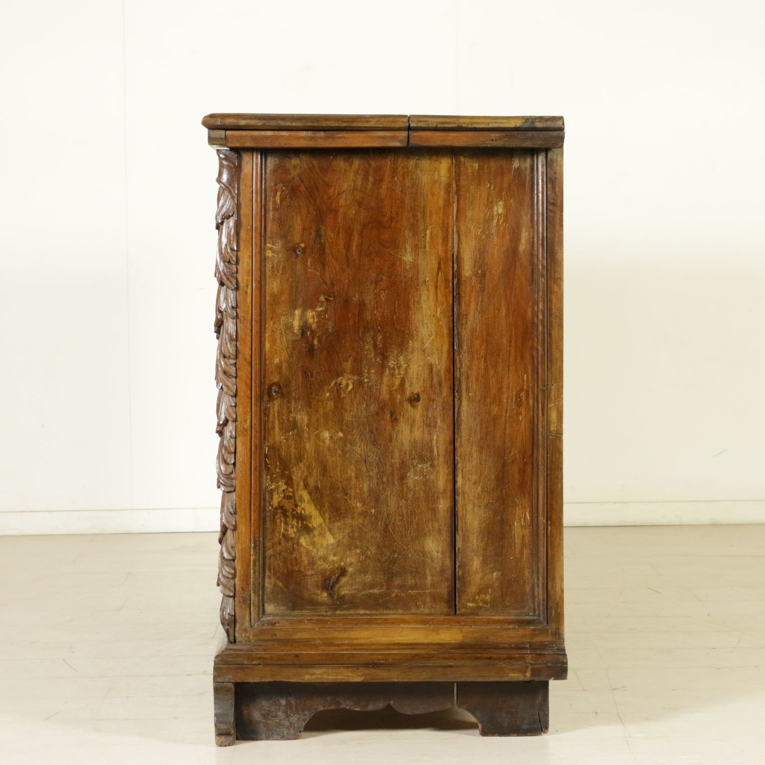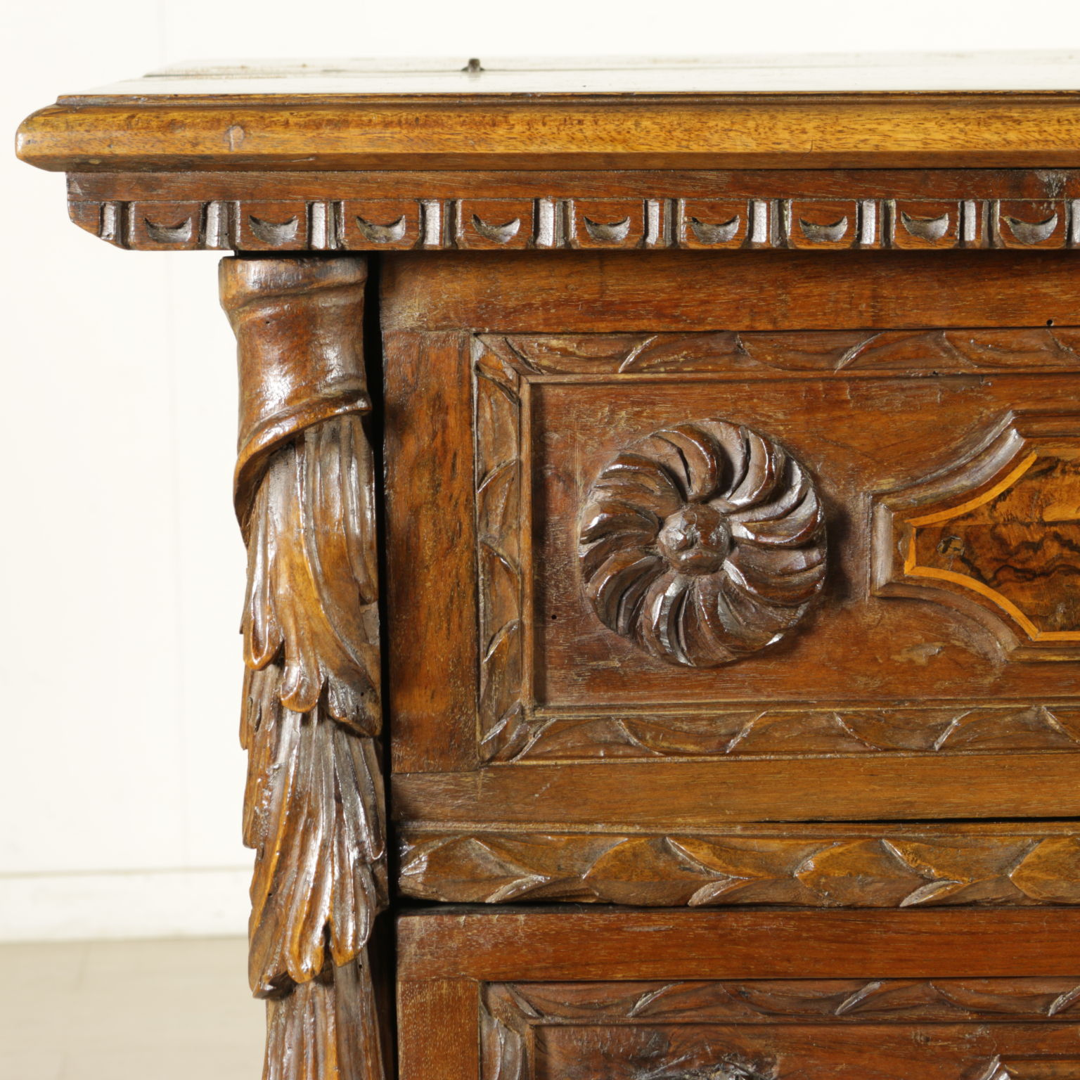Elegante canterano a quattro cassetti con formelle lastronate in radica di noce. Il primo cassetto presenta fronte apribile a ribalta, che cela quattro cassetti e vano. Fronte riccamente intagliato con motivi fogliacei, filettature e piedi a mensola.