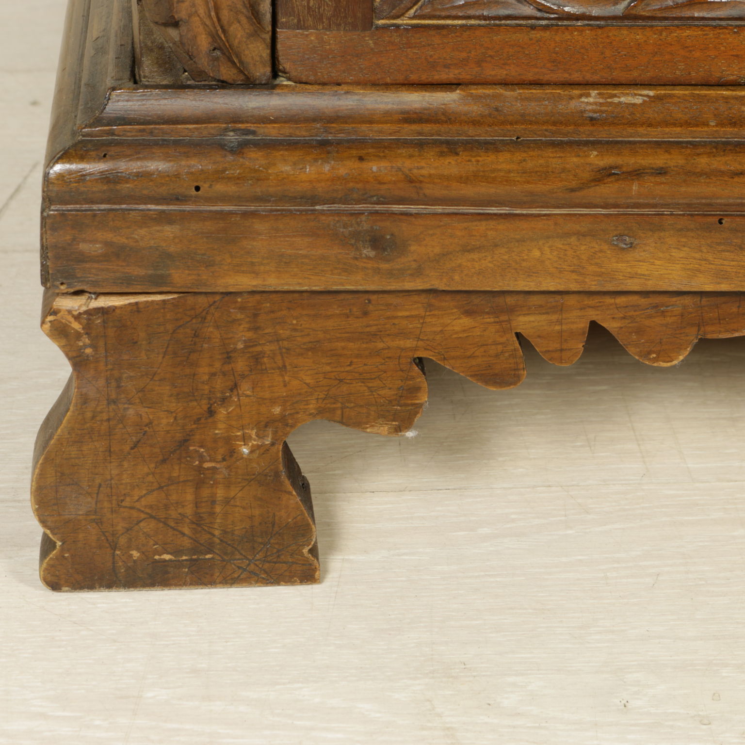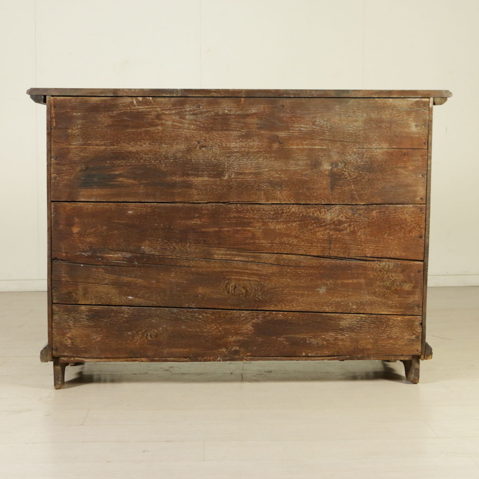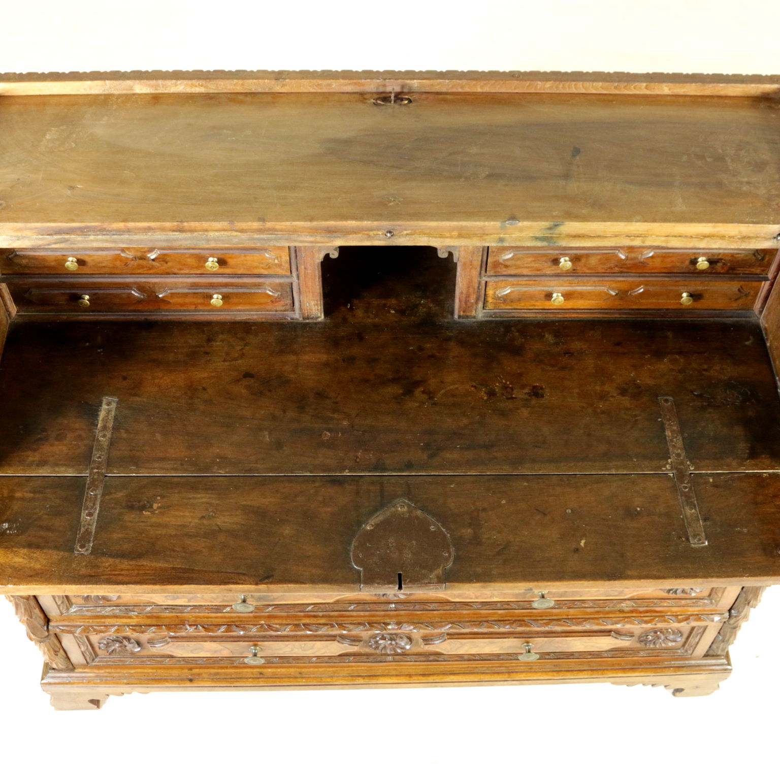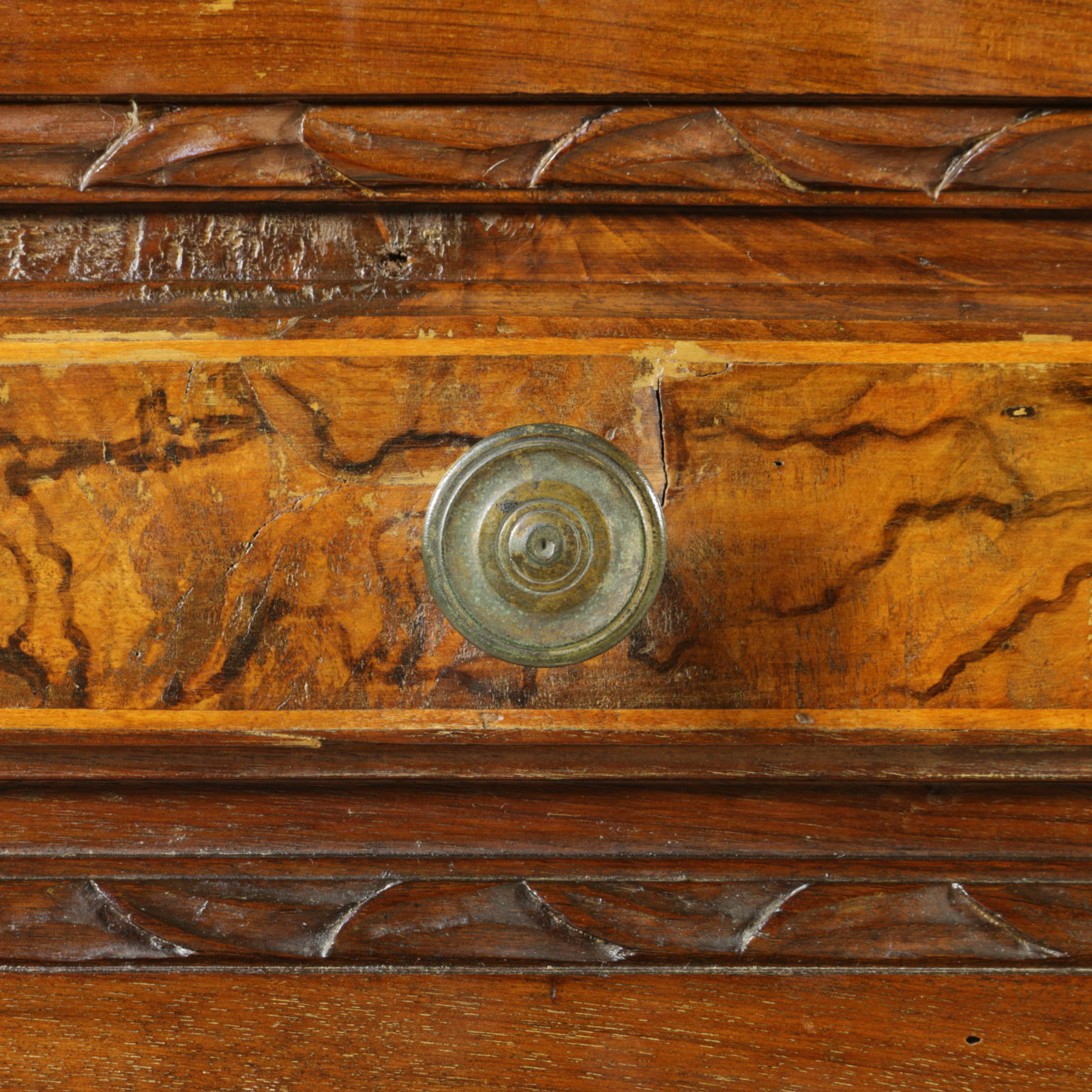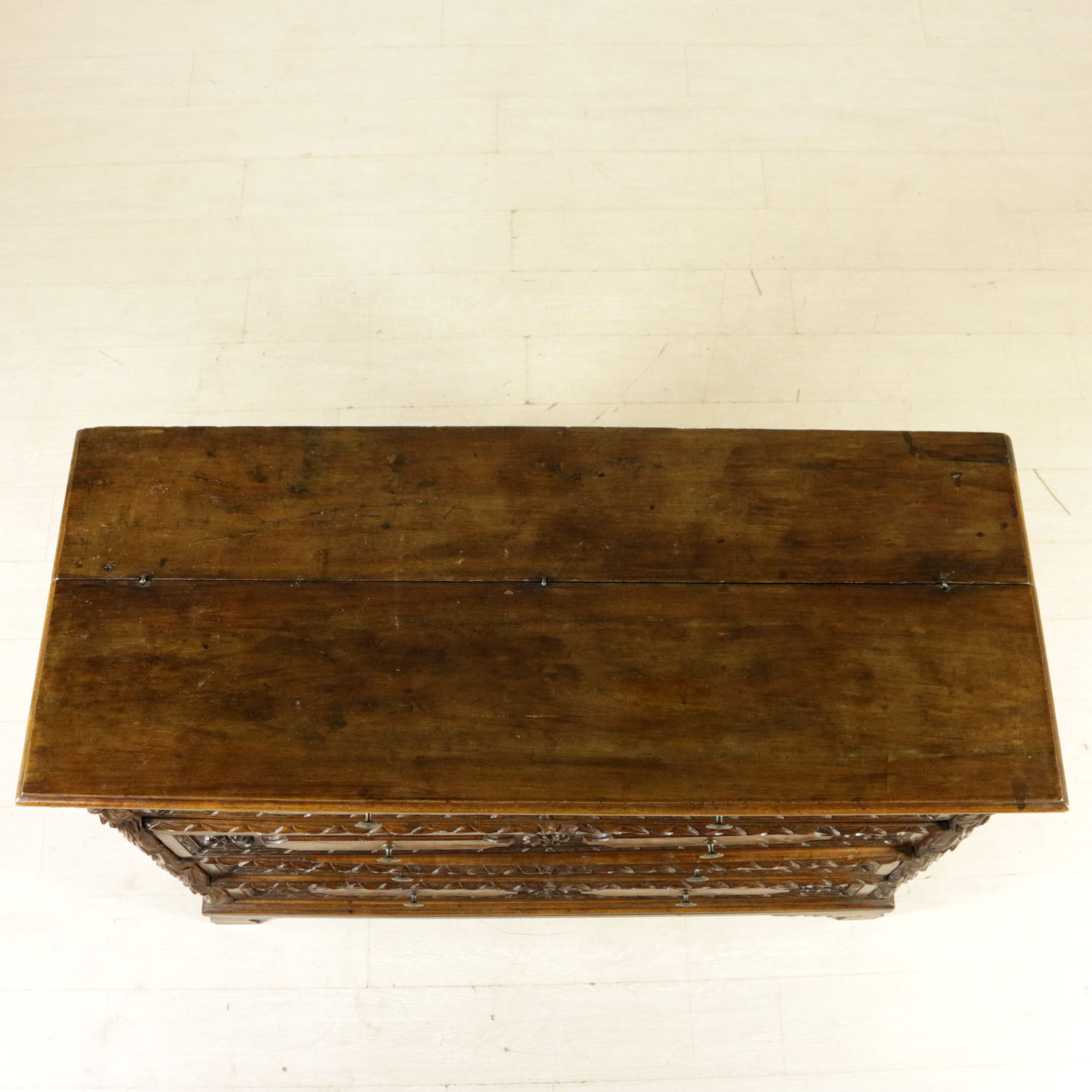 Elegante canterano a quattro cassetti con formelle lastronate in radica di noce. Il primo cassetto presenta fronte apribile a ribalta, che cela quattro cassetti e vano. Fronte riccamente intagliato con motivi fogliacei, filettature e piedi a mensola.