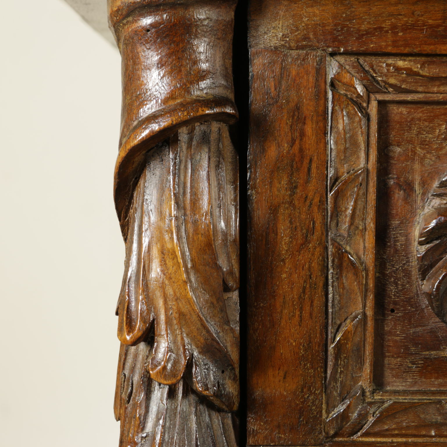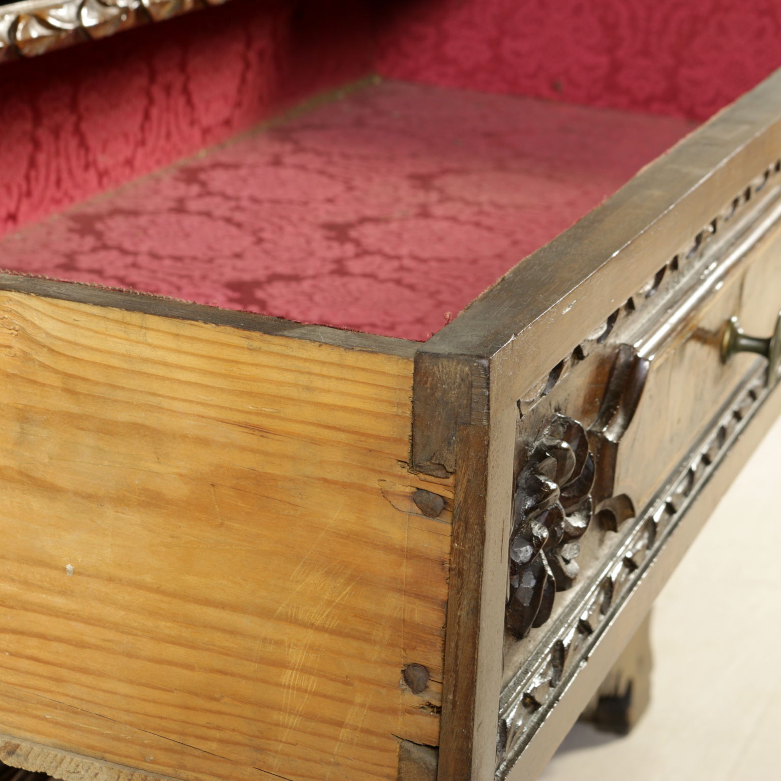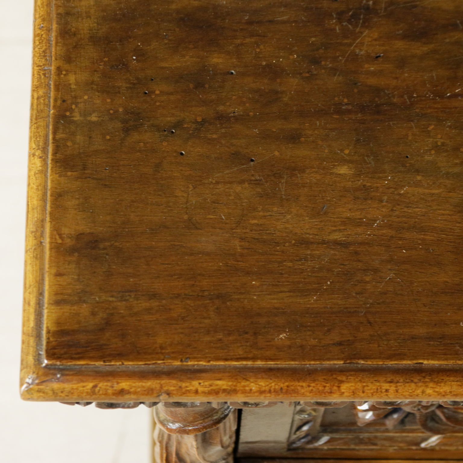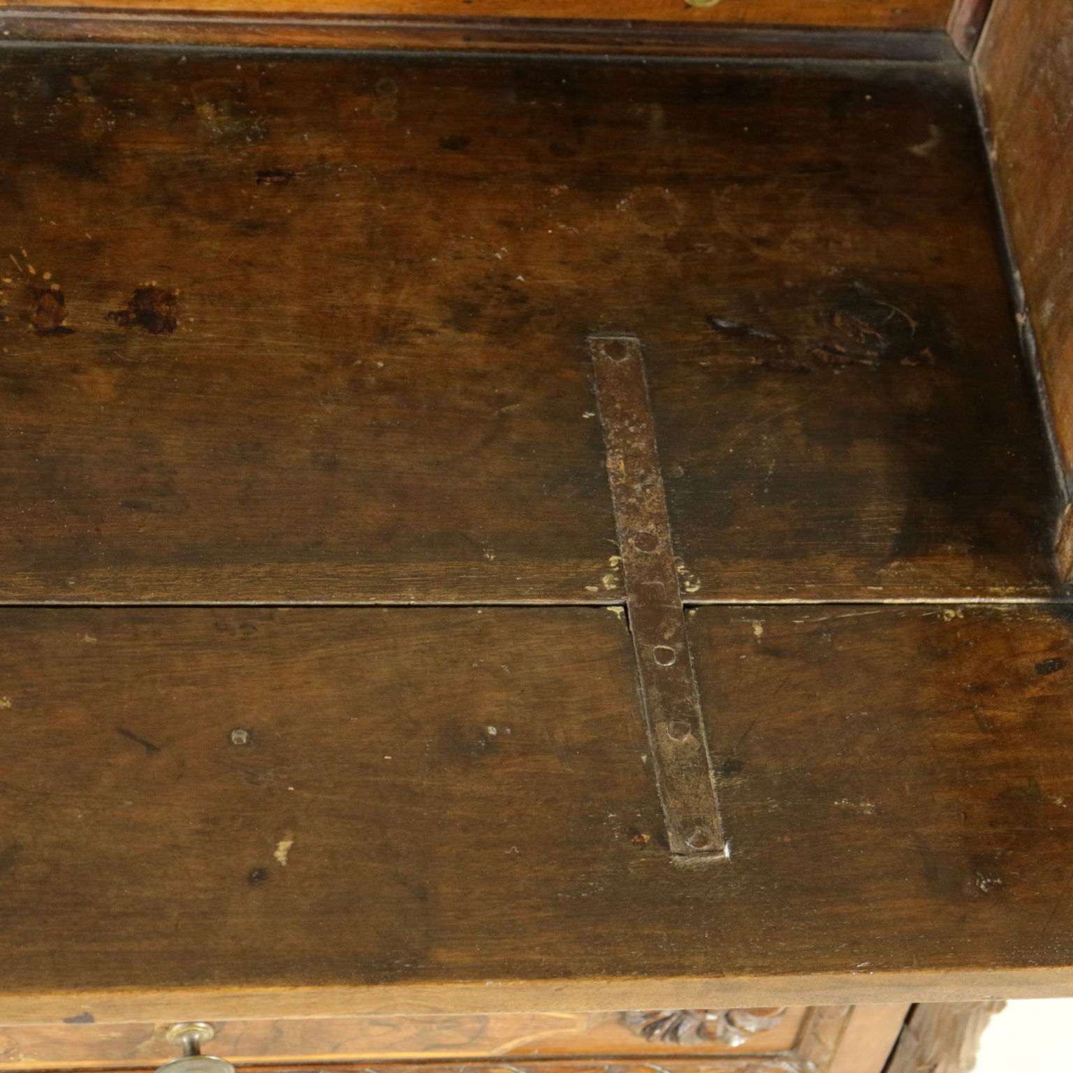 Elegante canterano a quattro cassetti con formelle lastronate in radica di noce. Il primo cassetto presenta fronte apribile a ribalta, che cela quattro cassetti e vano. Fronte riccamente intagliato con motivi fogliacei, filettature e piedi a mensola.