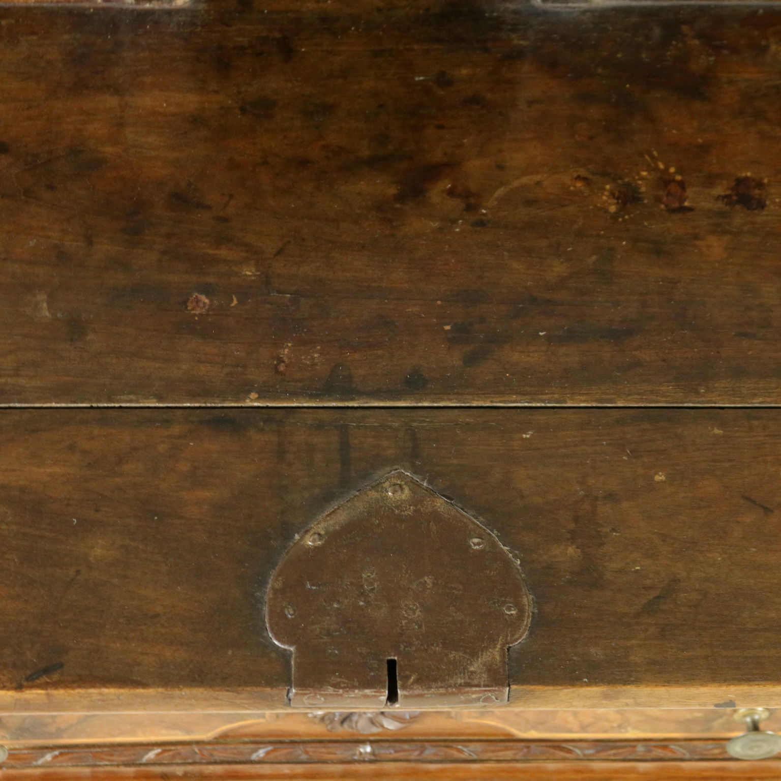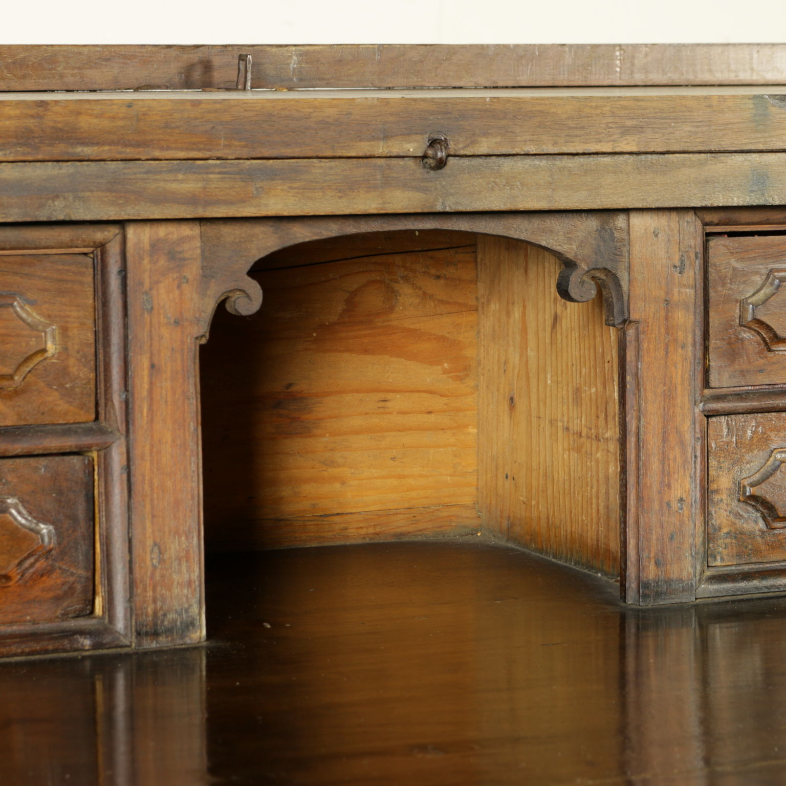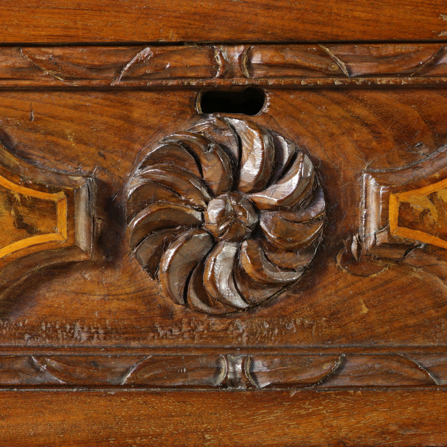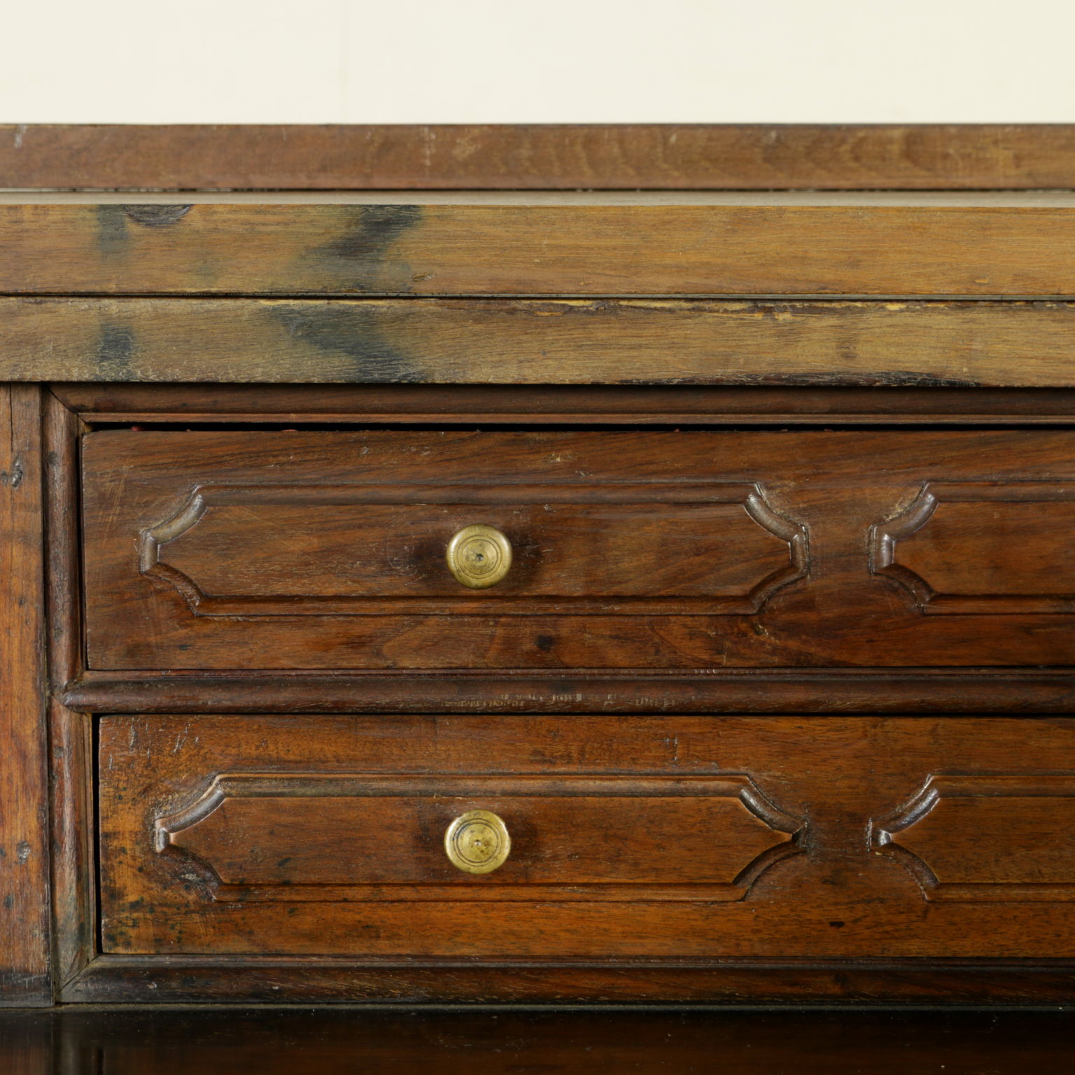 Elegante canterano a quattro cassetti con formelle lastronate in radica di noce. Il primo cassetto presenta fronte apribile a ribalta, che cela quattro cassetti e vano. Fronte riccamente intagliato con motivi fogliacei, filettature e piedi a mensola.