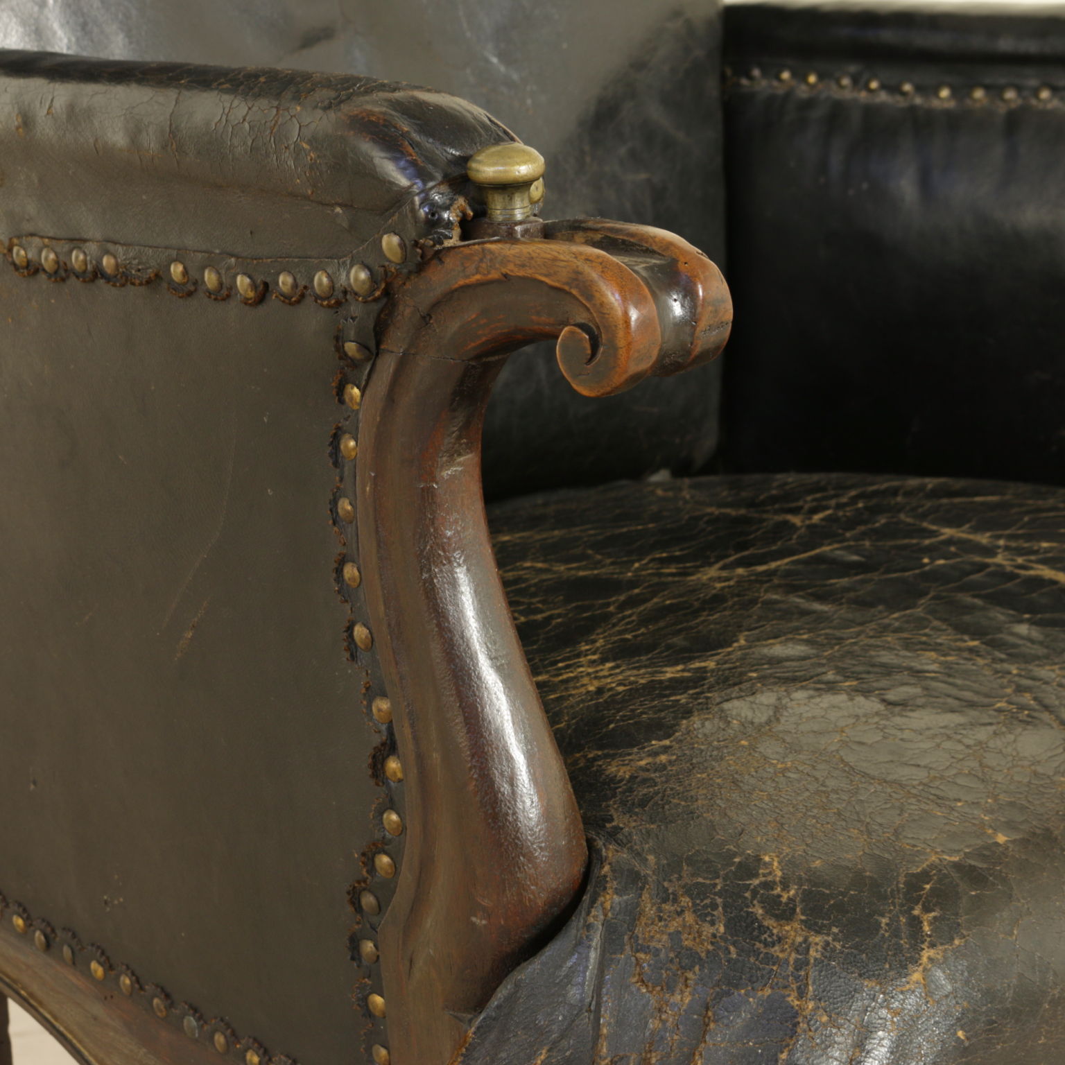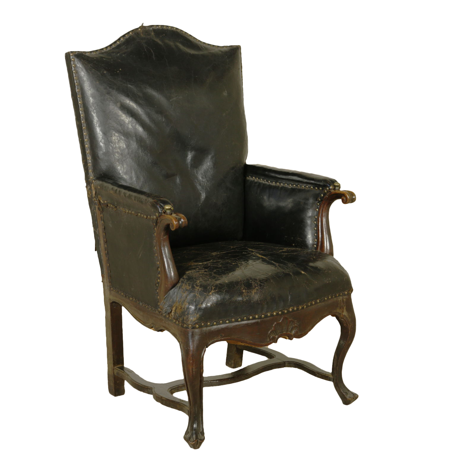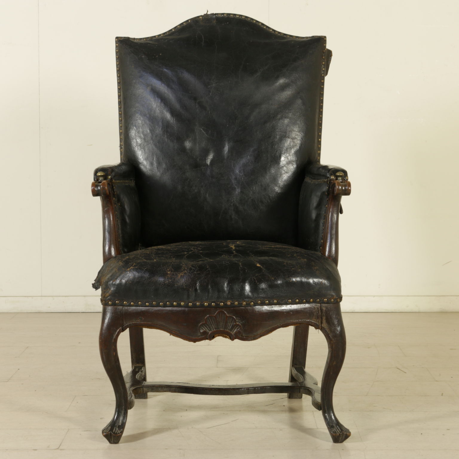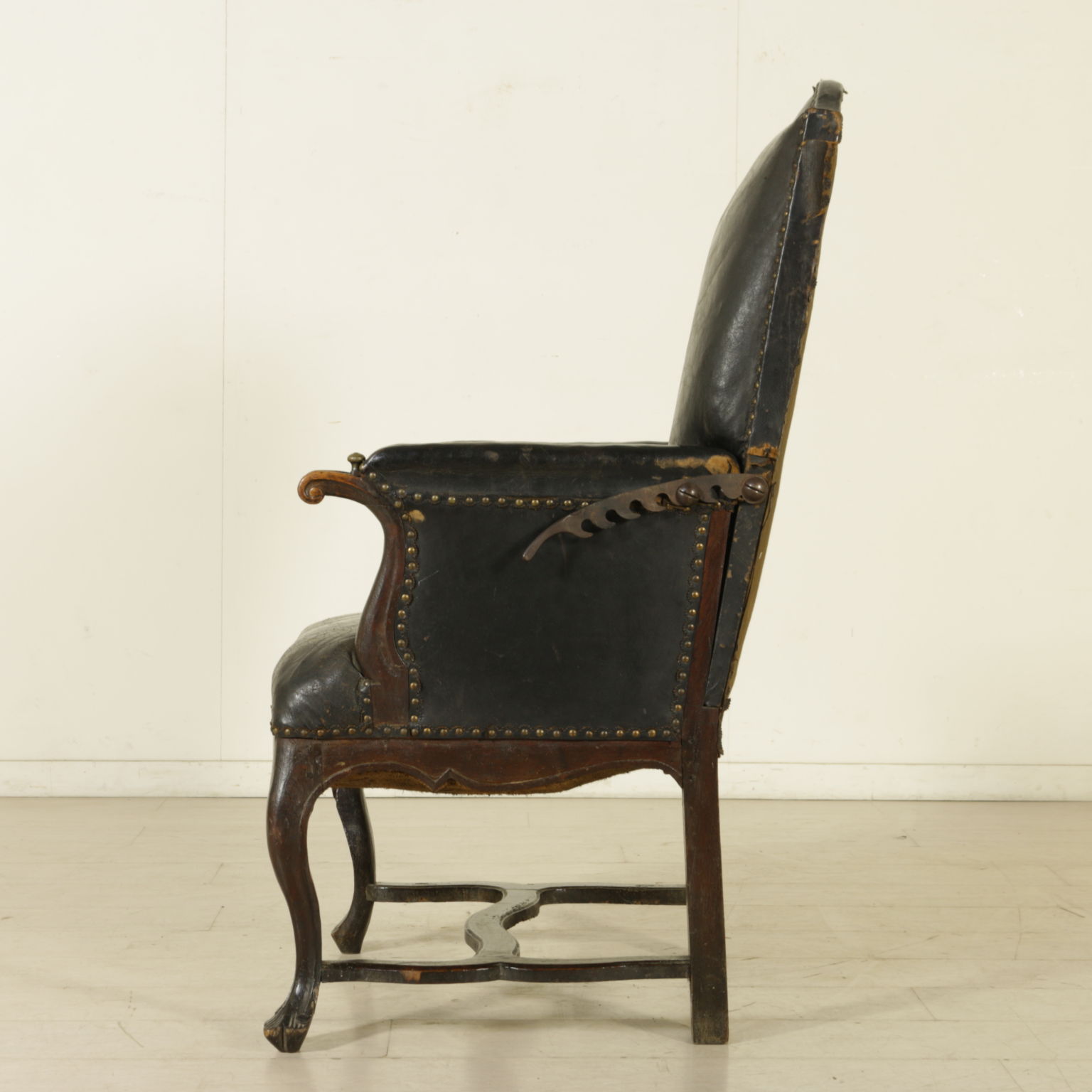 Importante poltrona retta da gambe mosse e intagliate raccordate da crociera sagomata. I braccioli a ricciolo celano stagge in ferro estraibili con pomolo in bronzo con funzione di porta-vassoio. Lo schienale sagomato è reclinabile e regolabile tramite cremagliera laterale di cui una mancante.