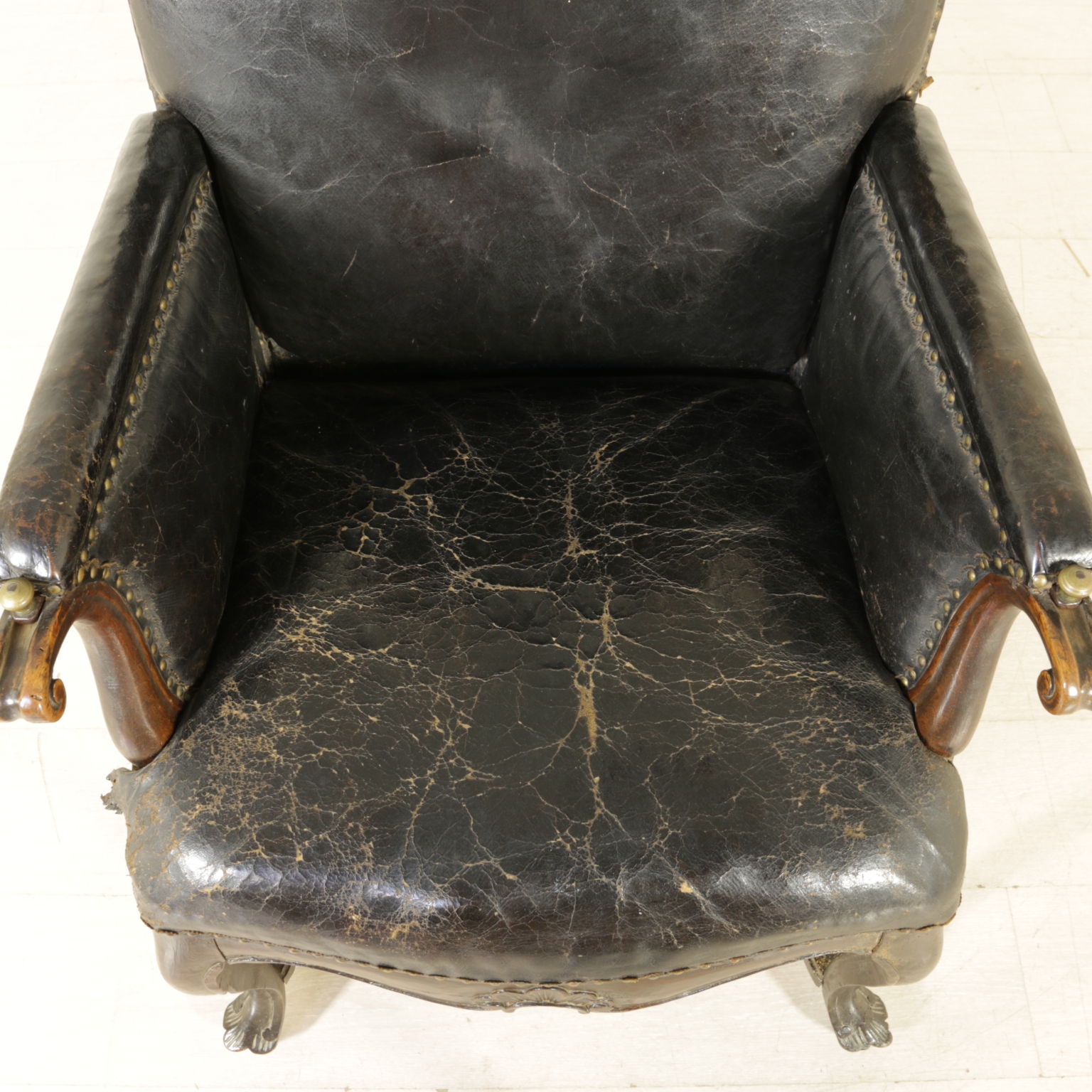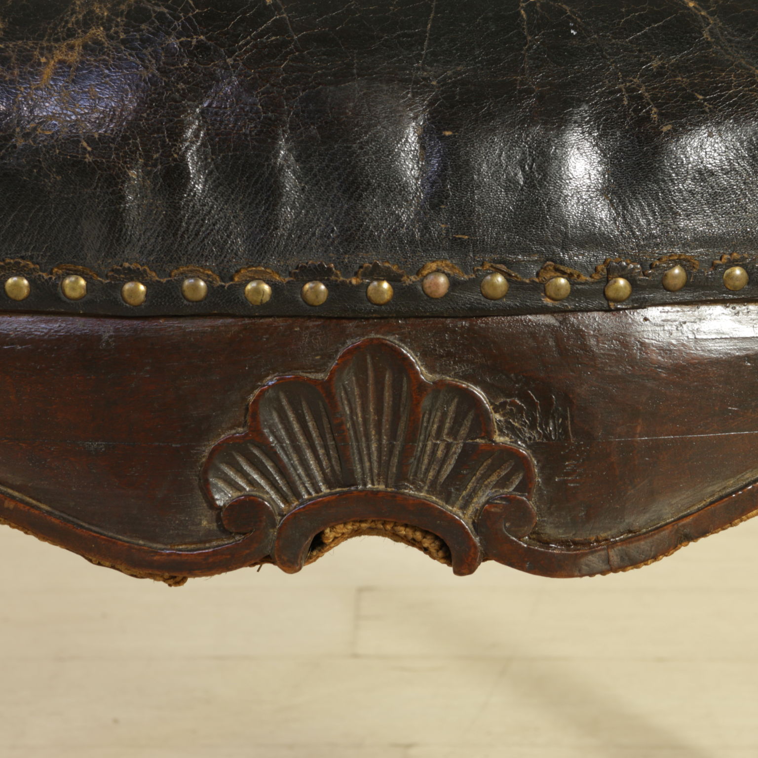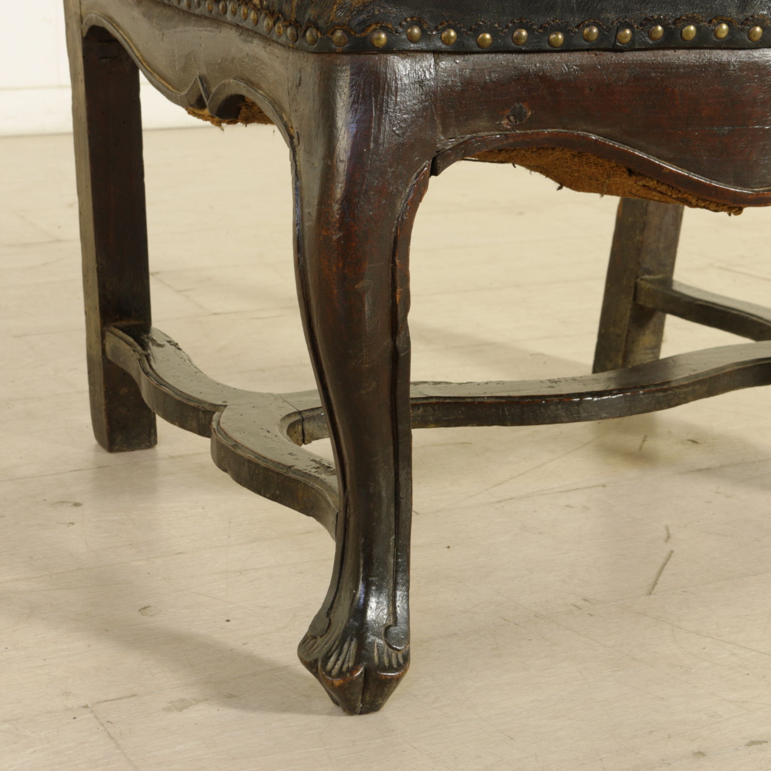 Importante poltrona retta da gambe mosse e intagliate raccordate da crociera sagomata. I braccioli a ricciolo celano stagge in ferro estraibili con pomolo in bronzo con funzione di porta-vassoio. Lo schienale sagomato è reclinabile e regolabile tramite cremagliera laterale di cui una mancante.