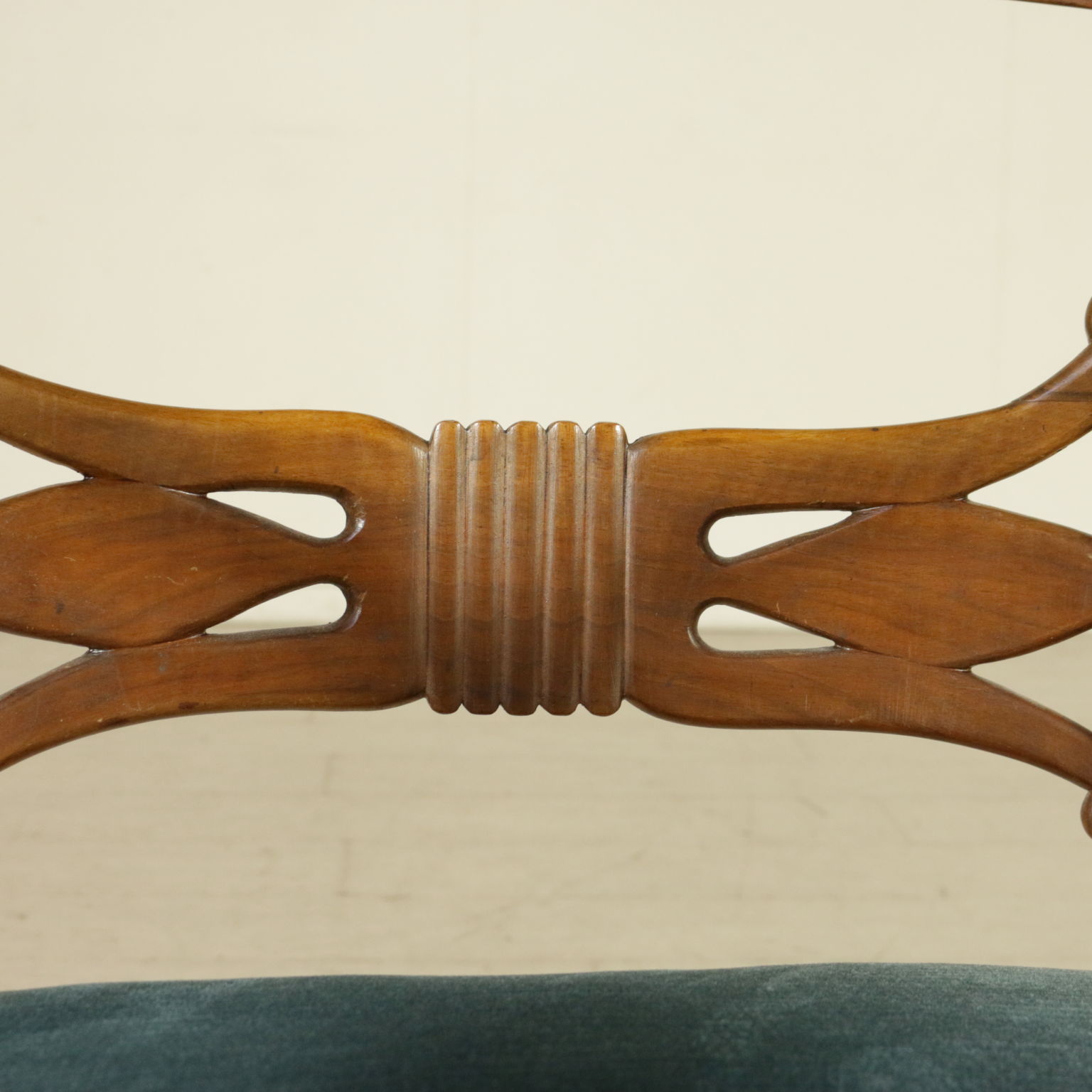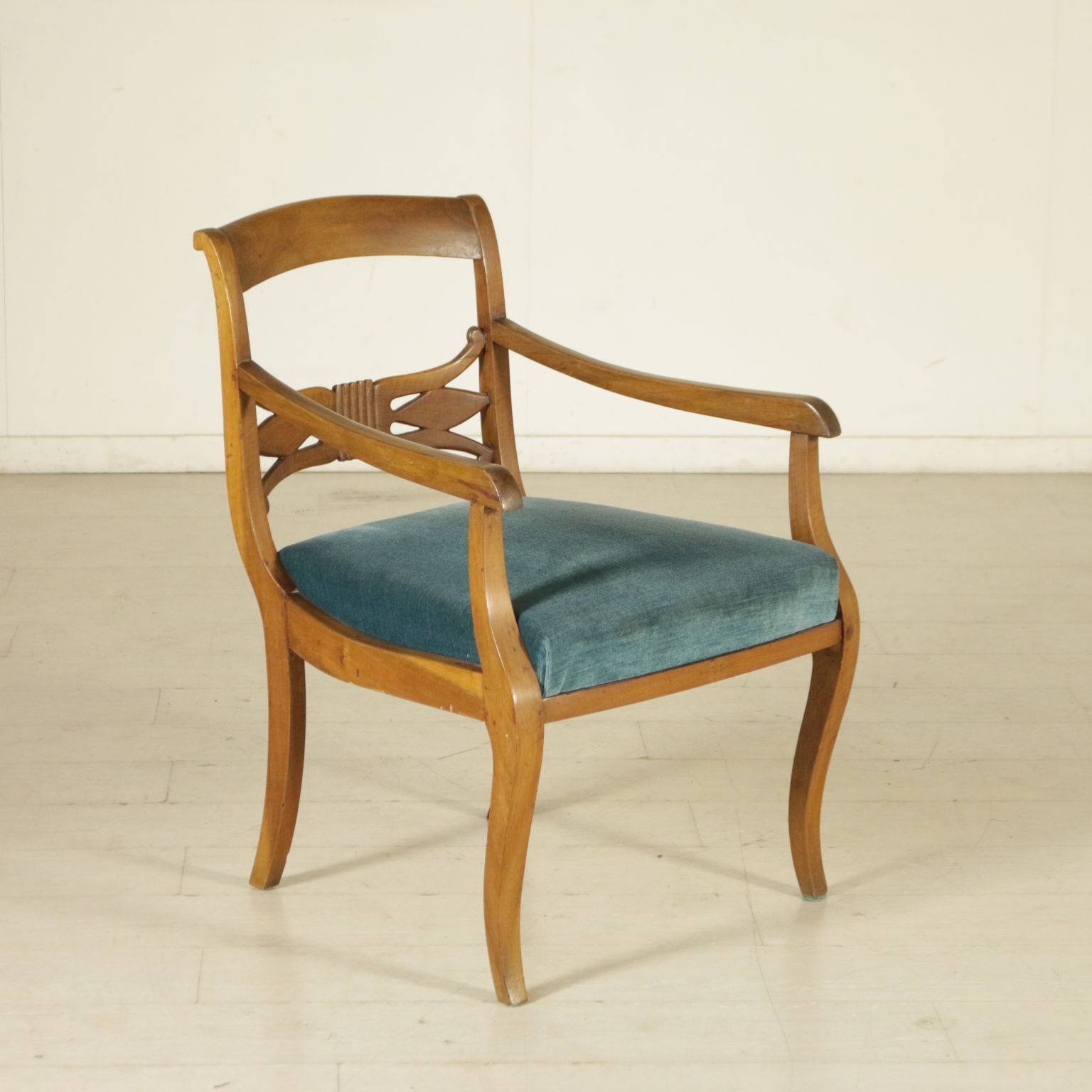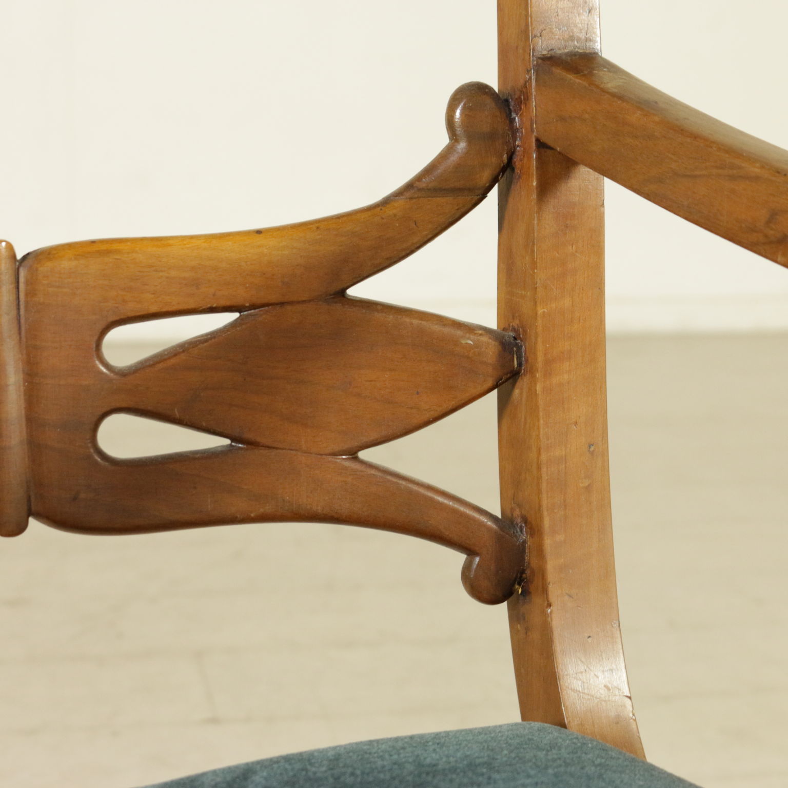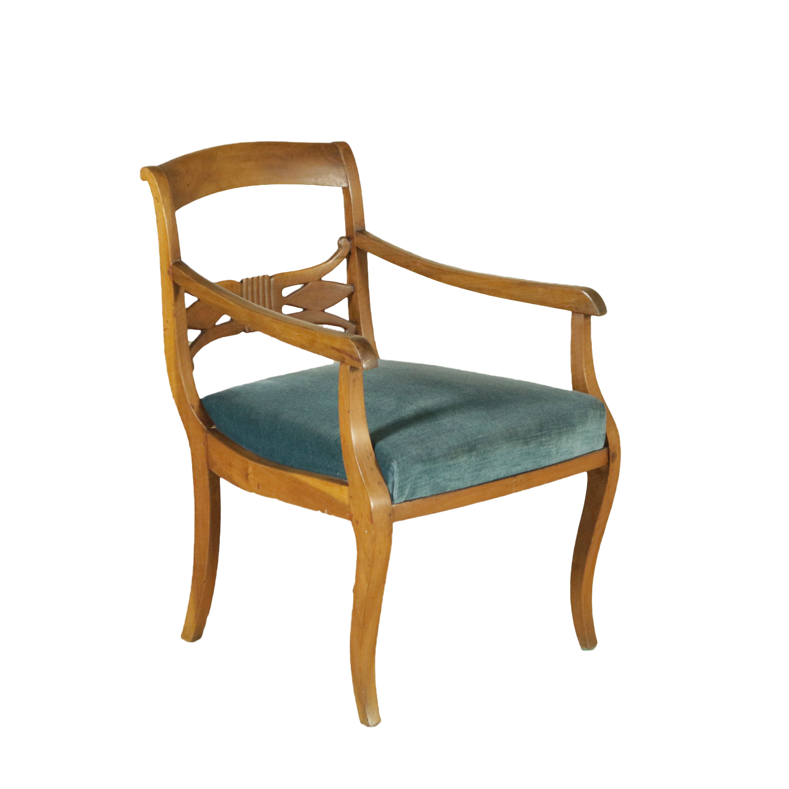 Sedia restaurazione retta da gambe a sciabola. Presenta schienale a giorno e seduta imbottita.