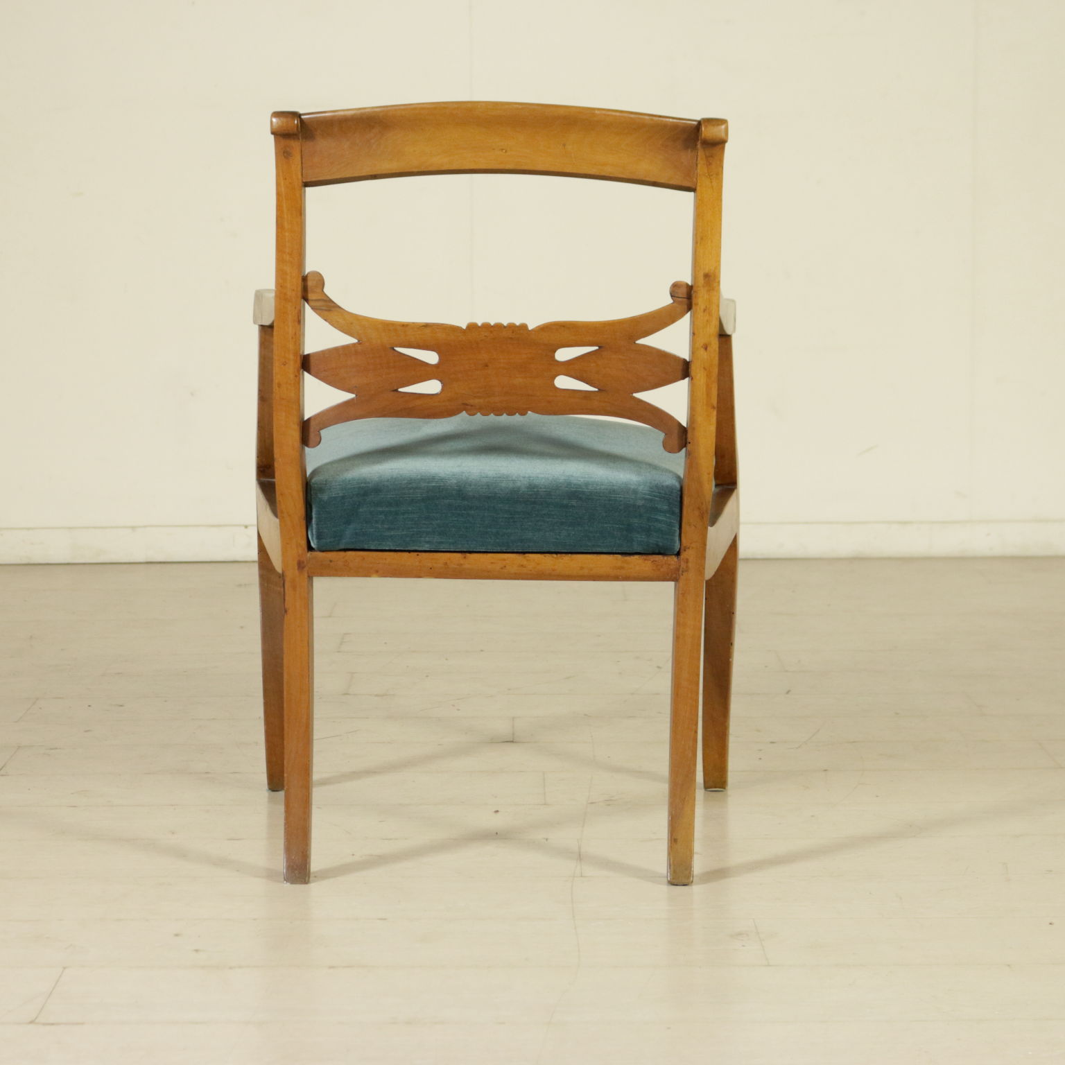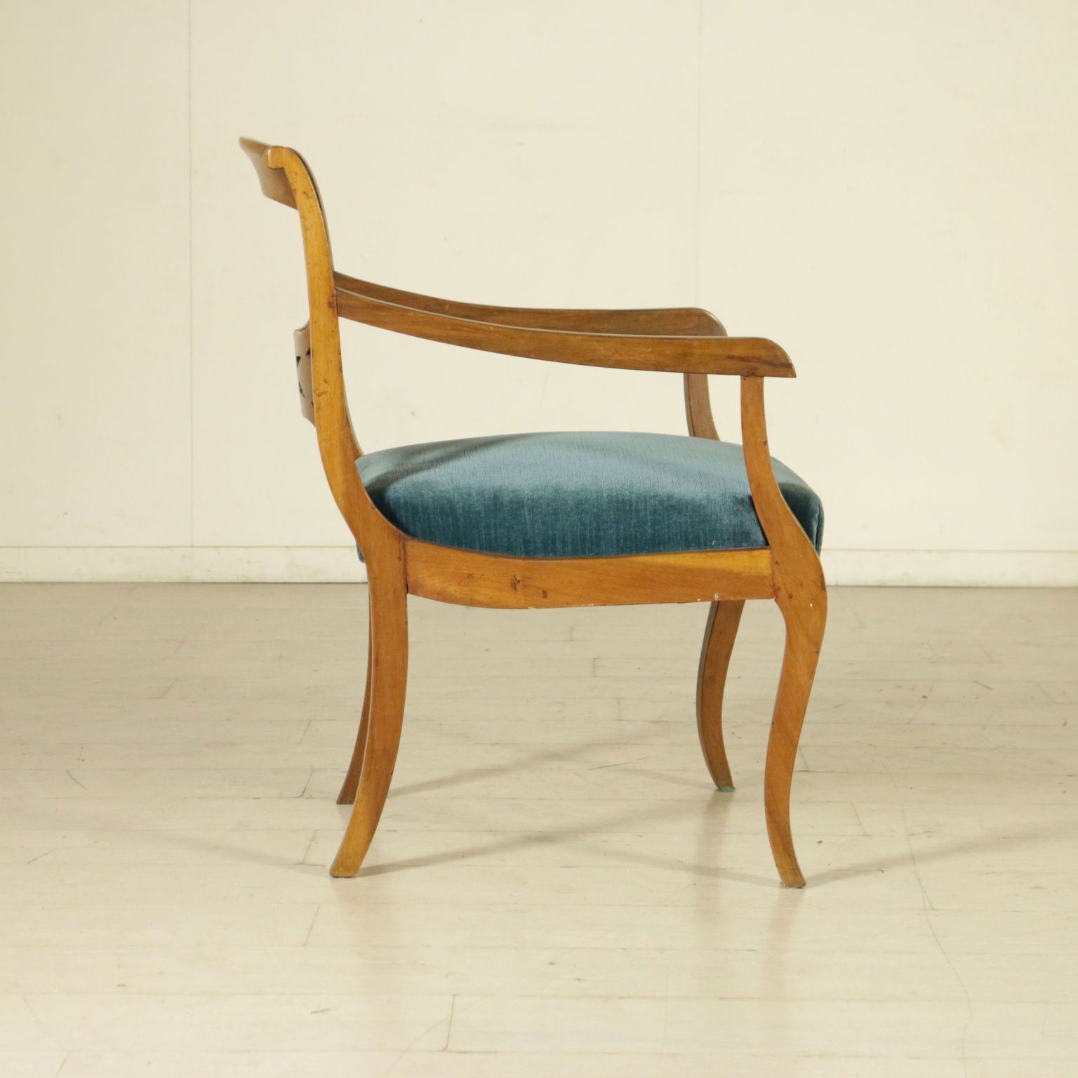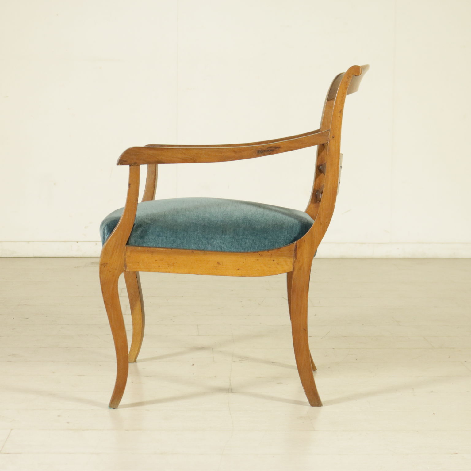 Sedia restaurazione retta da gambe a sciabola. Presenta schienale a giorno e seduta imbottita.