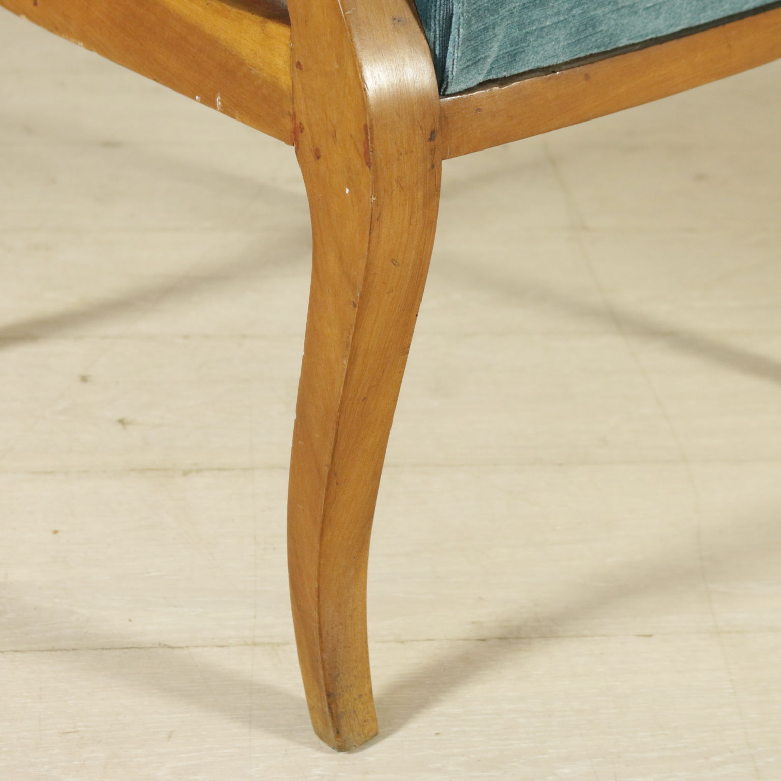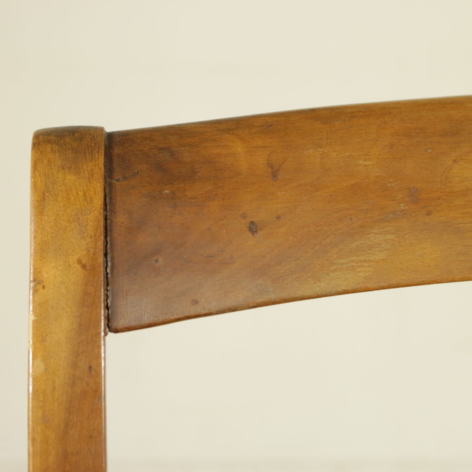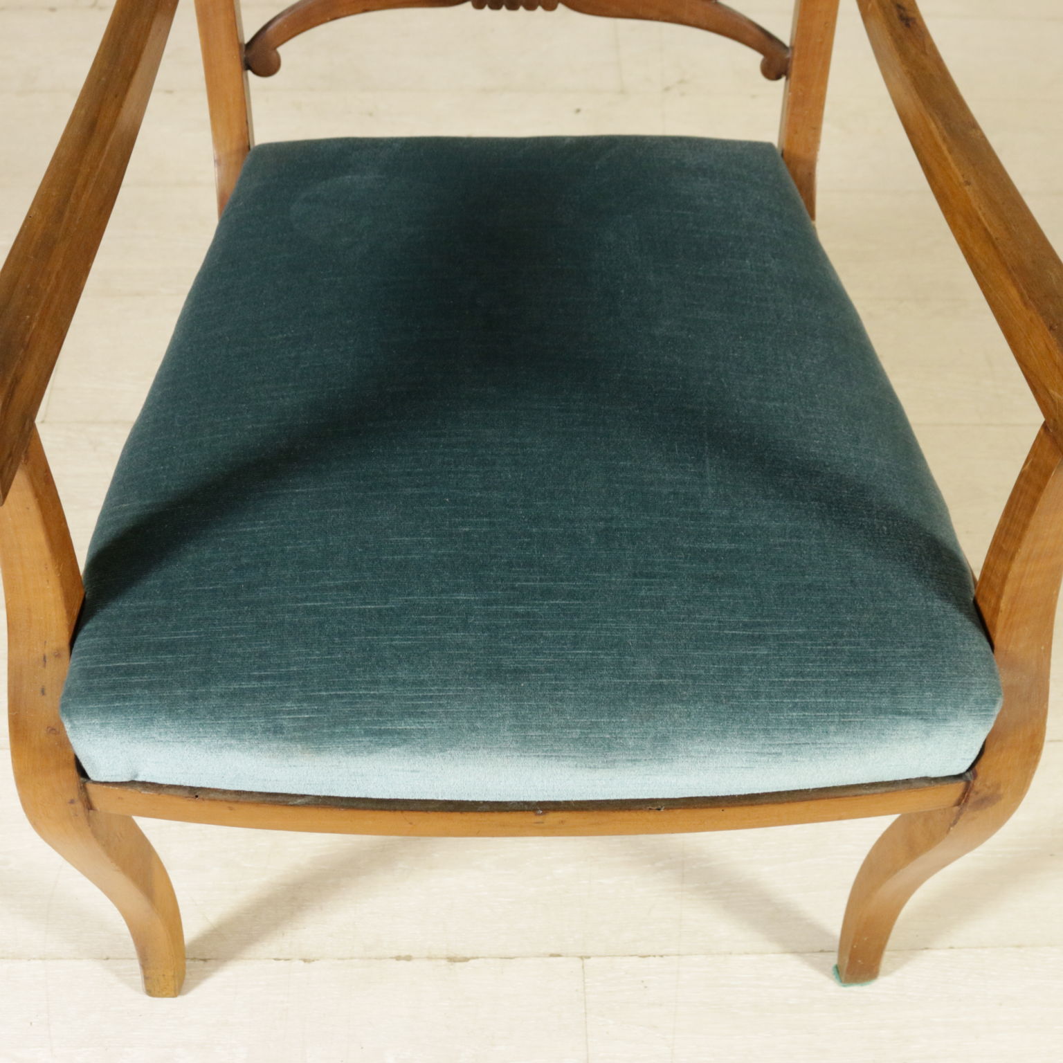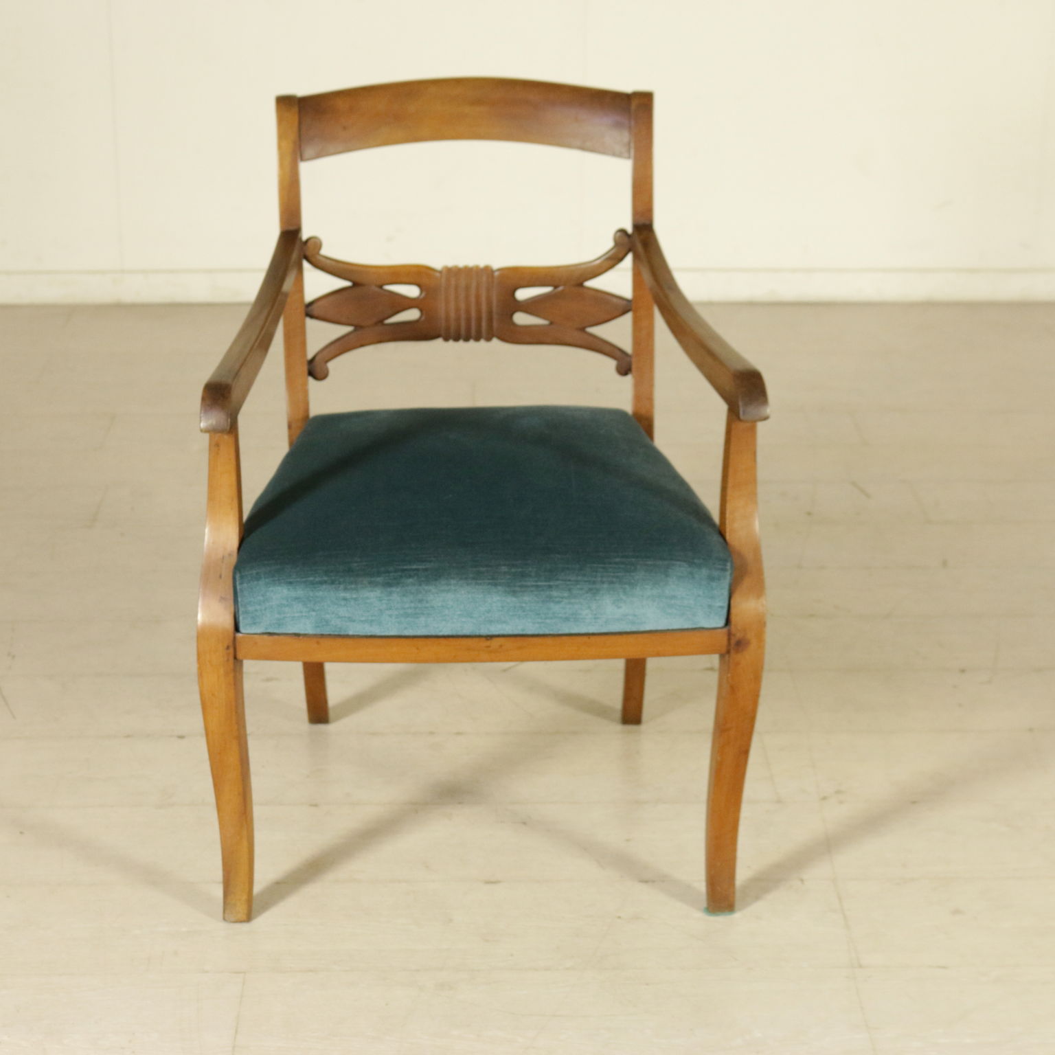 Sedia restaurazione retta da gambe a sciabola. Presenta schienale a giorno e seduta imbottita.