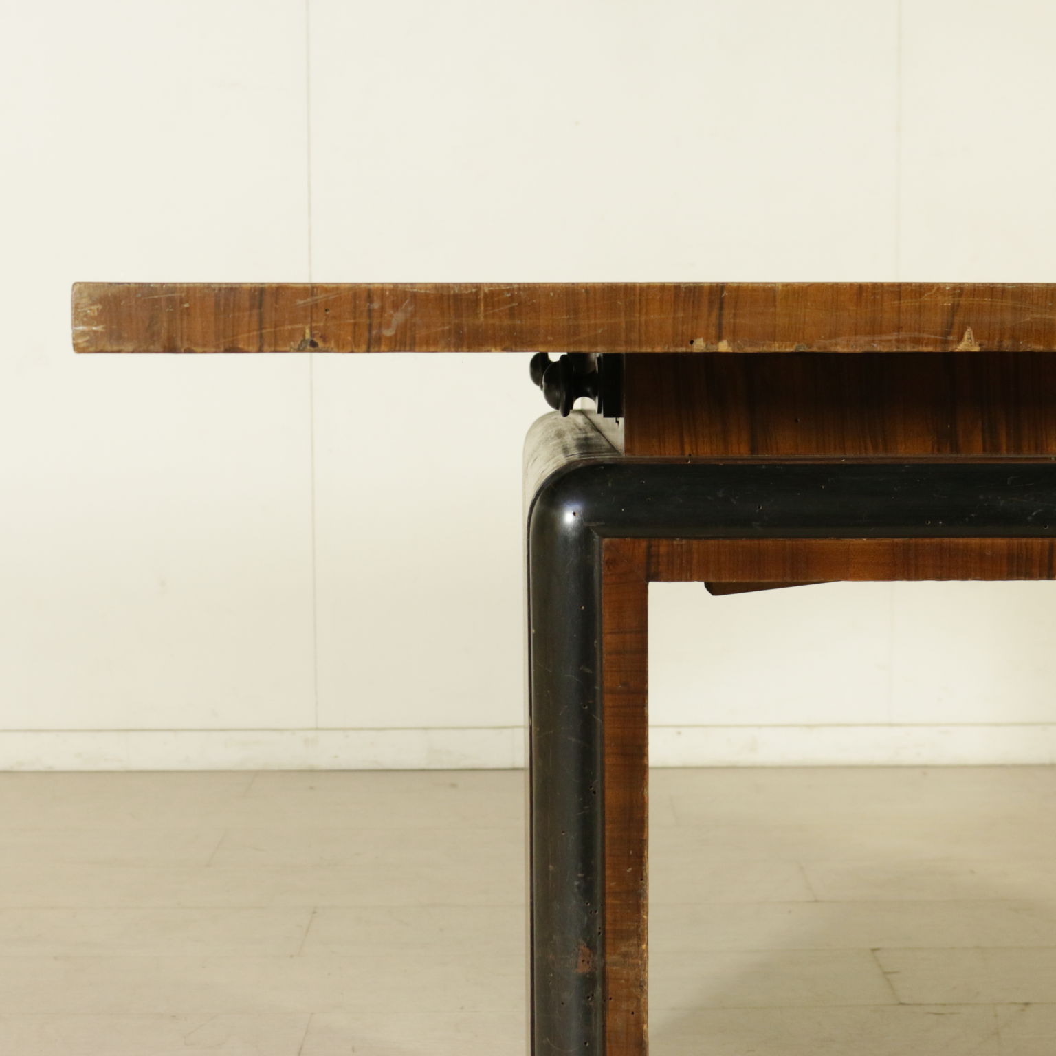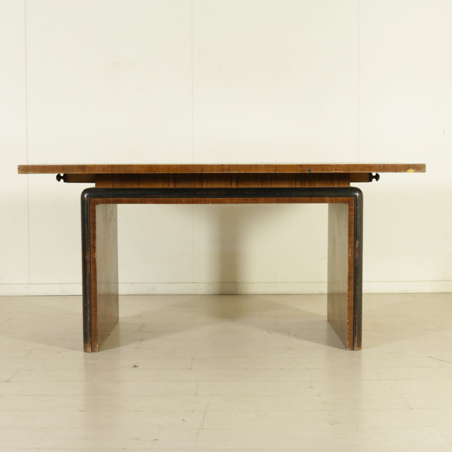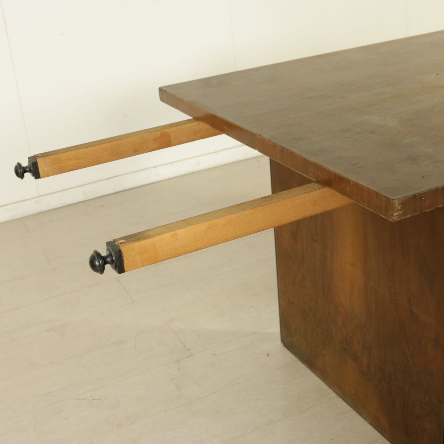 Tavolo Decò dalle gambe con profilo ebanizzate. Stagge sottopiano estraibili per allunghi. Noce, piuma di noce. Prima metà del '900.
