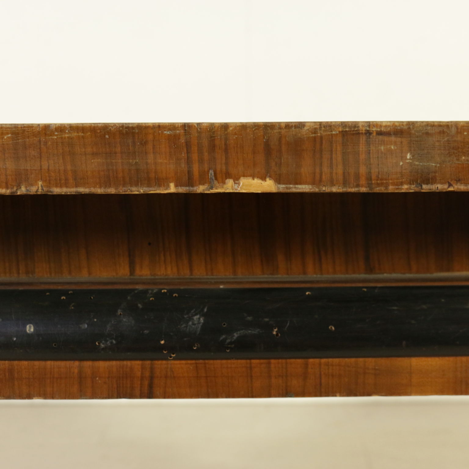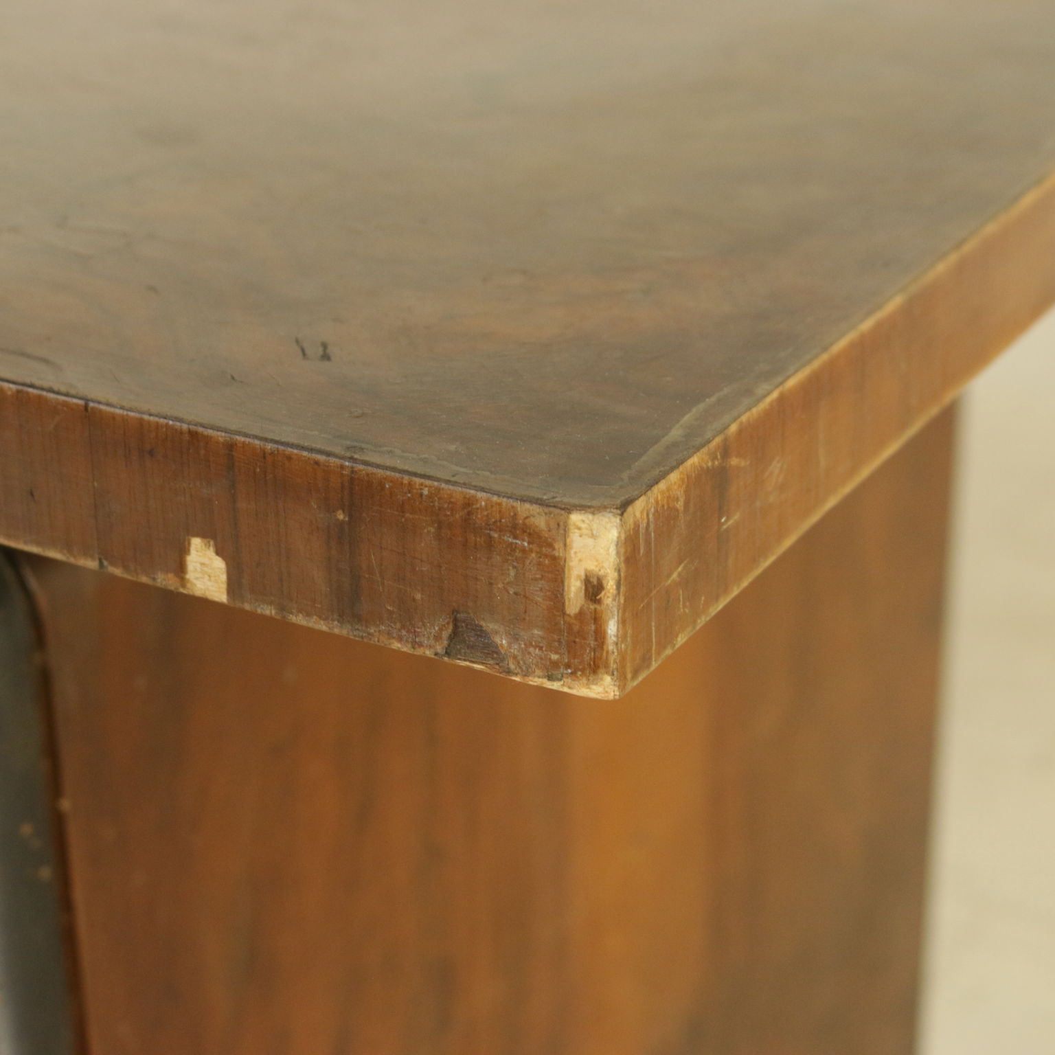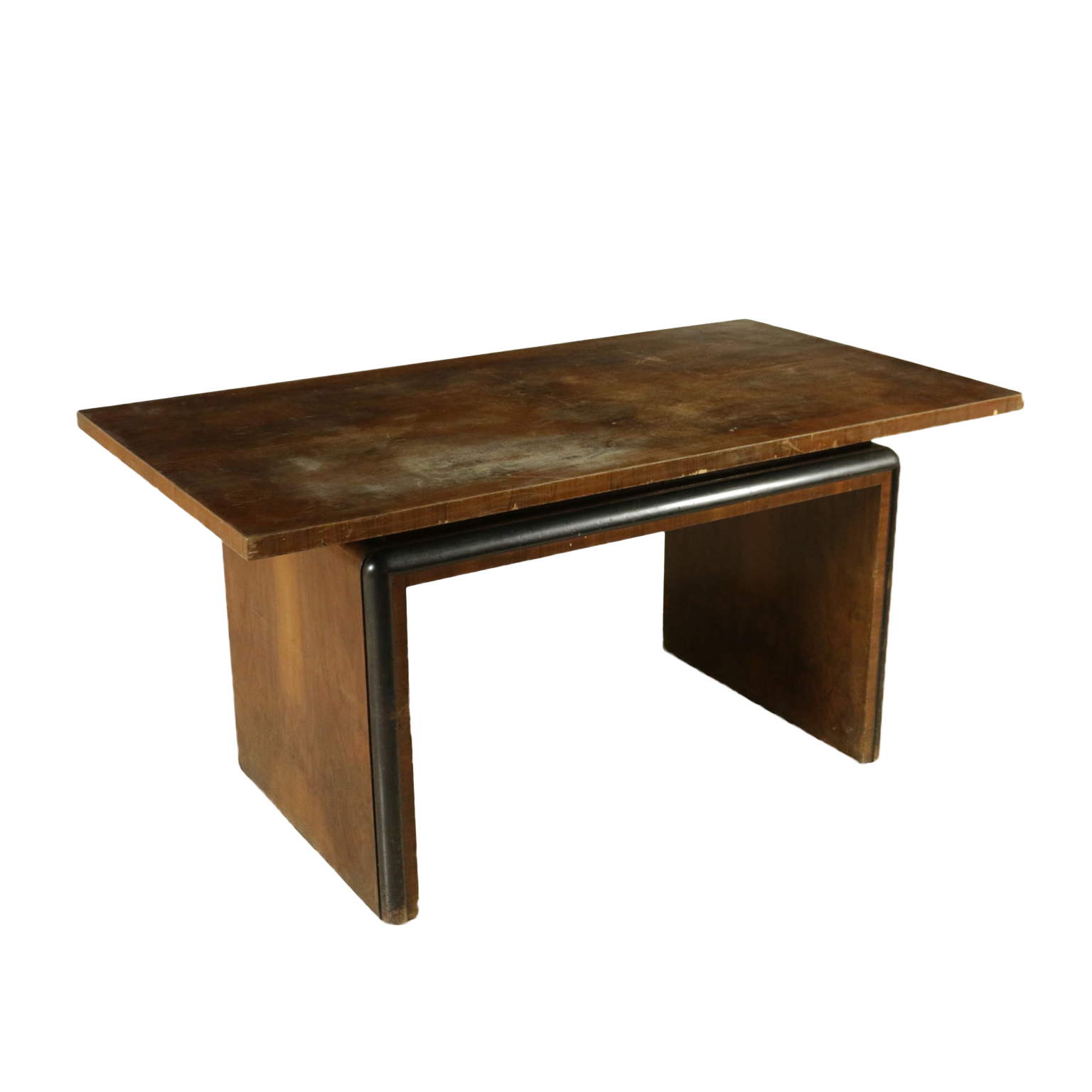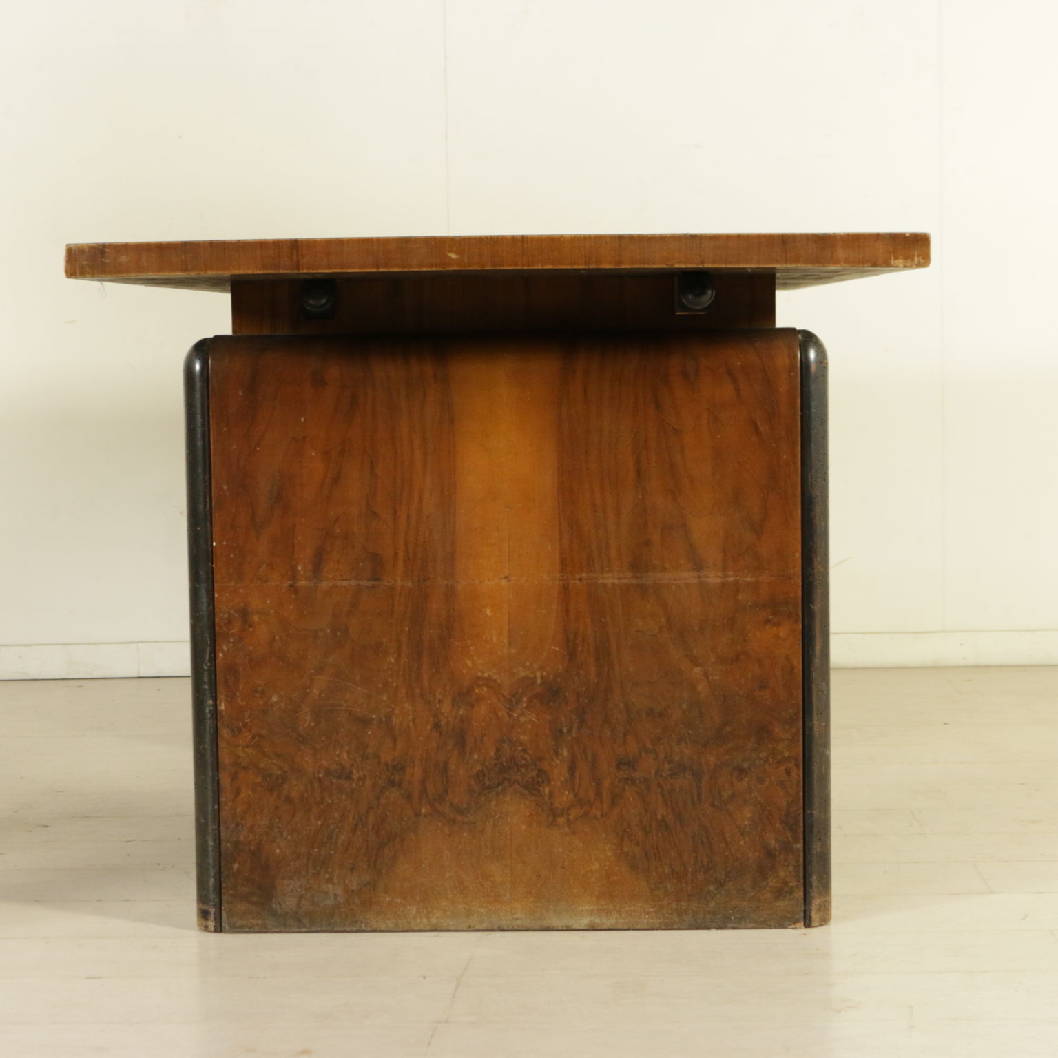 Tavolo Decò dalle gambe con profilo ebanizzate. Stagge sottopiano estraibili per allunghi. Noce, piuma di noce. Prima metà del '900.