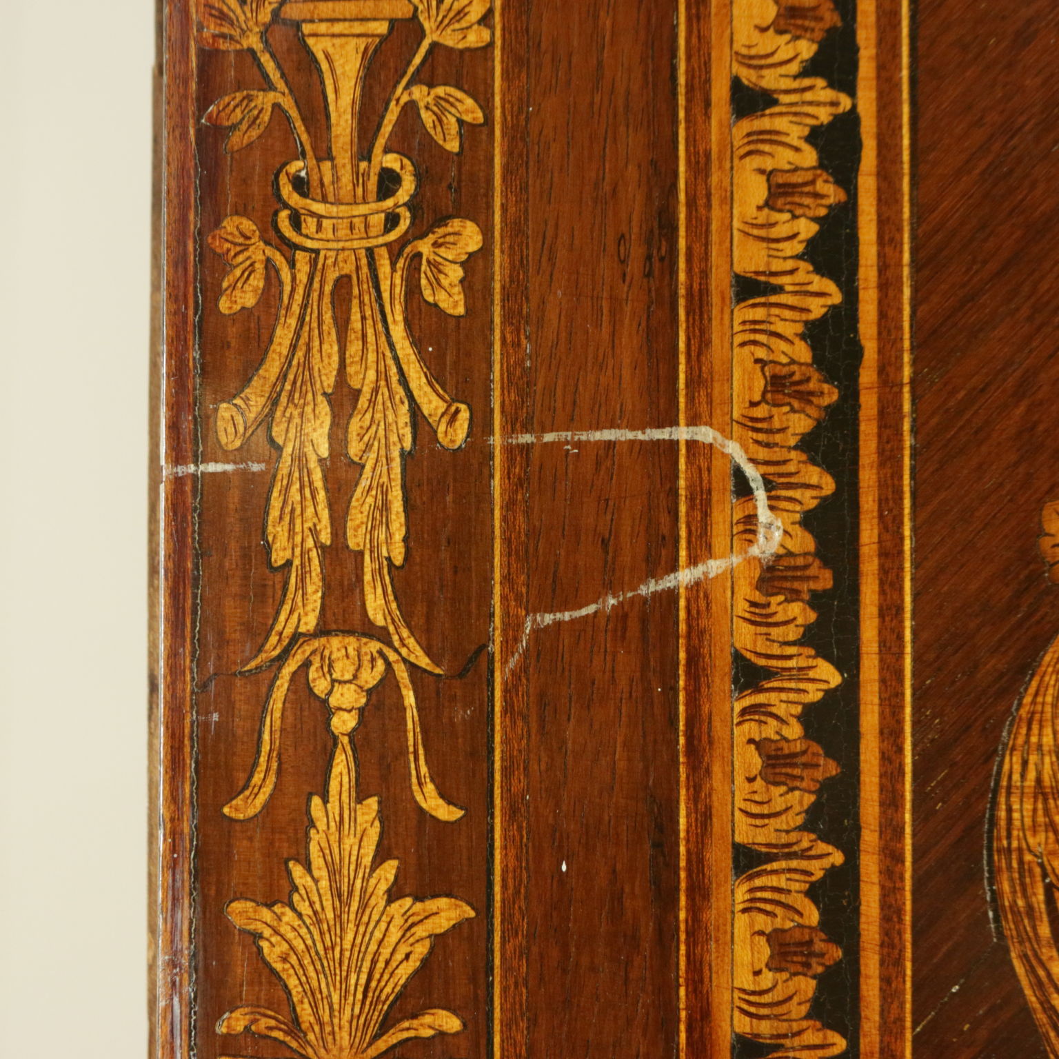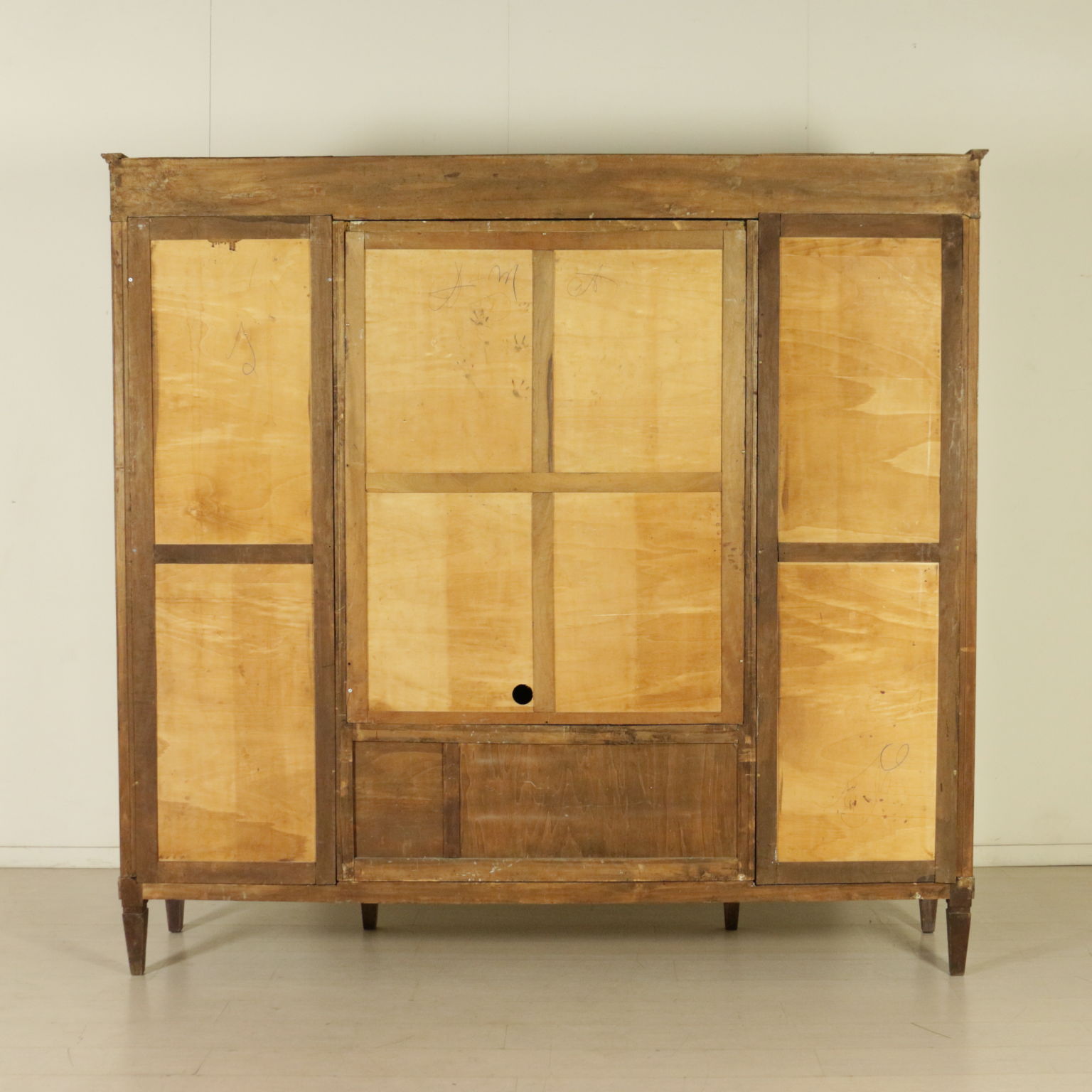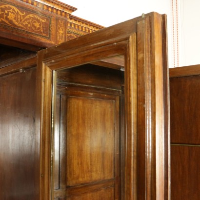 Armadio a quattro ante e due cassetti. Riccamente intarsiato con motivi fogliacei, presenta 4 riserve ovali intarsiate con scene mitologiche.