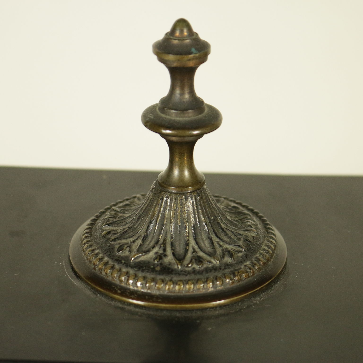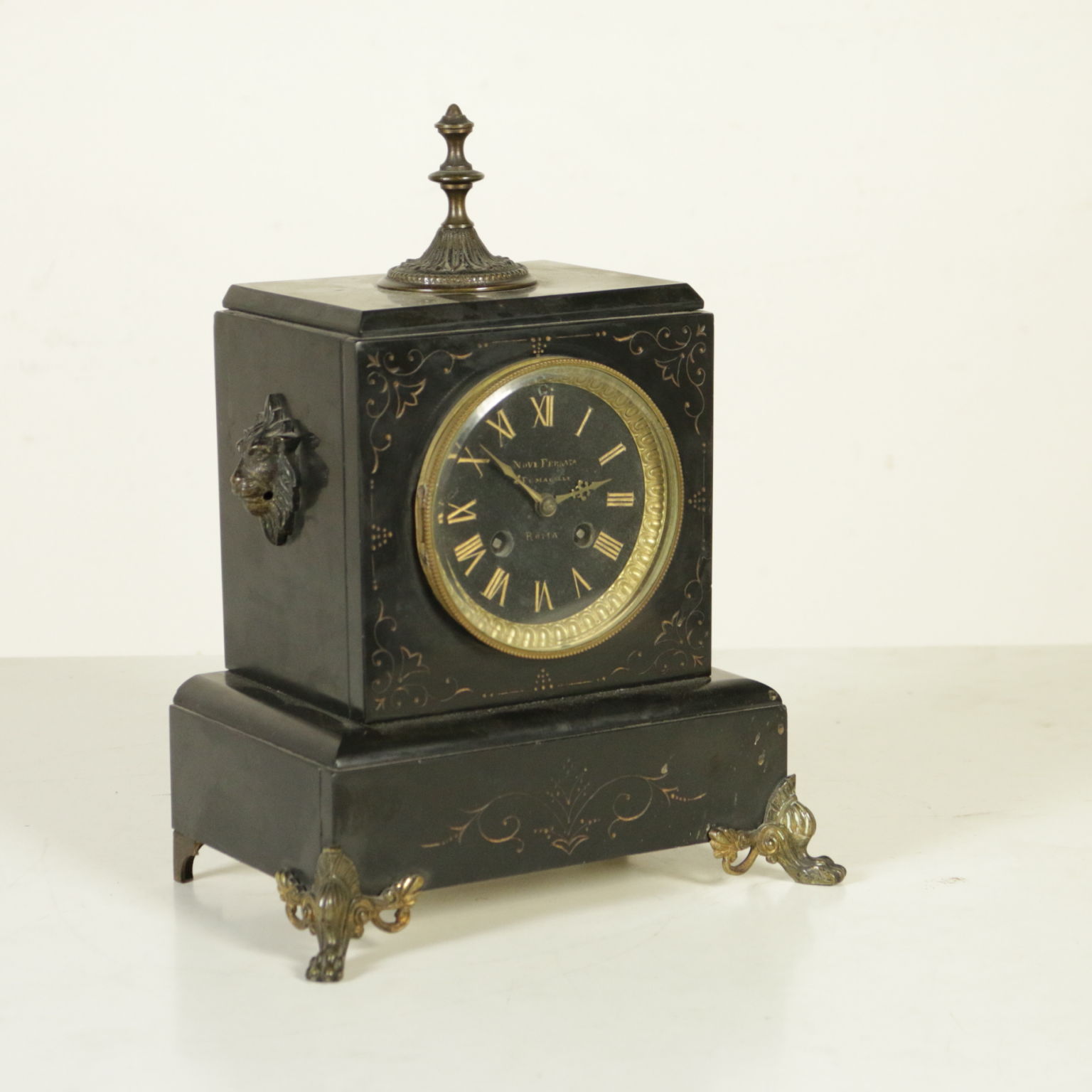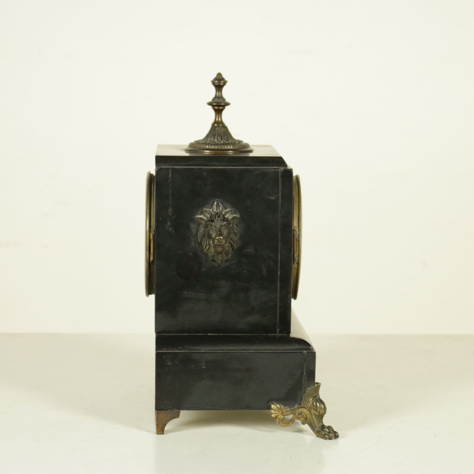 Orologio da appoggio a pendolo in marmo nero, con piedini e teste leonine in bronzo. Mostrino a numeri romani, marca e provenienza dell'orologio incisi e dorati.