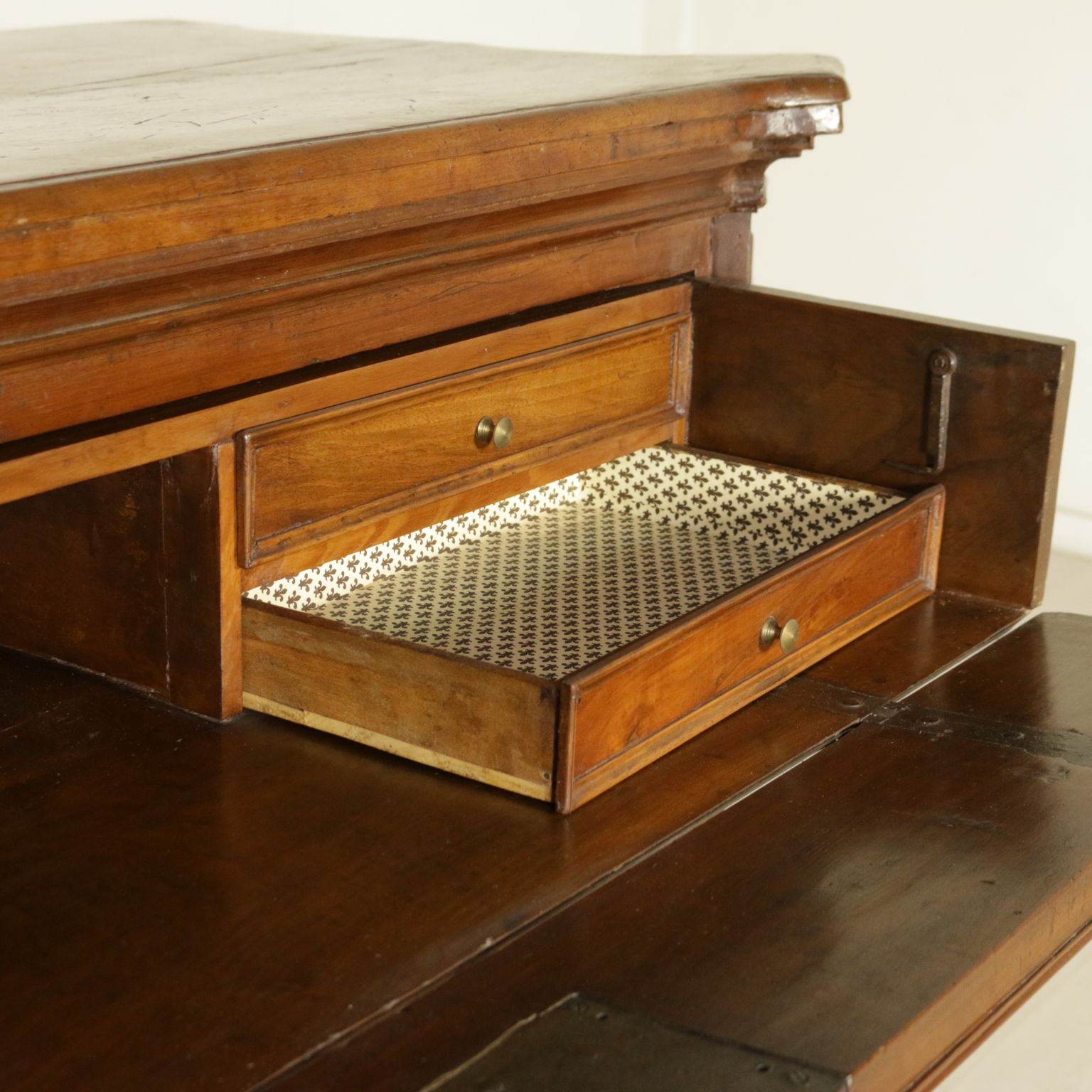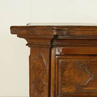 Canterano Lombardo a quattro cassetti di cui il primo con fronte apribile a ribalta cela quattro cassettini e vano. Formelle racchiuse da cornici e riserve in radica di noce. Montanti a 45° e piedi a mensola. Ha subito restauri. Italia, primi '700.