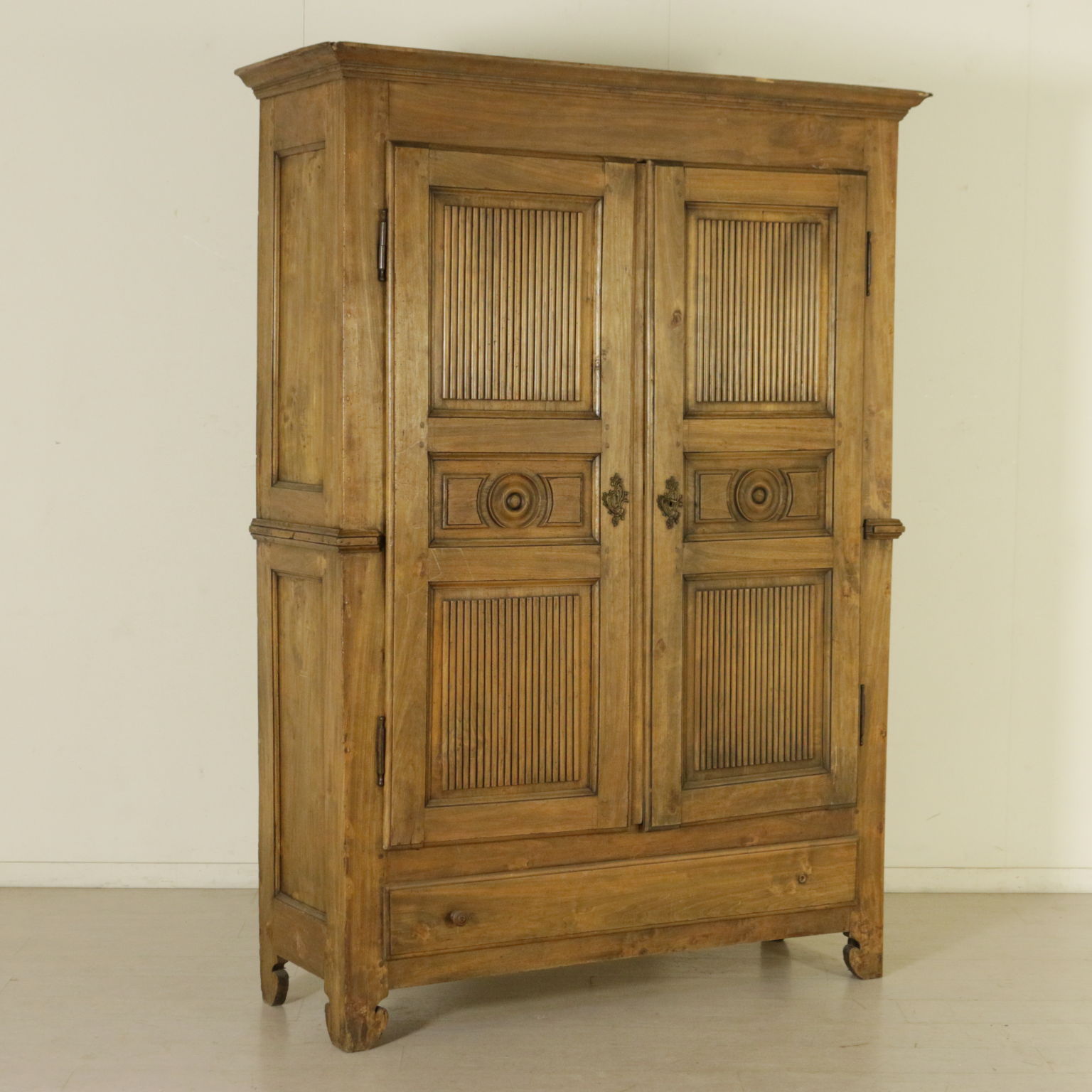 Armadio a due corpi, presenta un cassetto e due ante finemente intagliate.