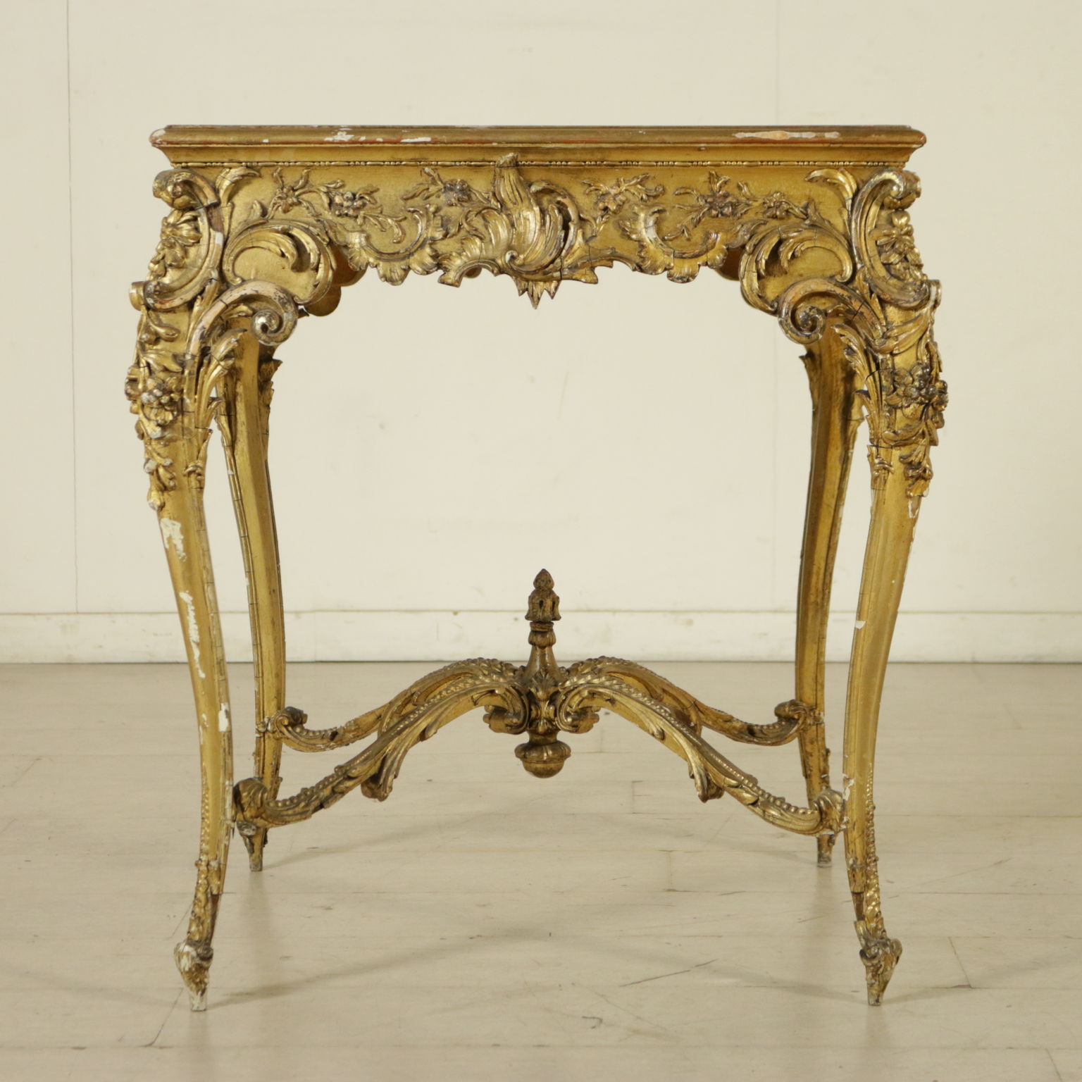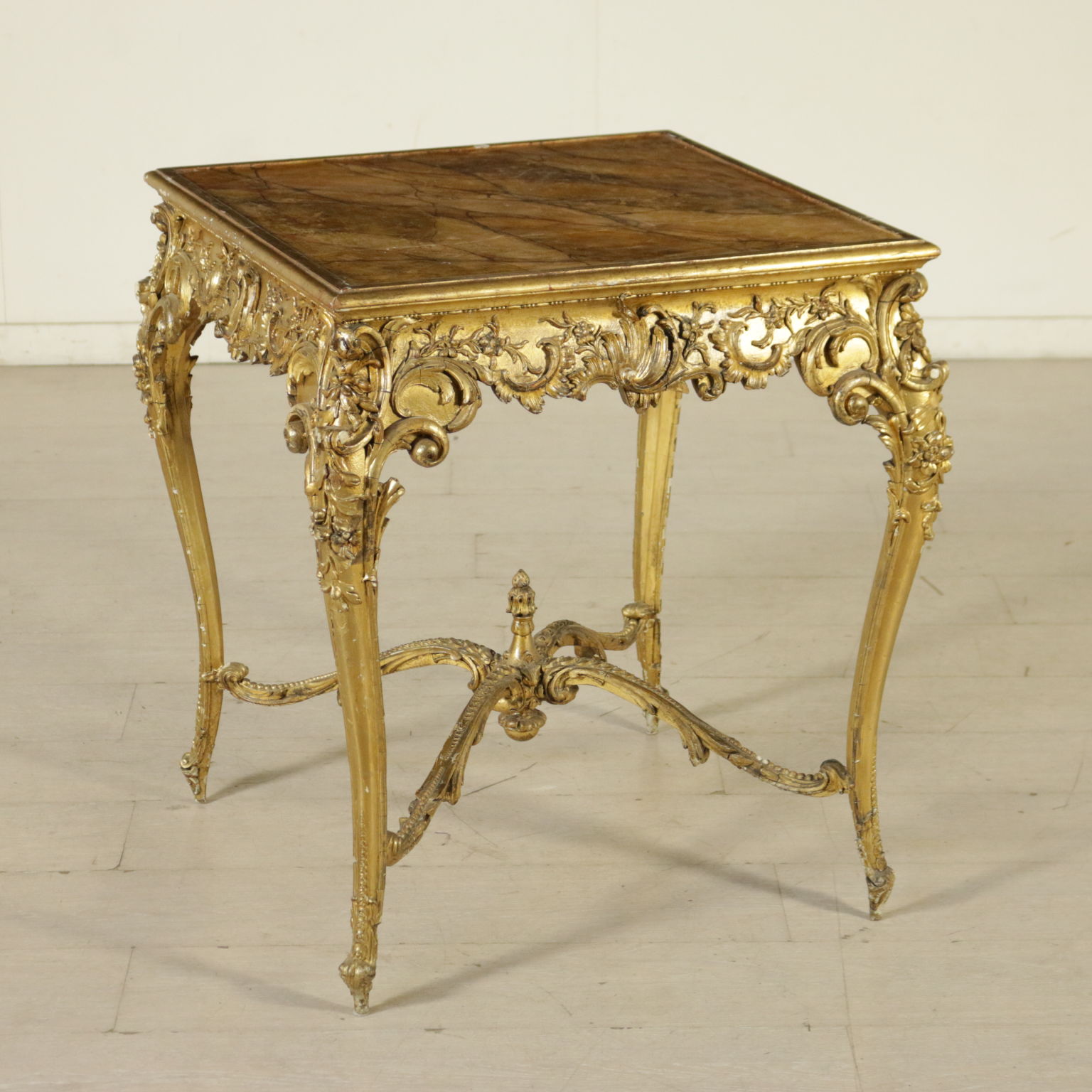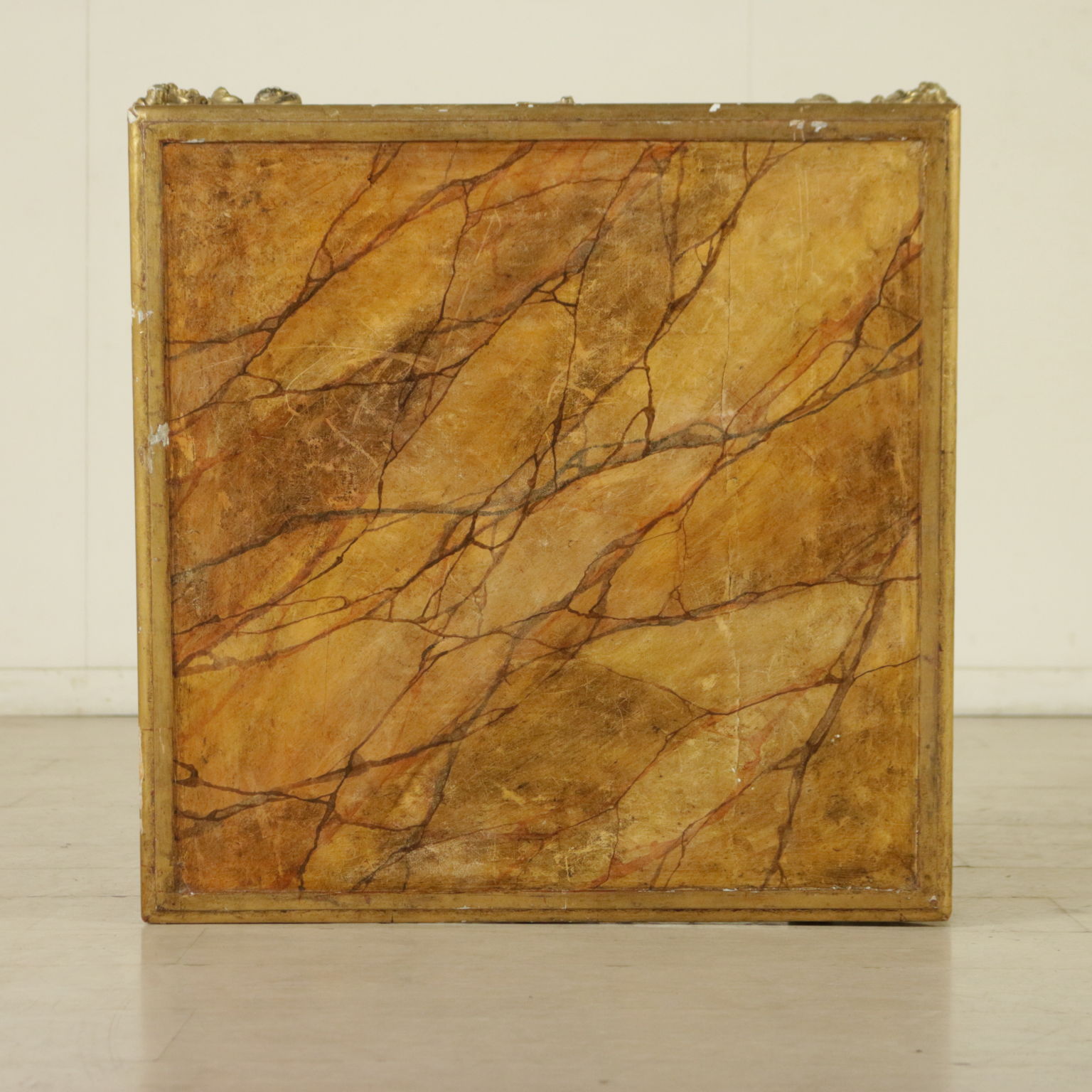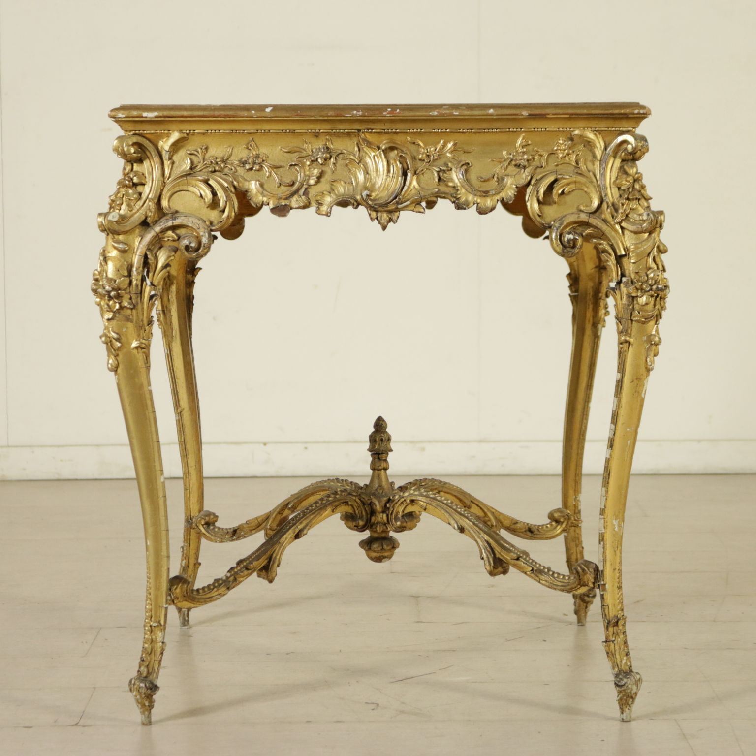 Tavolino intagliato con gambe raccordate da crociera. Piano decorato con marmorizzazione.