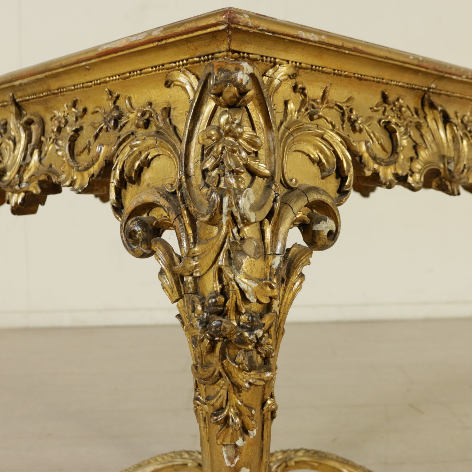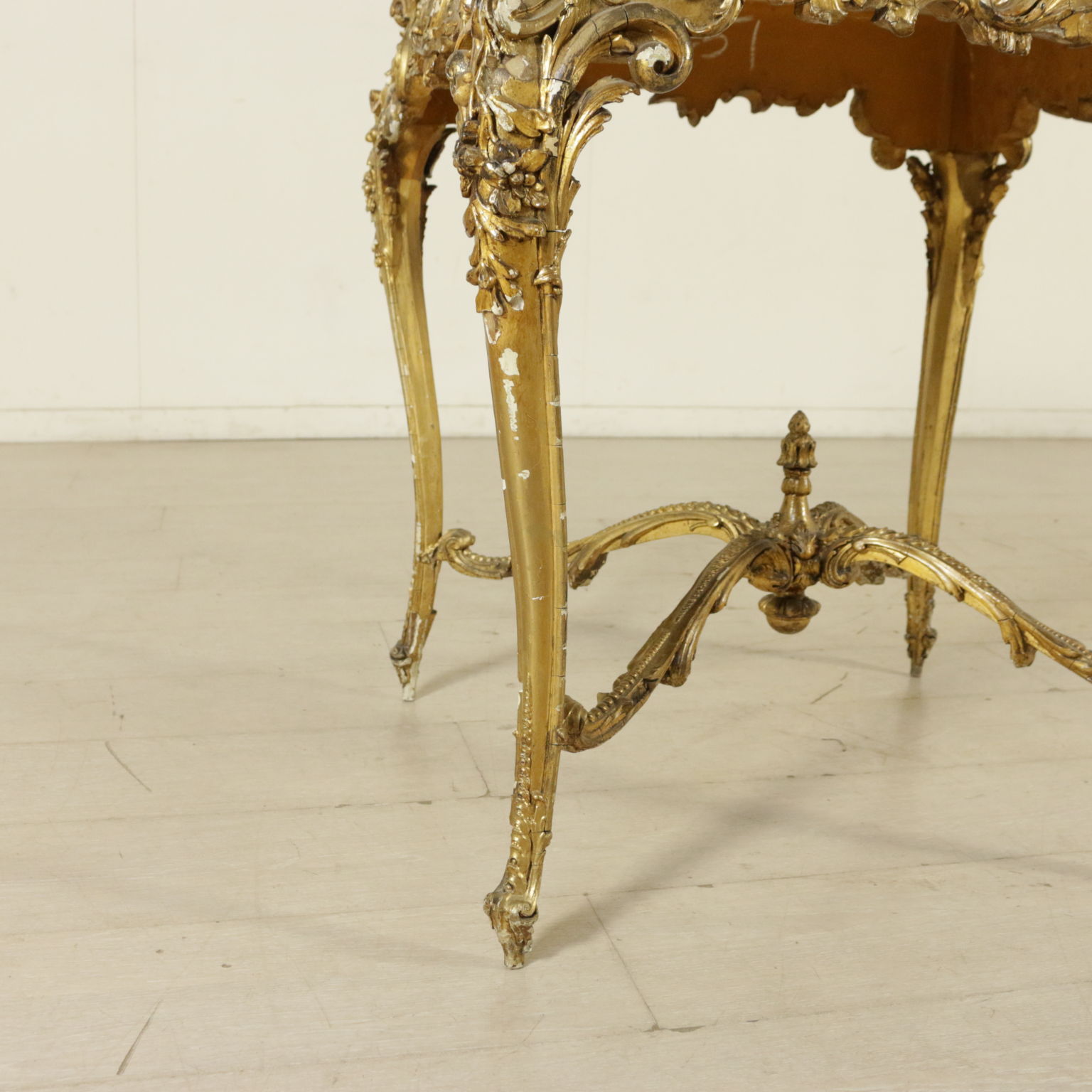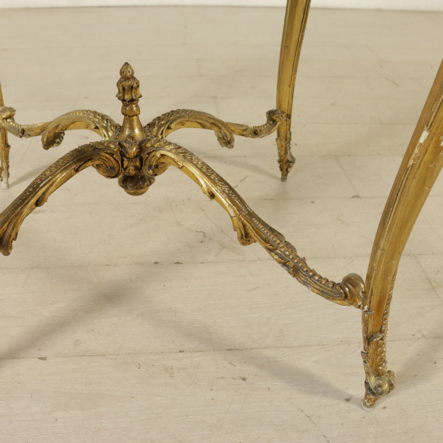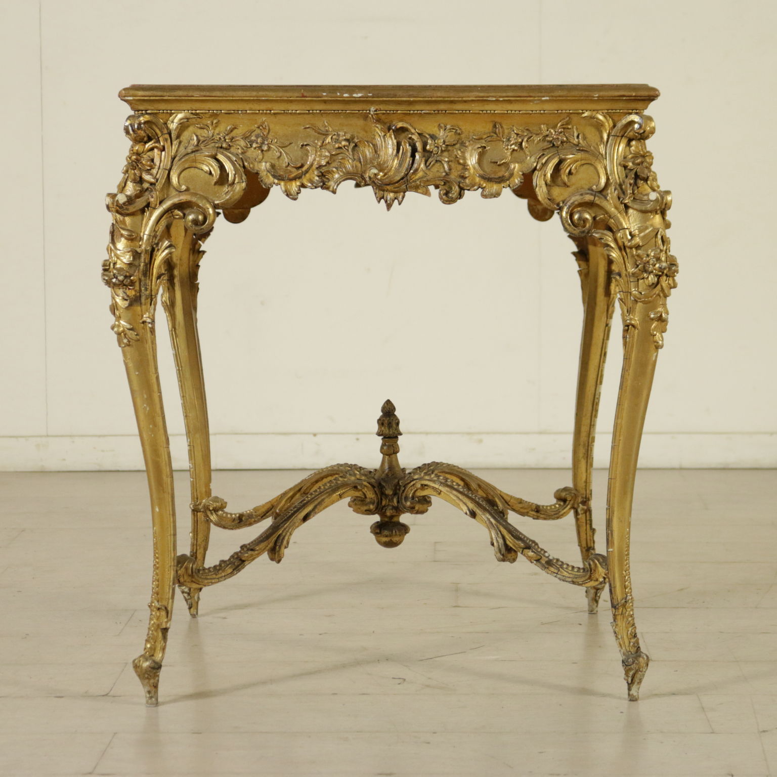 Tavolino intagliato con gambe raccordate da crociera. Piano decorato con marmorizzazione.
