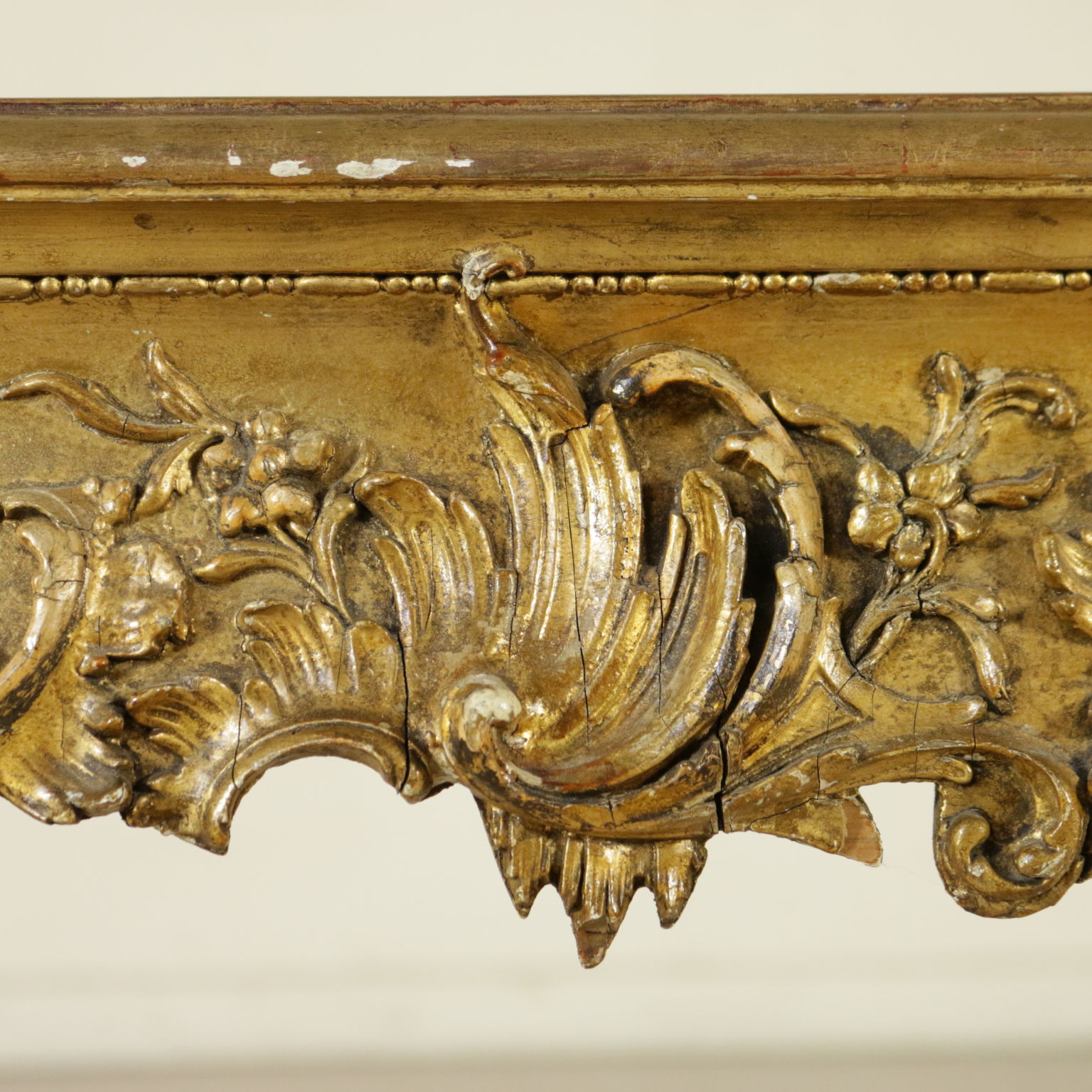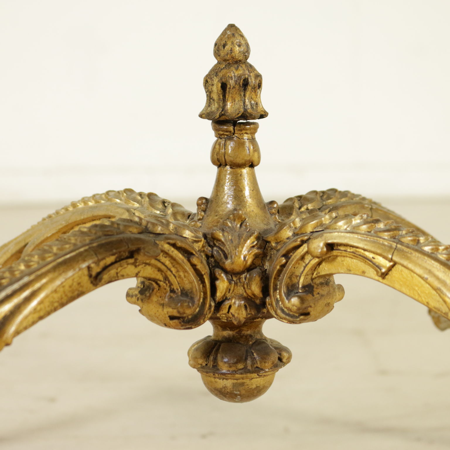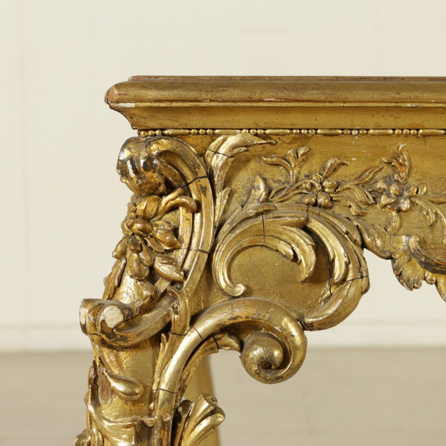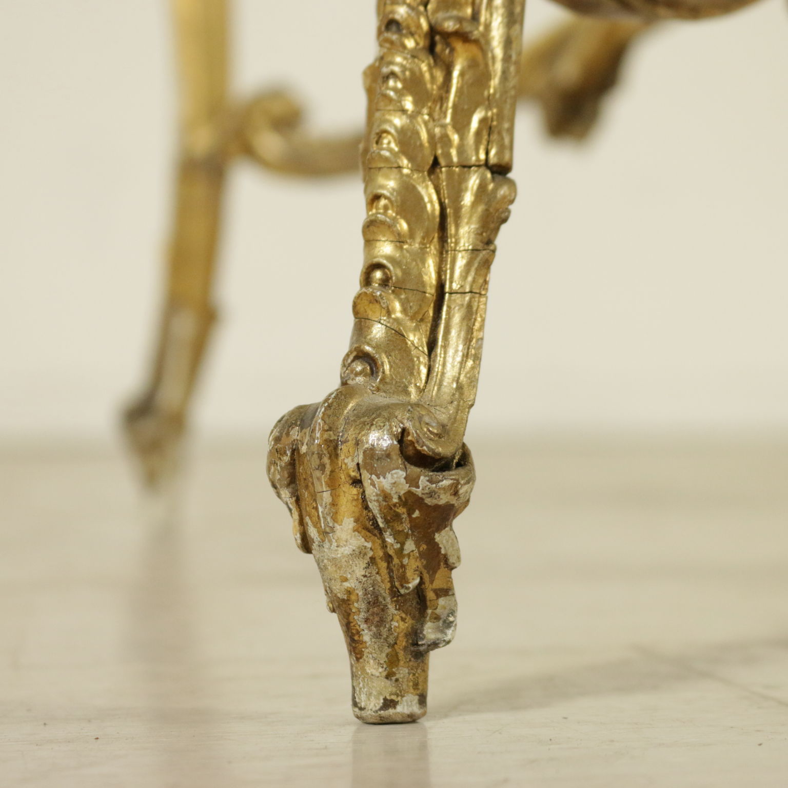 Tavolino intagliato con gambe raccordate da crociera. Piano decorato con marmorizzazione.