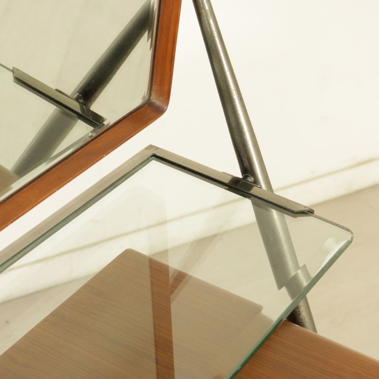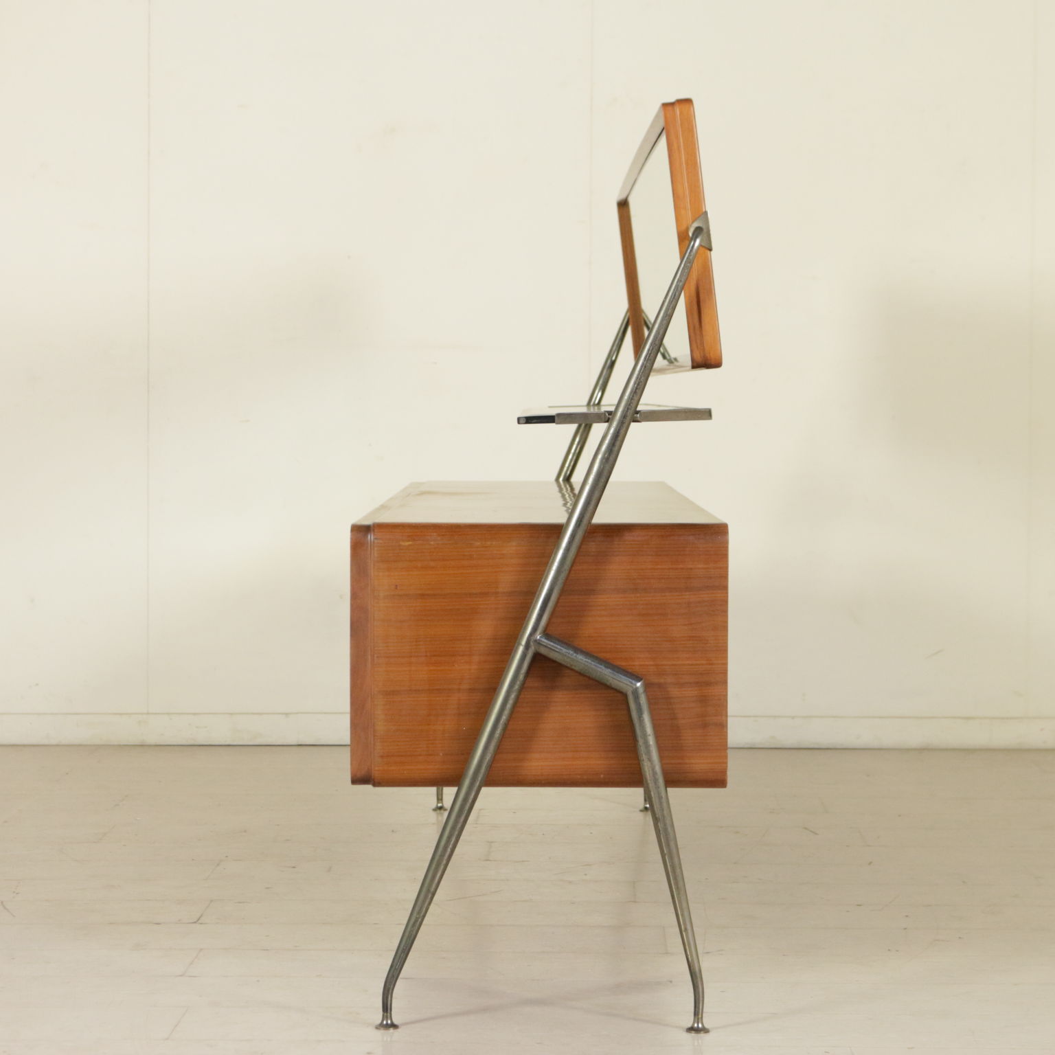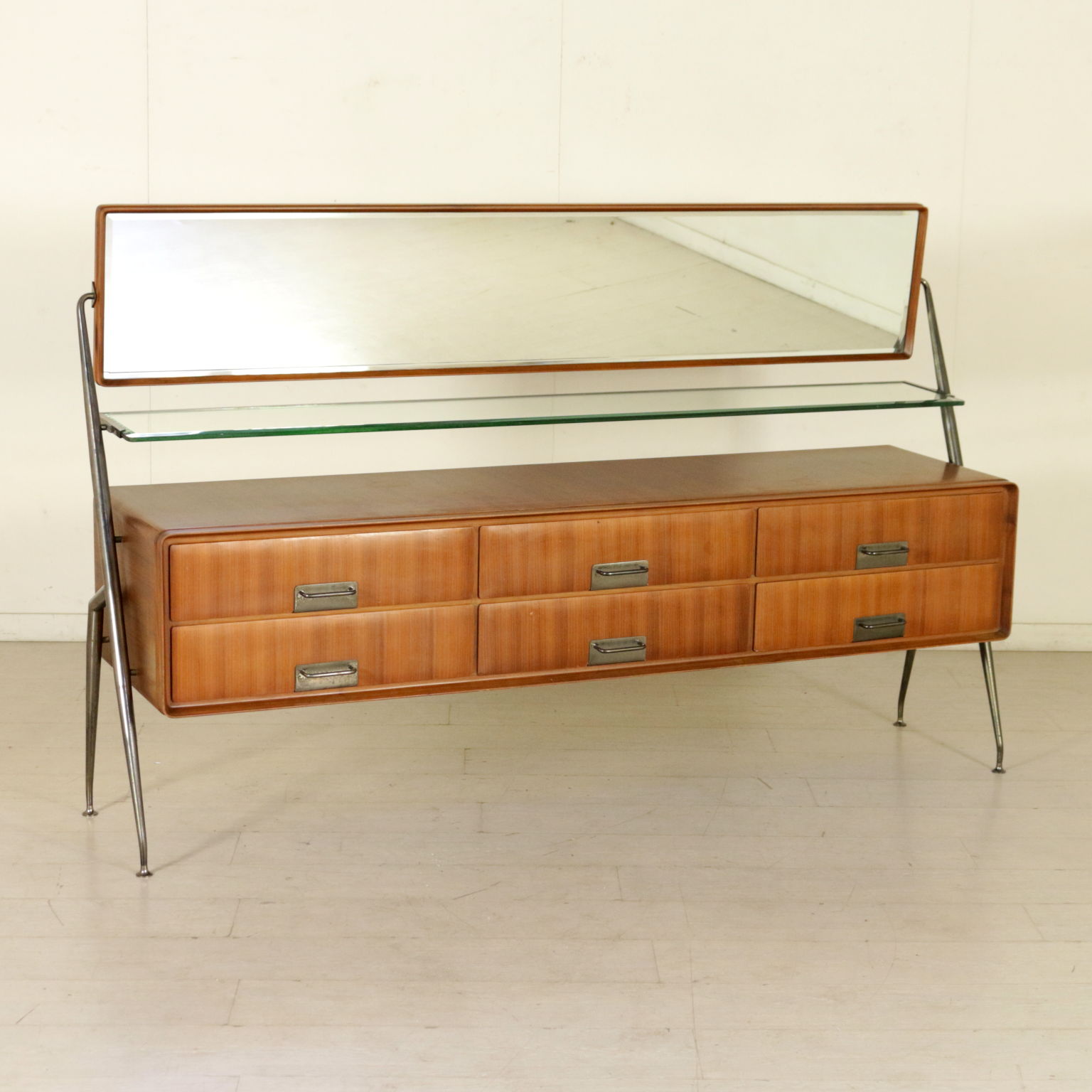 Comò con specchio basculante; legno impiallacciato teak, ottone brunito.