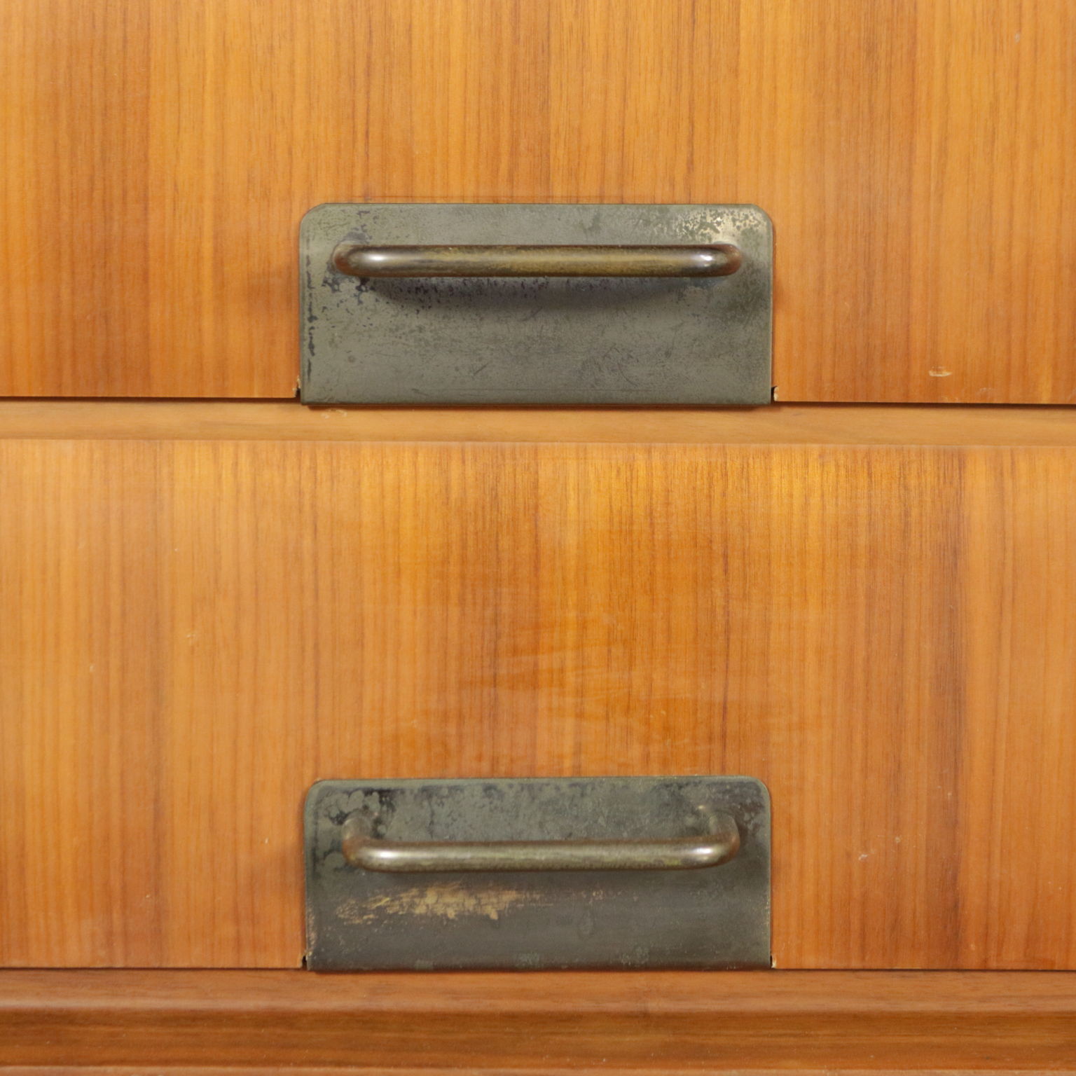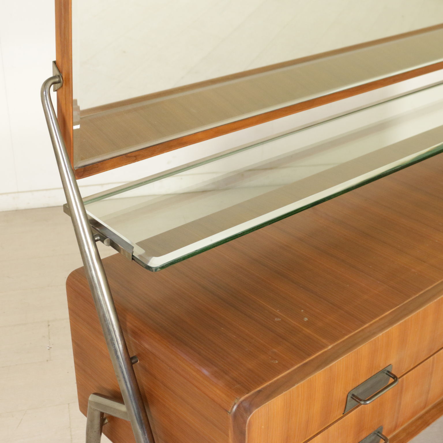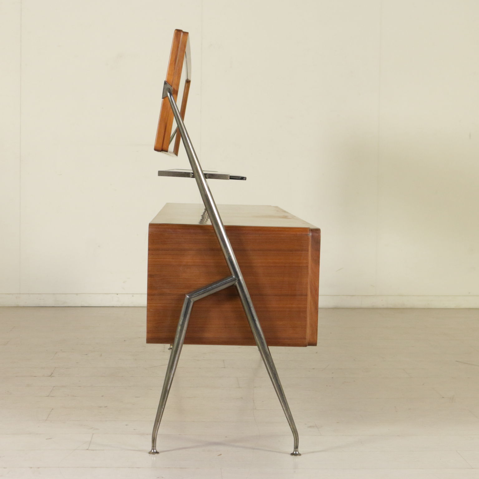 Comò con specchio basculante; legno impiallacciato teak, ottone brunito.
