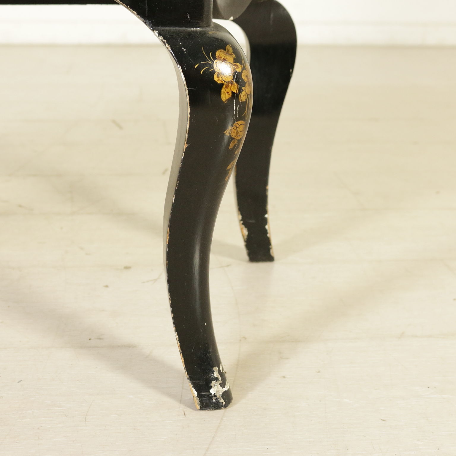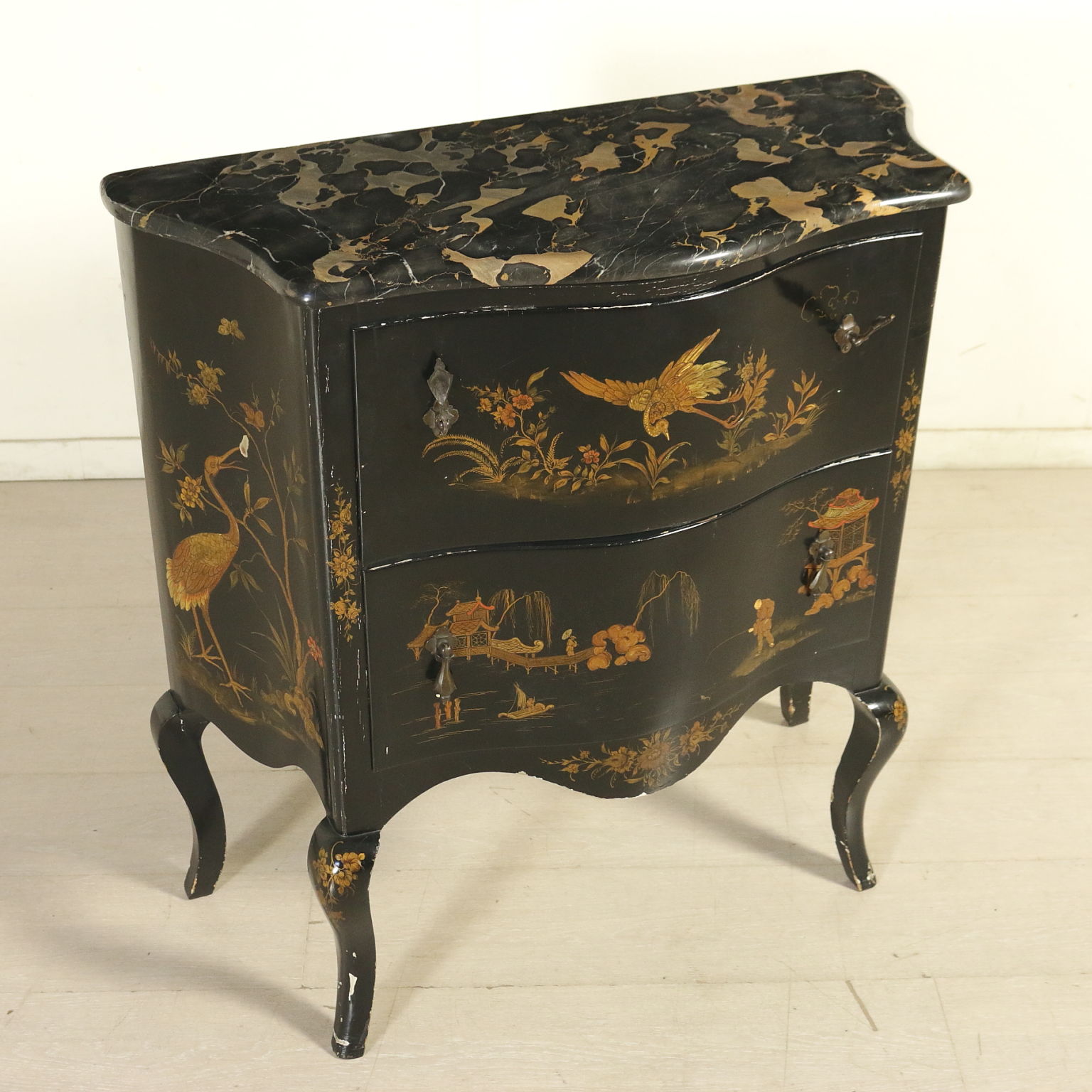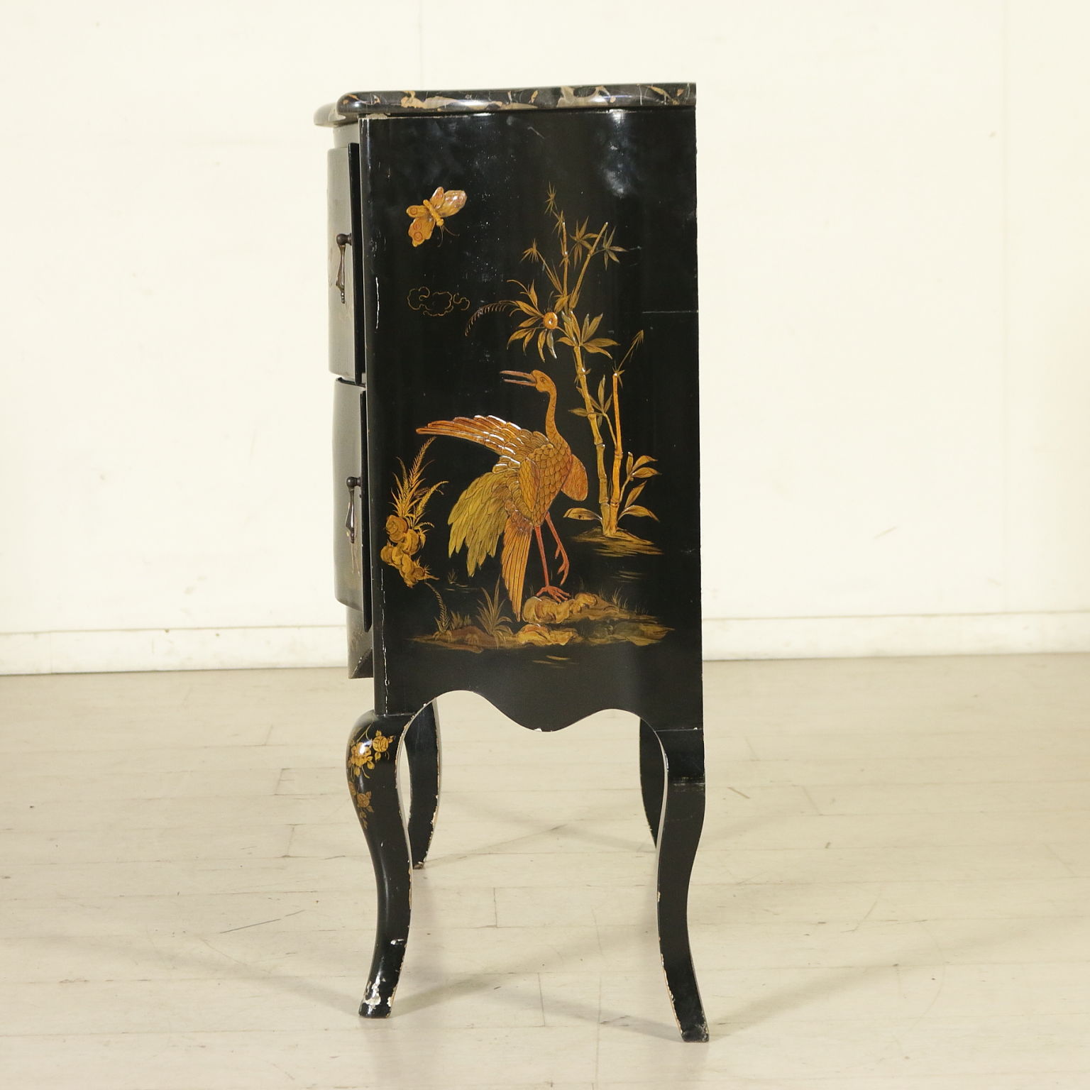 Mosso sul fronte e fianchi, presenta due cassetti e piano in marmo Portoro. Interamente laccato con decorazioni chinoiserie.
