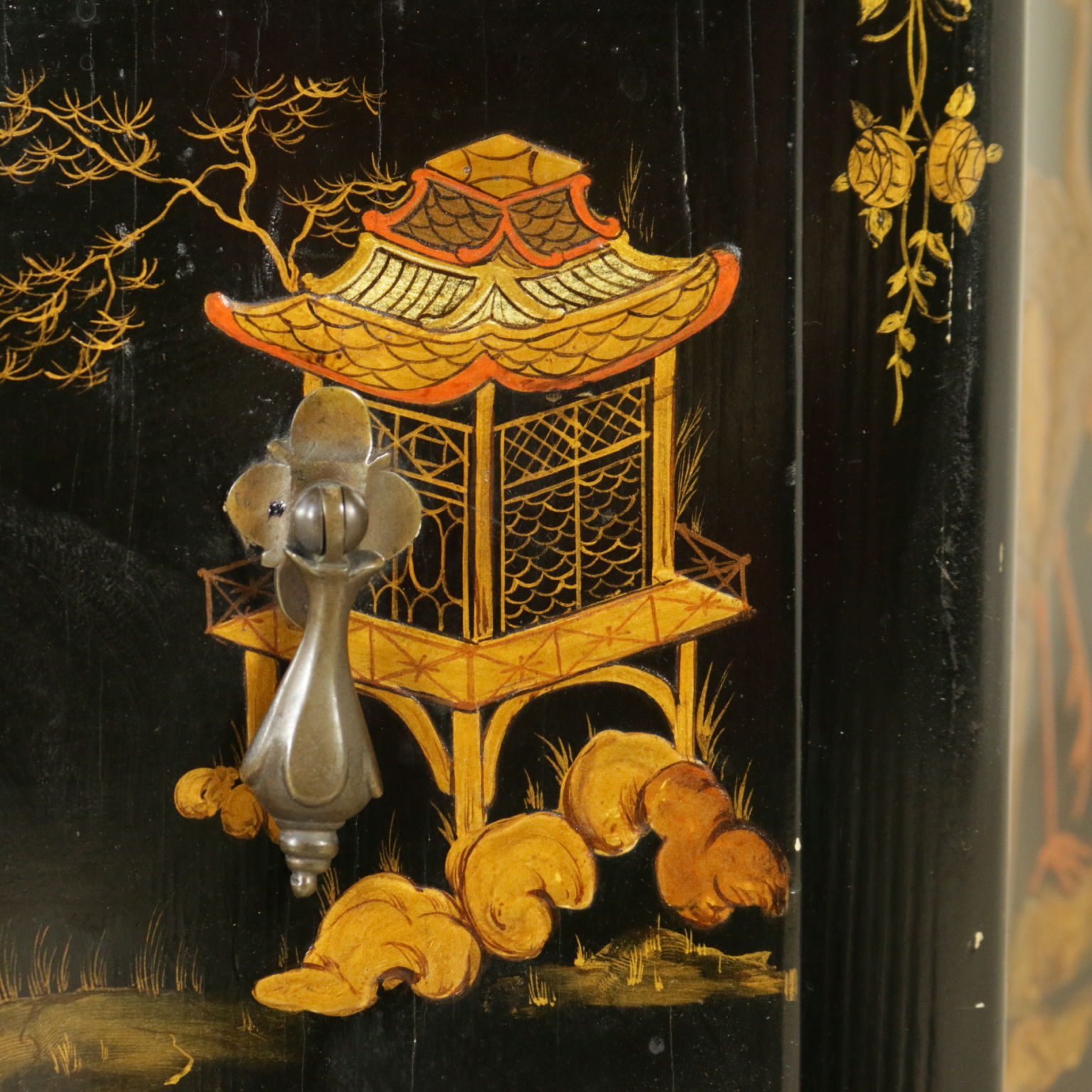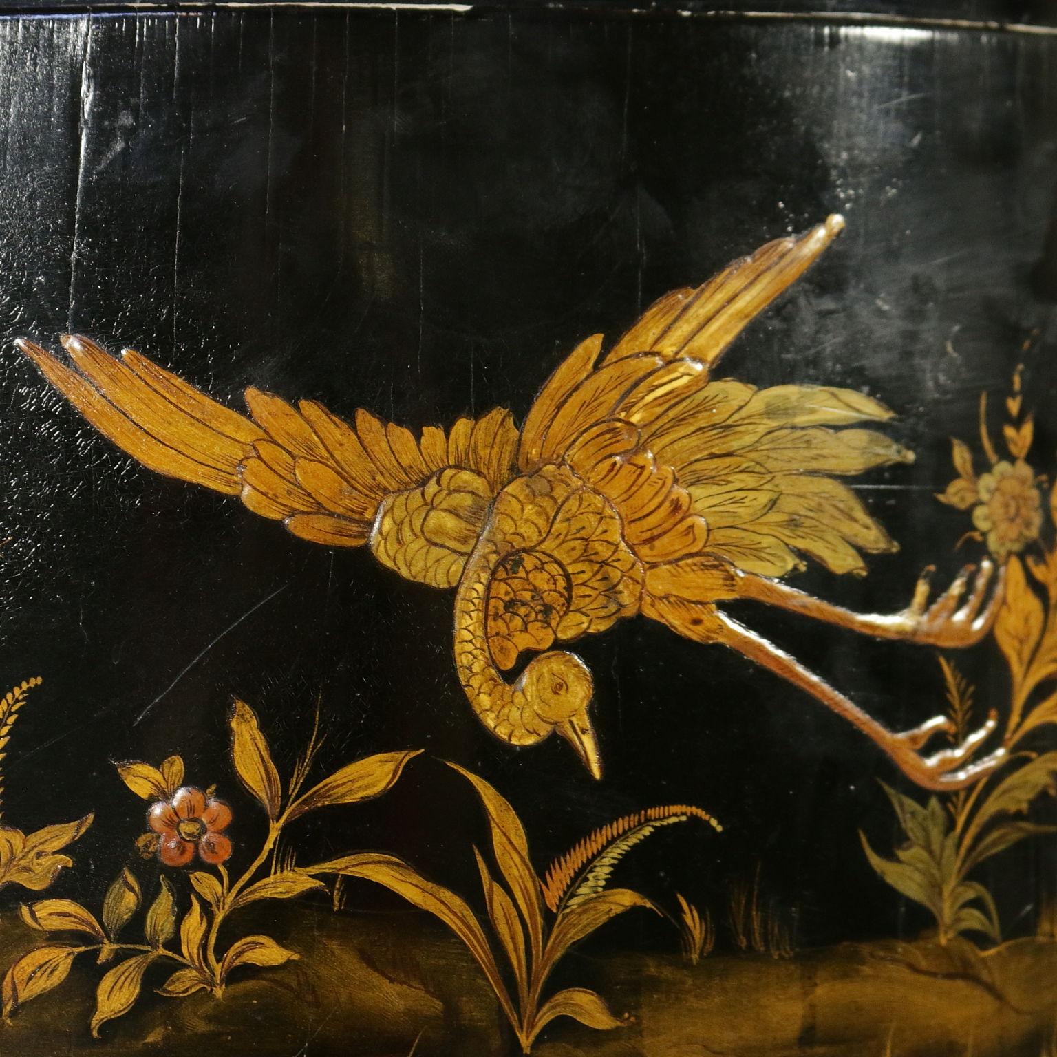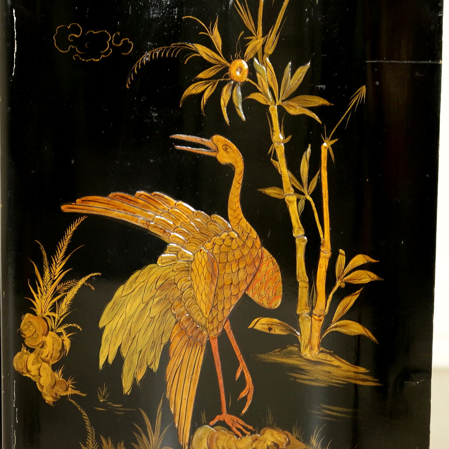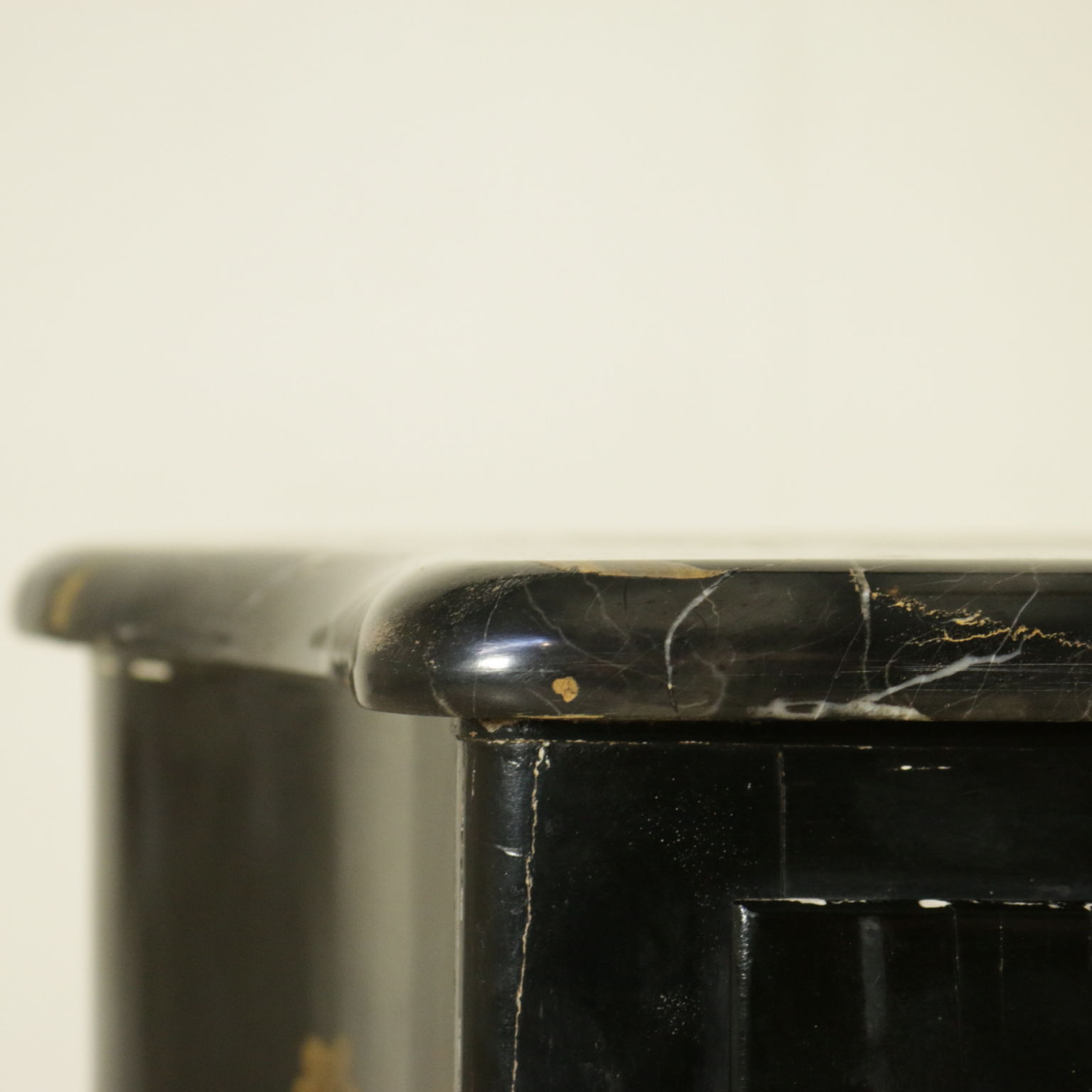 Mosso sul fronte e fianchi, presenta due cassetti e piano in marmo Portoro. Interamente laccato con decorazioni chinoiserie.