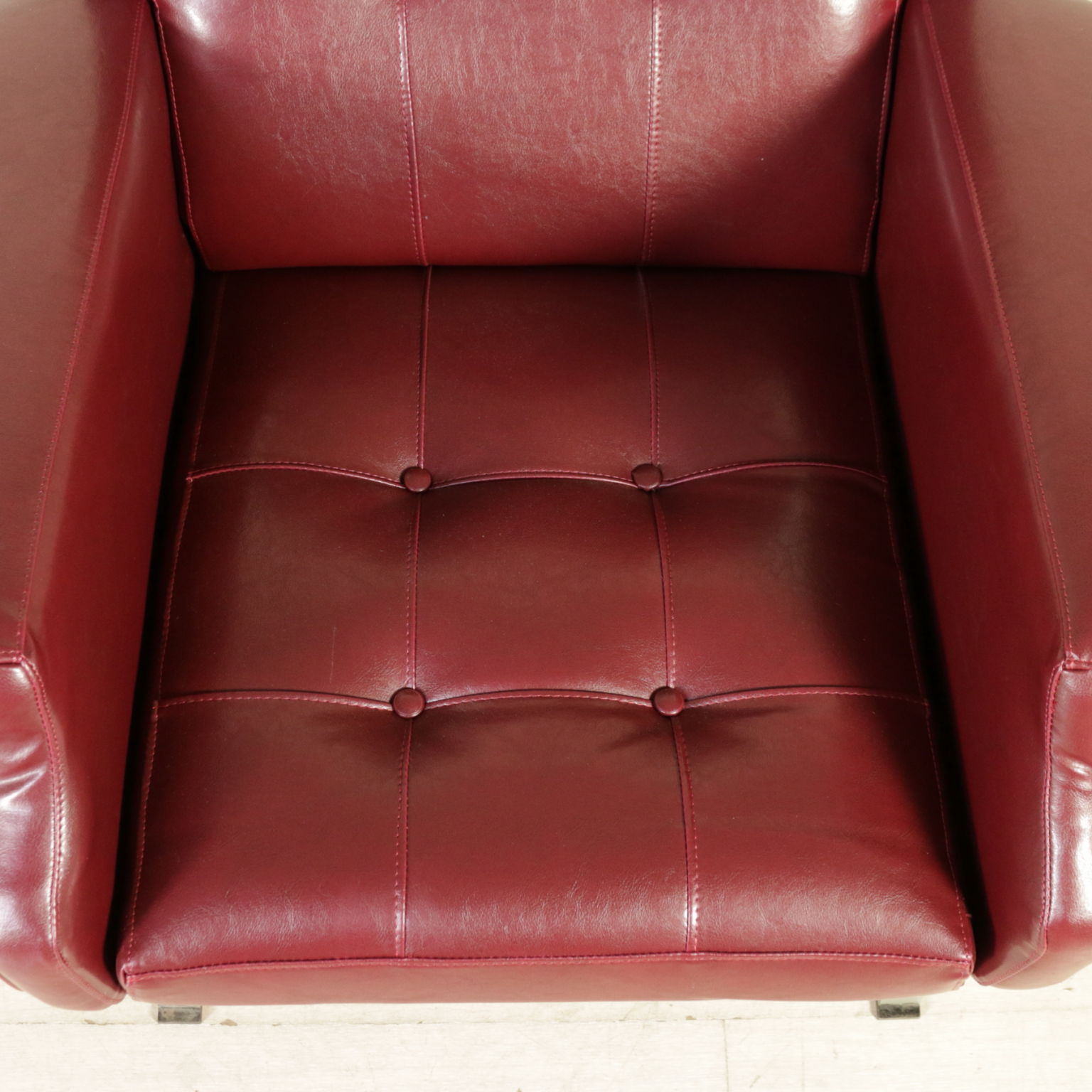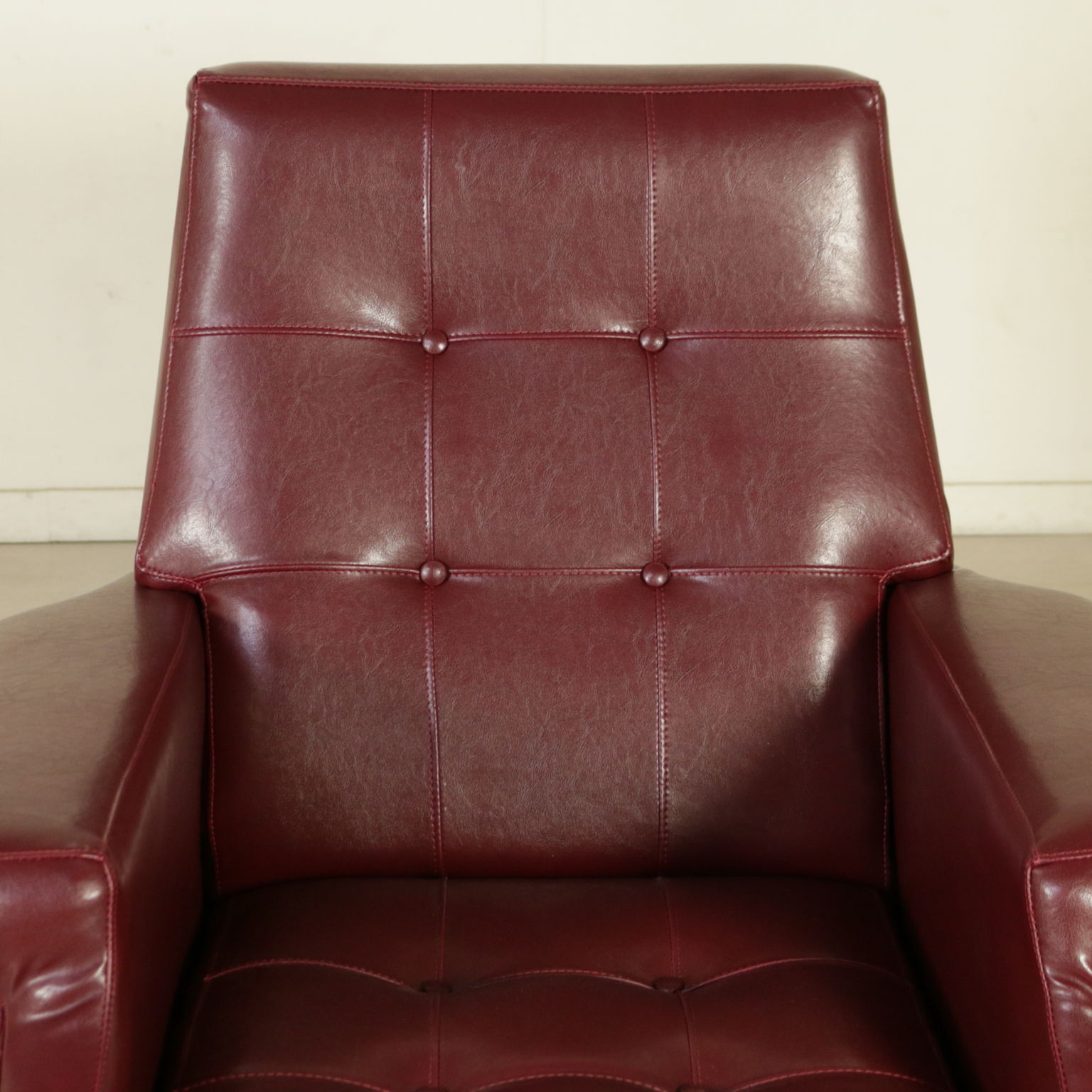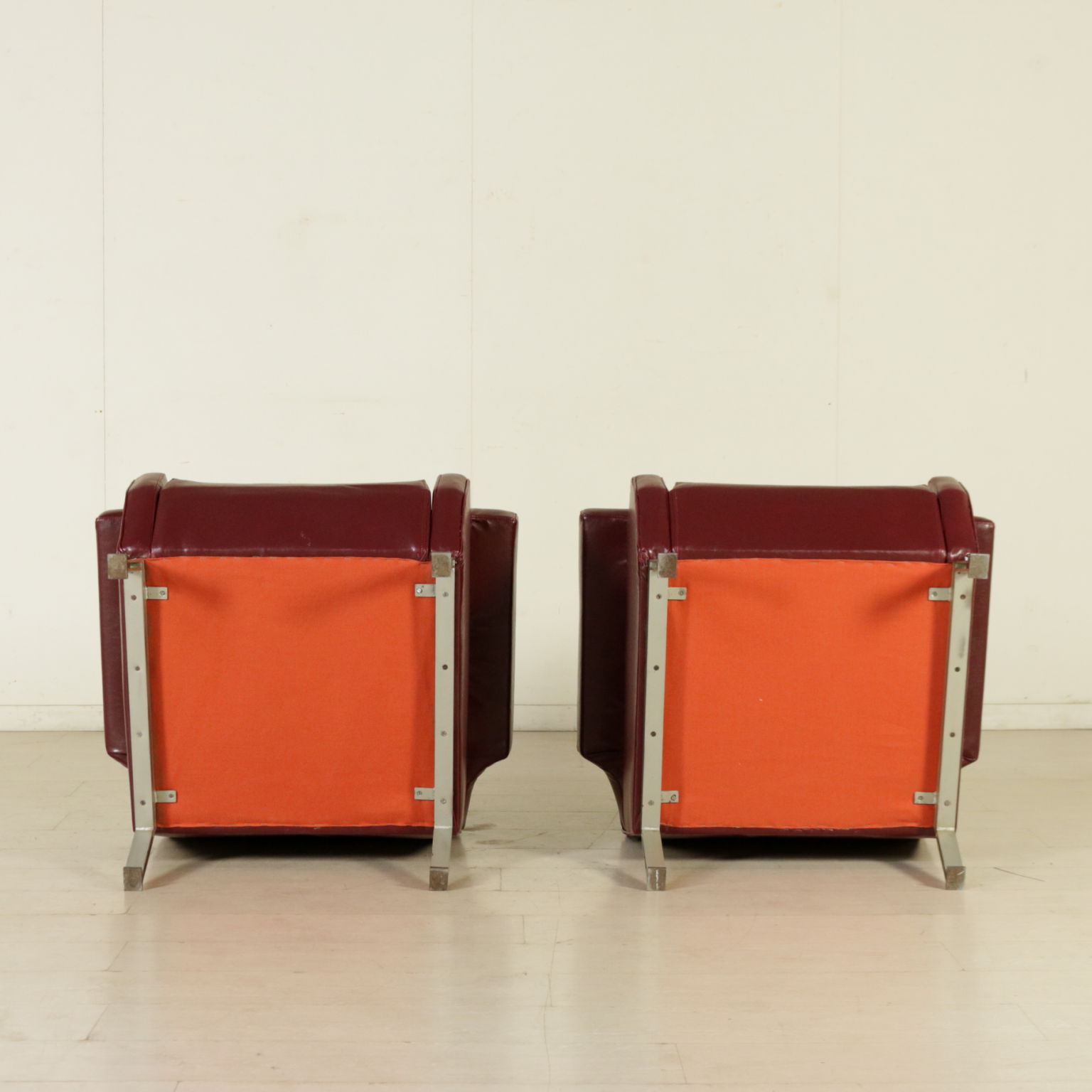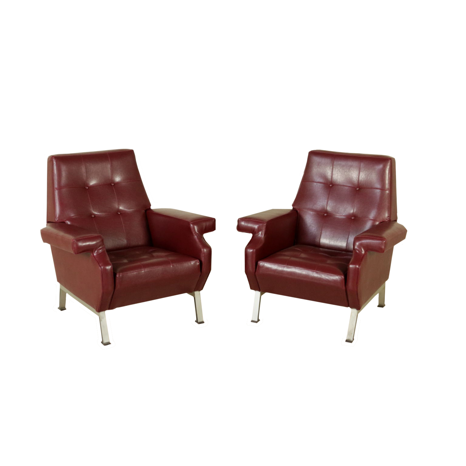 Coppia di poltrone; imbottitura in espanso, rivestimento in similpelle, gambe in metallo cromato.