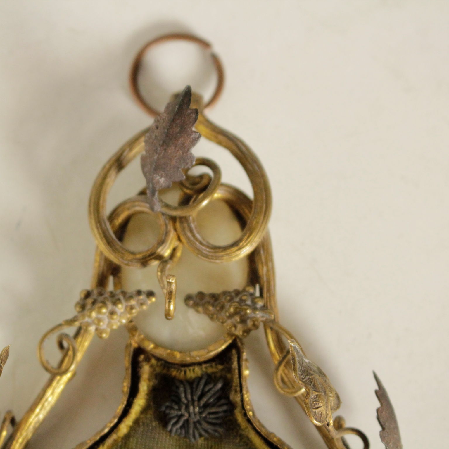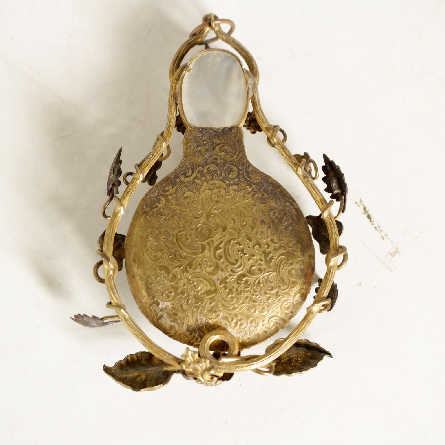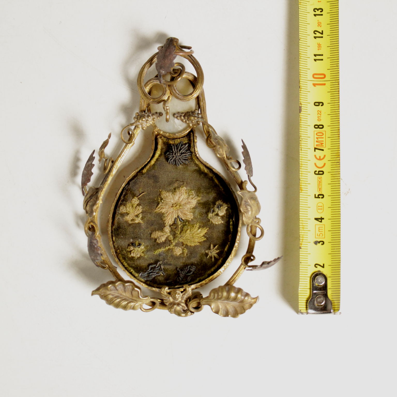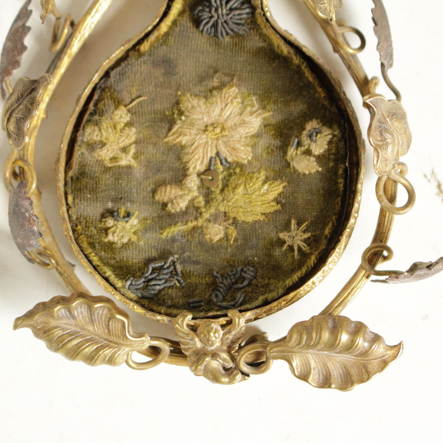 Portaorologio in bronzo dorato con stoffa ricamata e madreperla alla sommità. Decori a motivo vegetale con piccolo angioletto alla base.