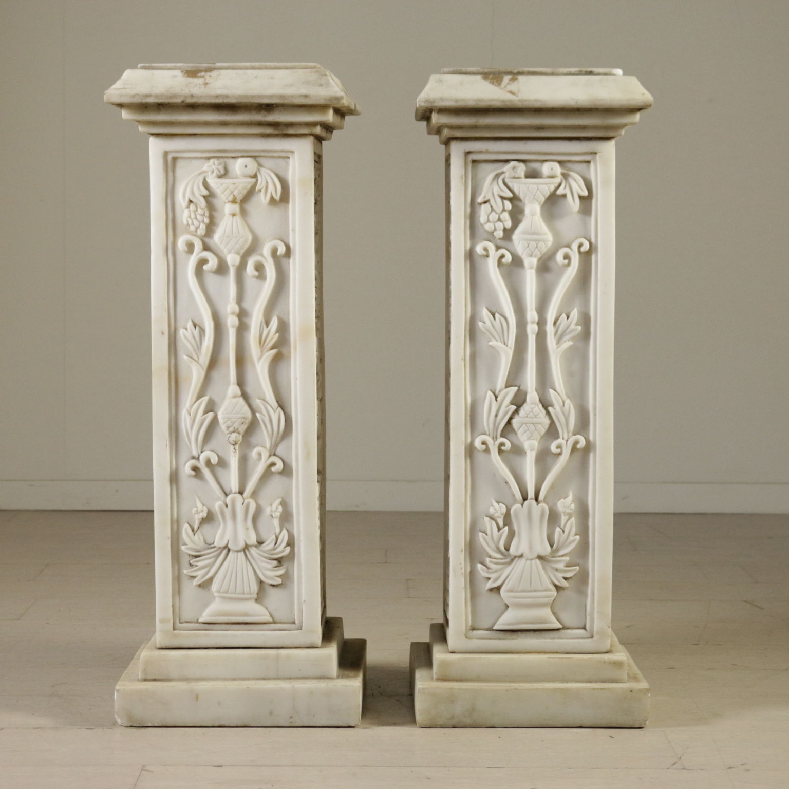 Coppia di colonne portastatua intagliate con motivi fogliacei. Basamento e piano quadrati.