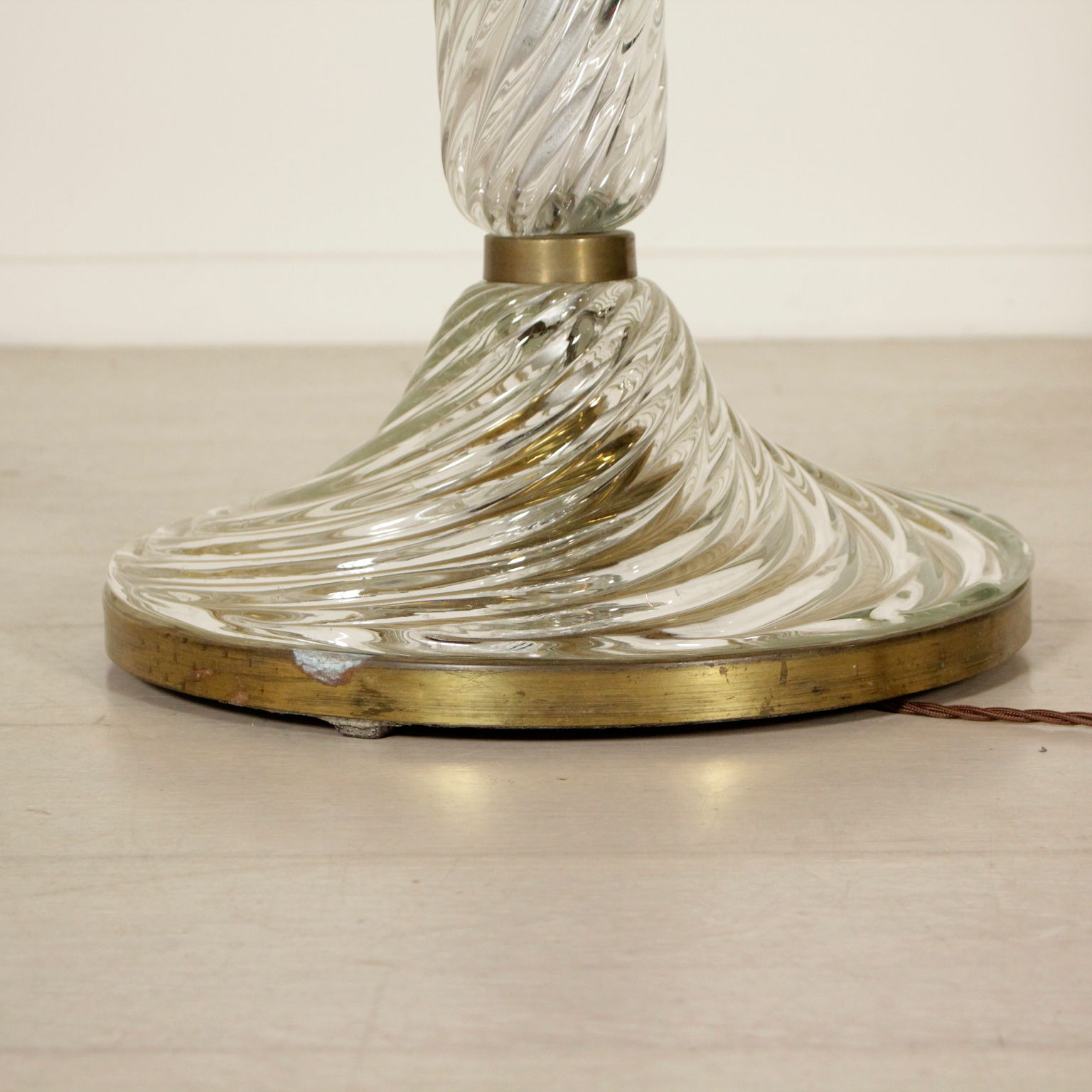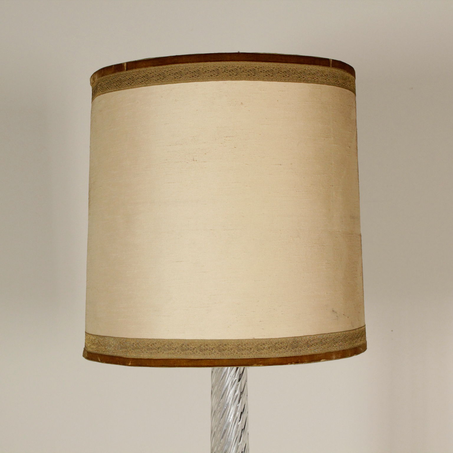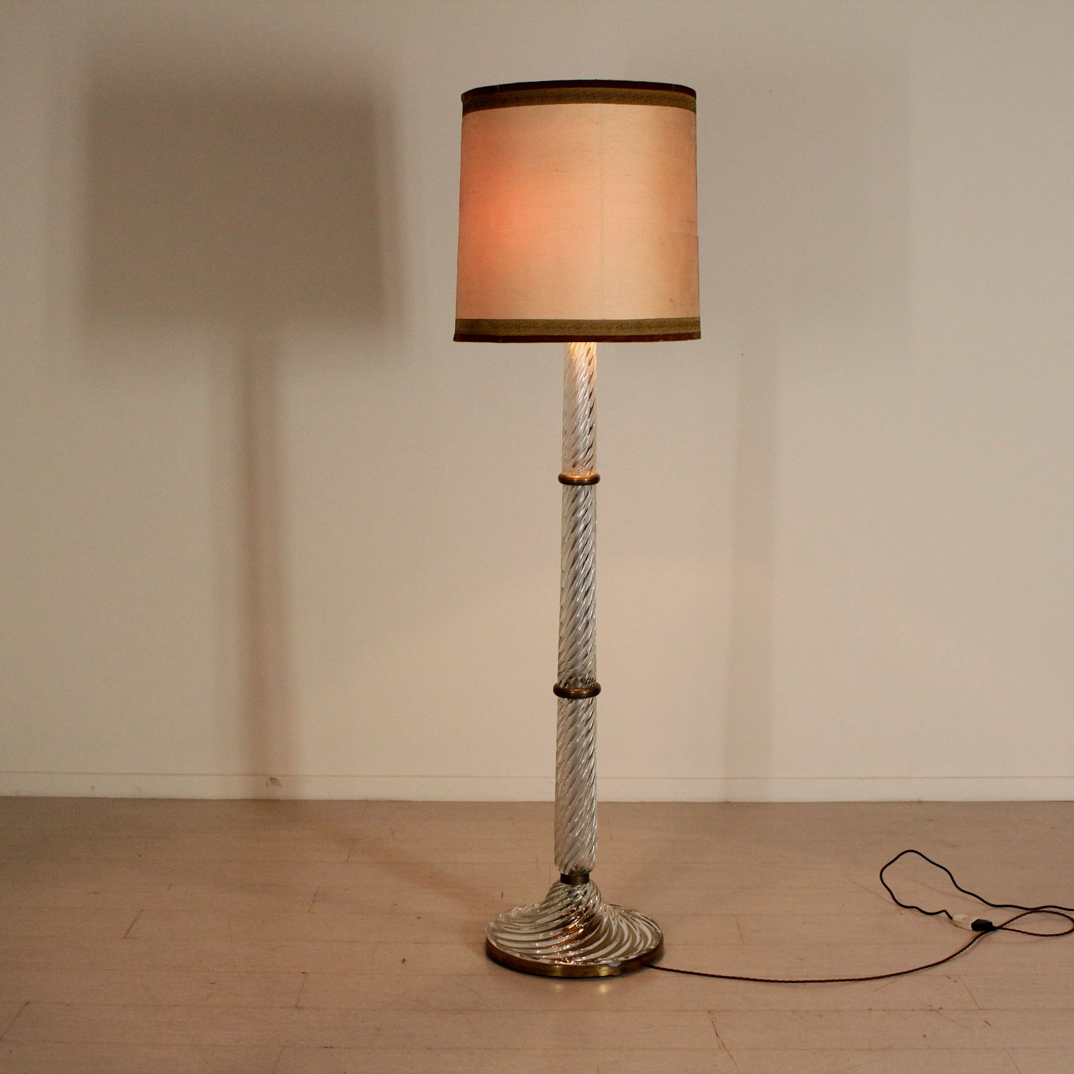 Lampada anni '40, da terra in vetro soffiato a "torciglione", ottone, paralume in tessuto.