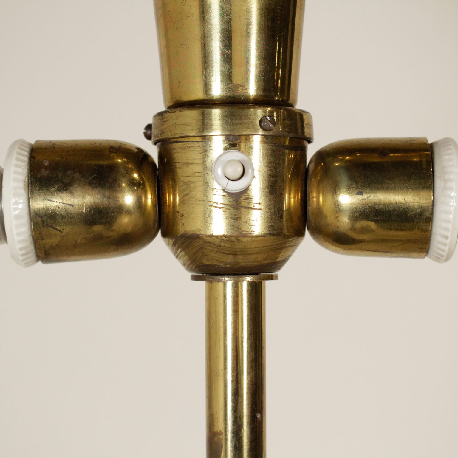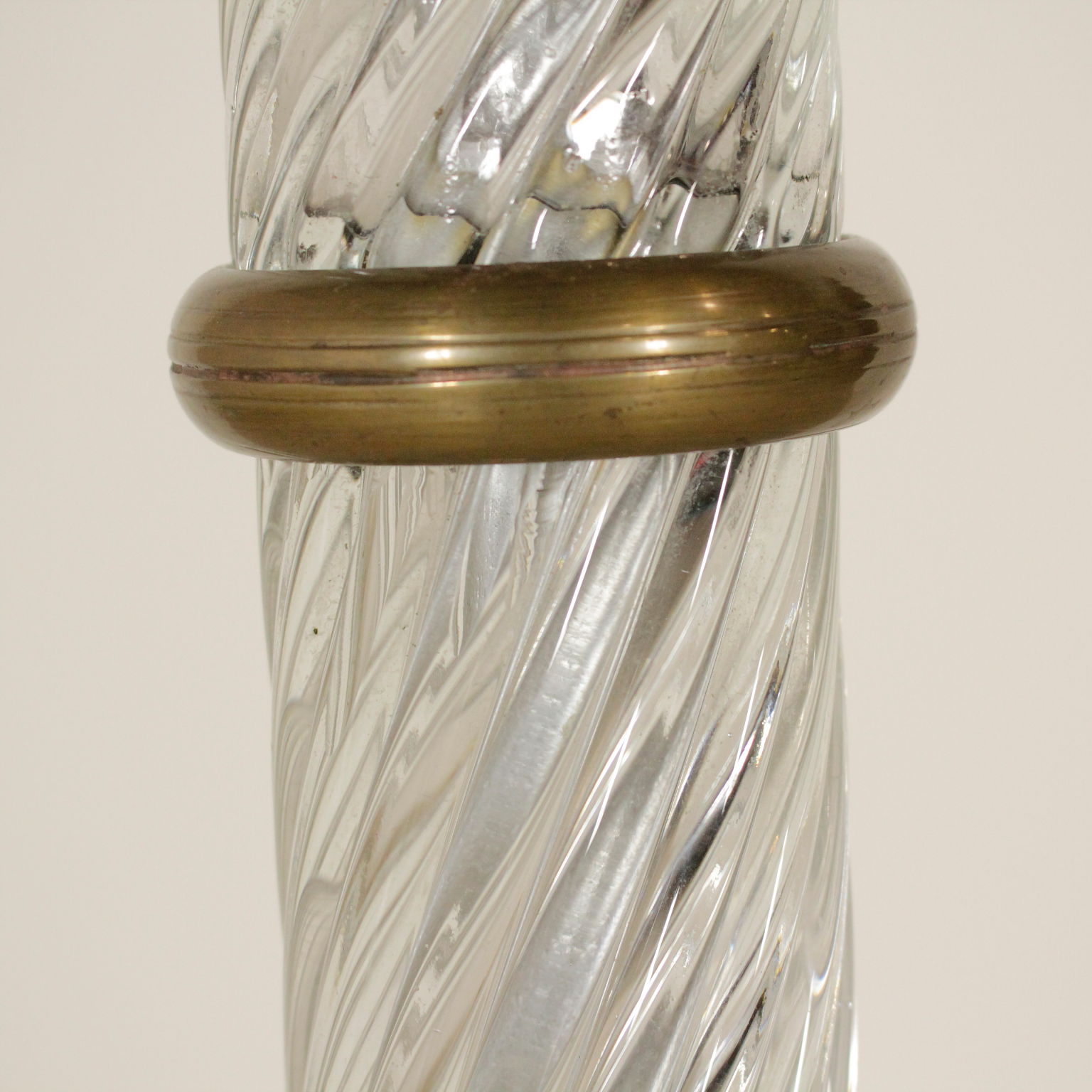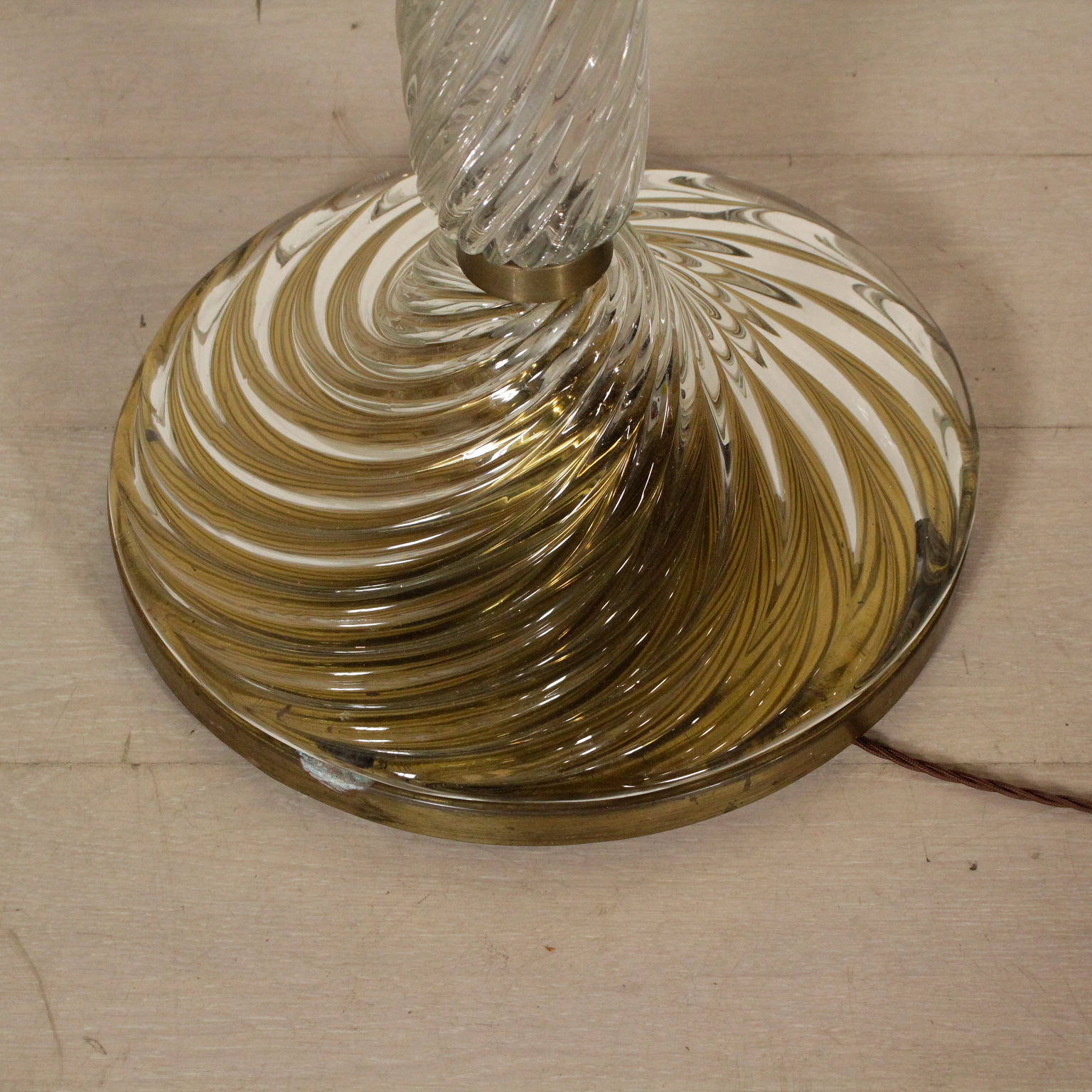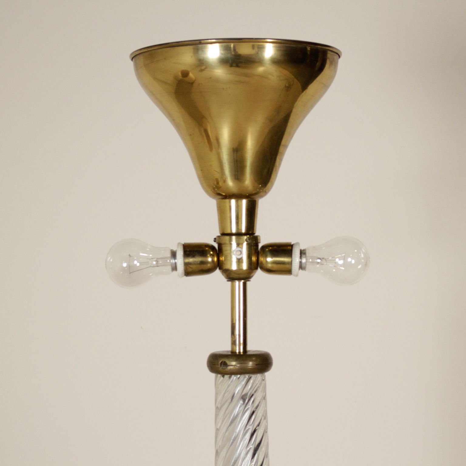 Lampada anni '40, da terra in vetro soffiato a "torciglione", ottone, paralume in tessuto.