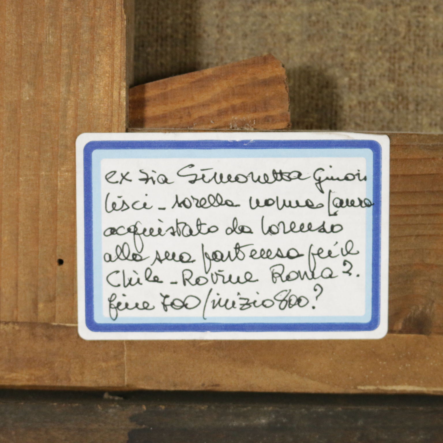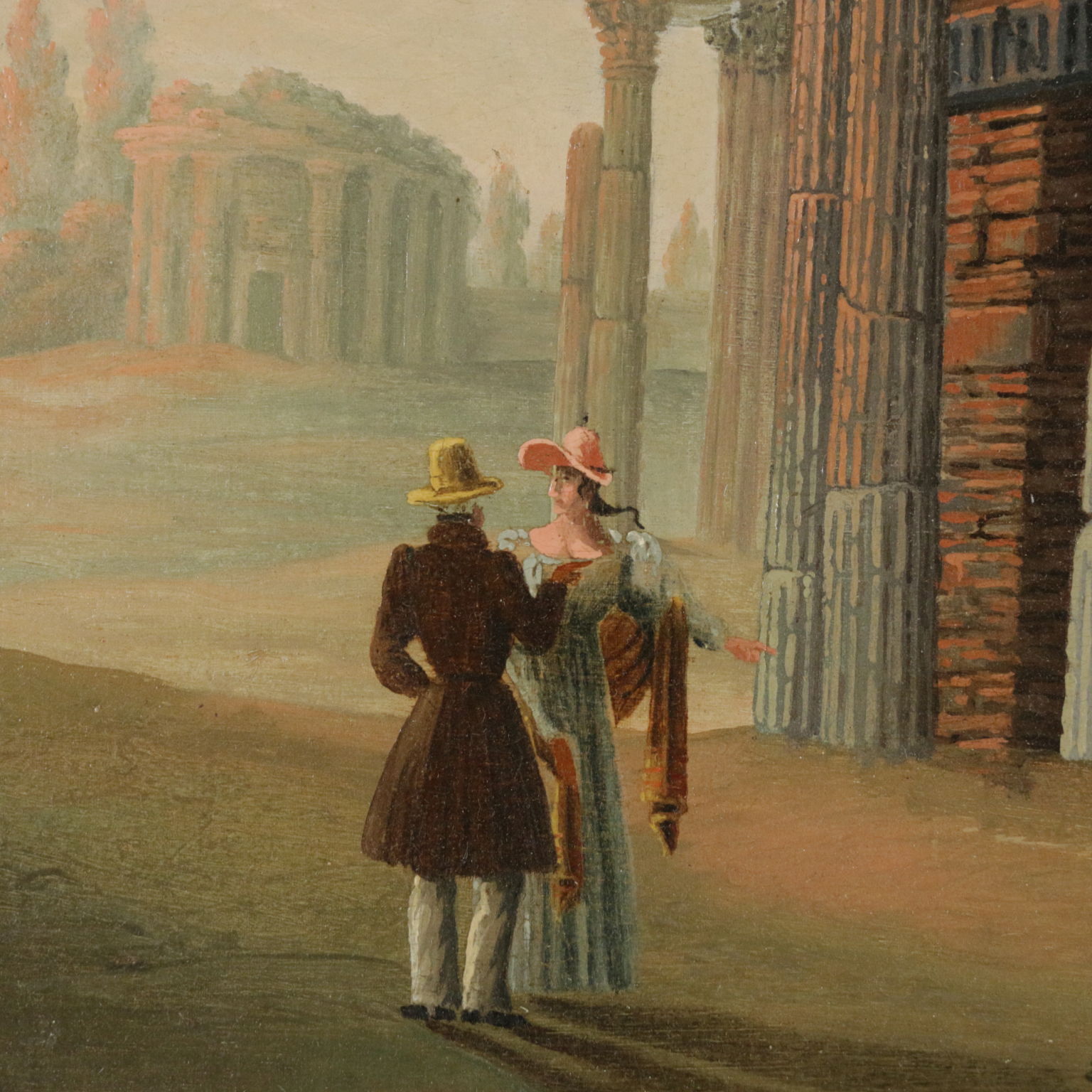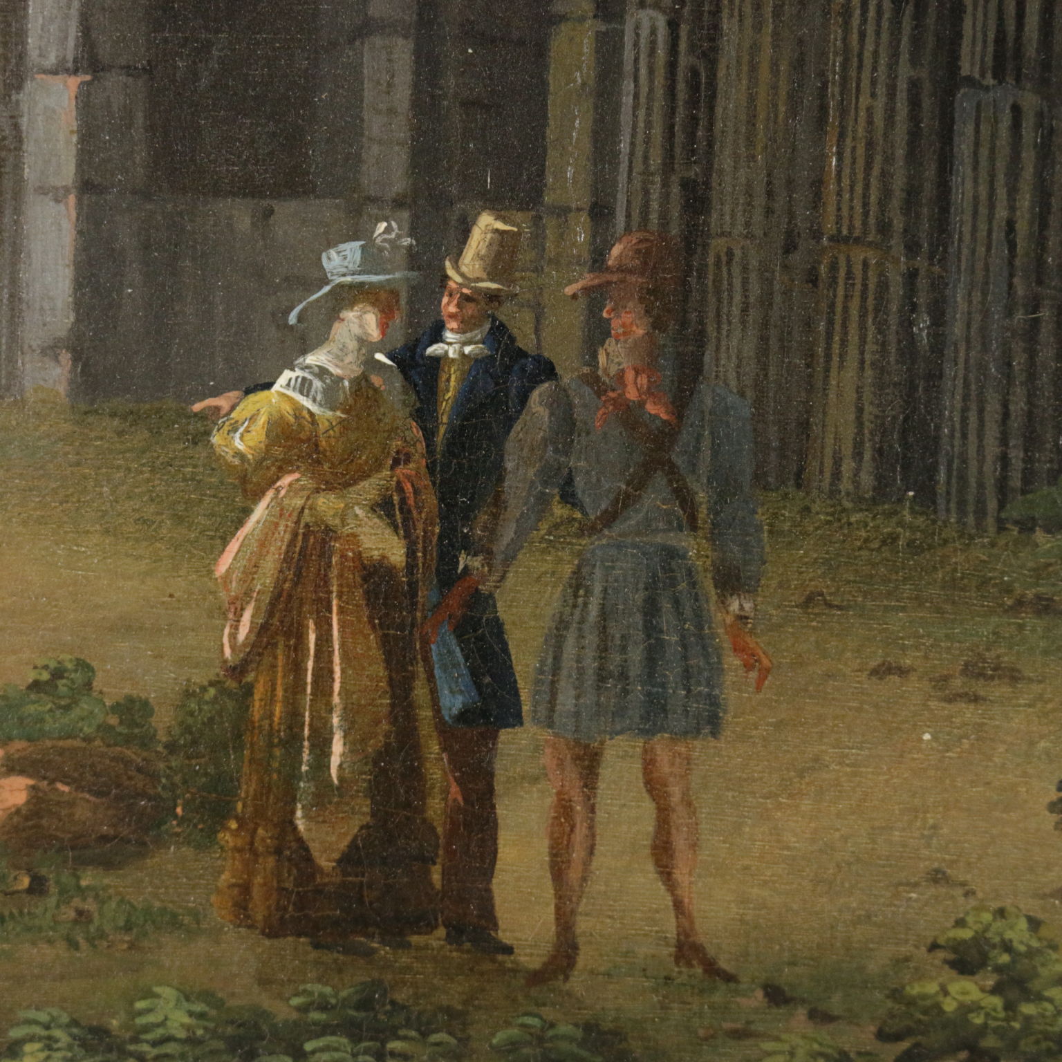 Olio su tela. Nella scena di gusto romantico alcune figure di dame e gentiluomini passeggiano in mezzo alle rovine classiche, nella luce dorata e soffusa di un calar del sole. Sul retro è presente etichetta con indicazione di provenienza dalla famiglia Ginori-Lisci, "acquistato da Lorenzo alla sua partenza per il Chile". Restaurato e ritelato, è presentato in cornice in stile.