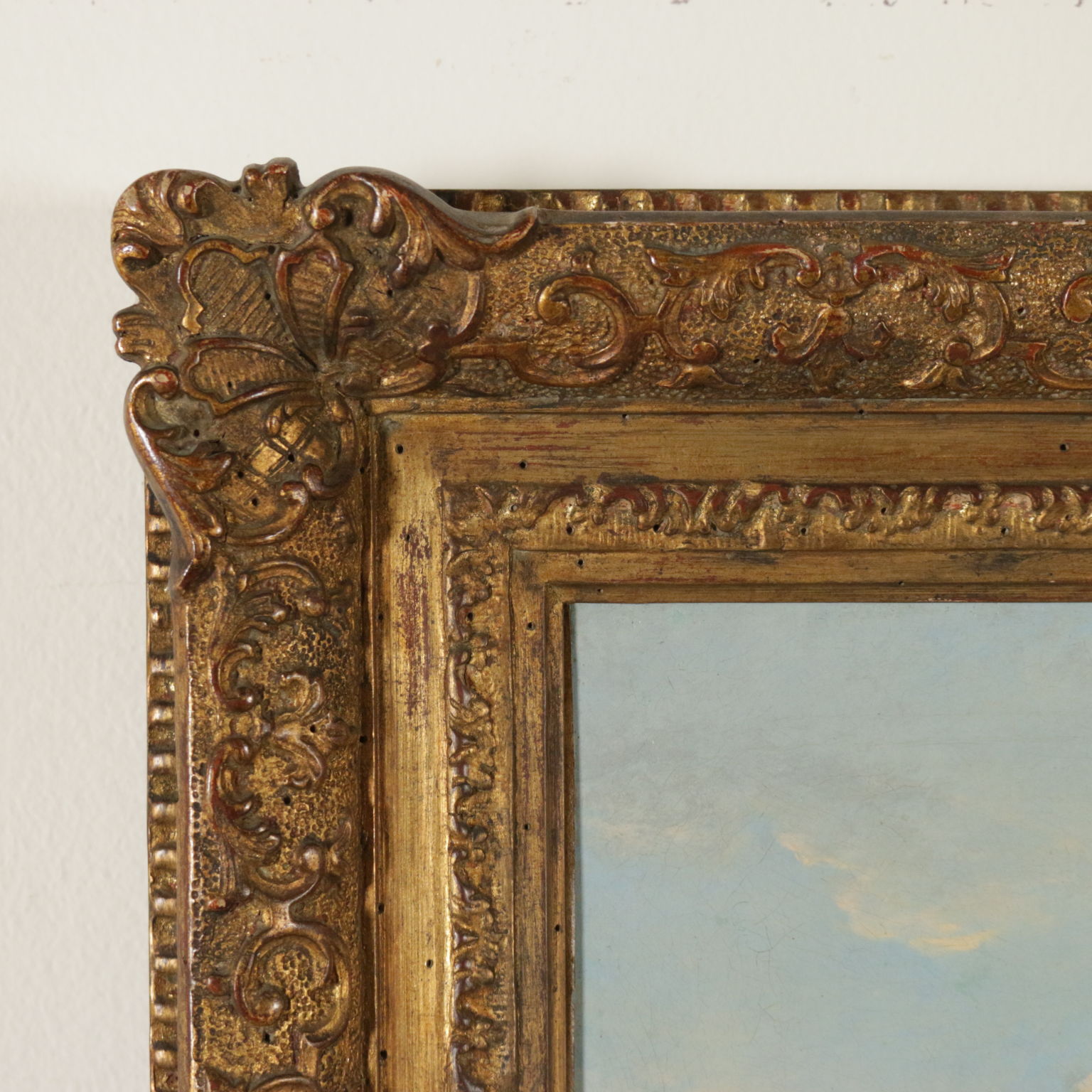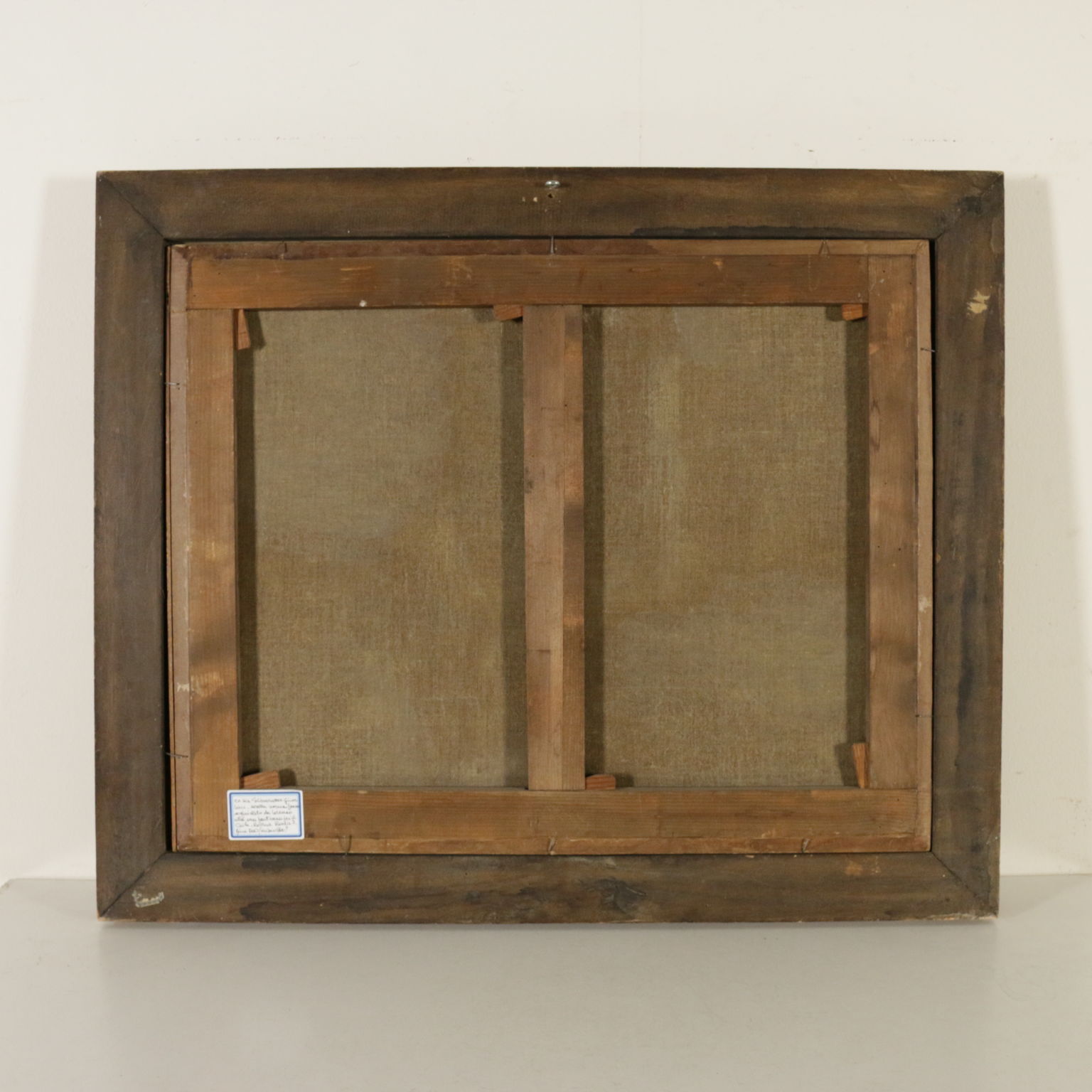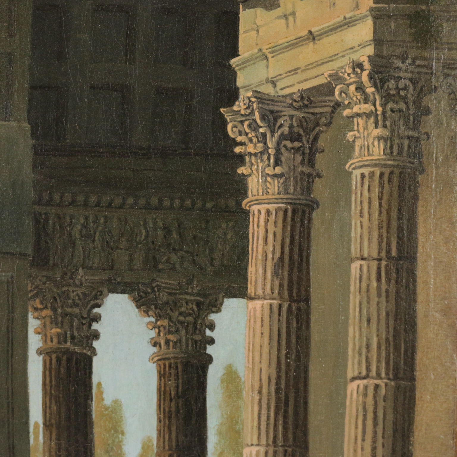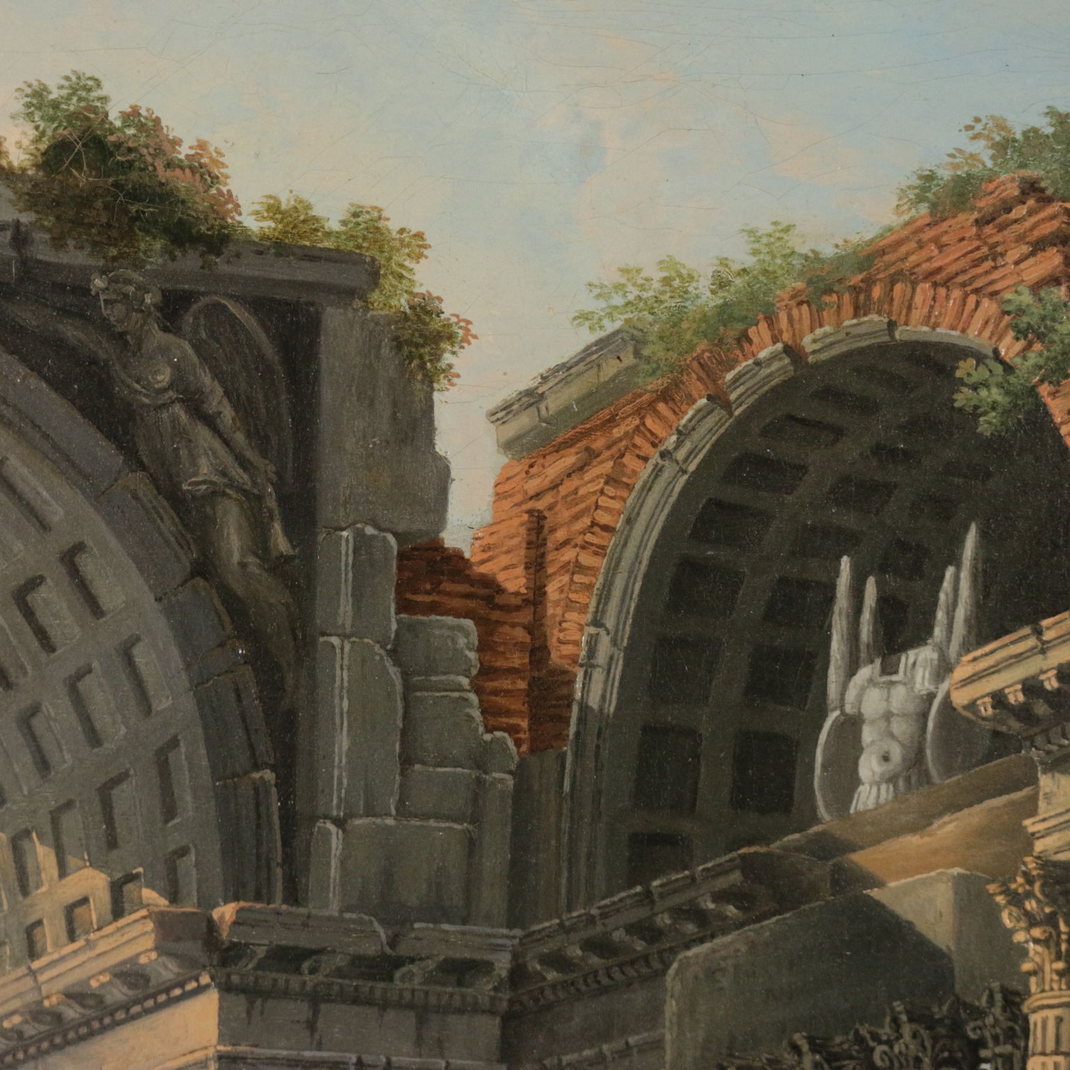 Olio su tela. Nella scena di gusto romantico alcune figure di dame e gentiluomini passeggiano in mezzo alle rovine classiche, nella luce dorata e soffusa di un calar del sole. Sul retro è presente etichetta con indicazione di provenienza dalla famiglia Ginori-Lisci, "acquistato da Lorenzo alla sua partenza per il Chile". Restaurato e ritelato, è presentato in cornice in stile.