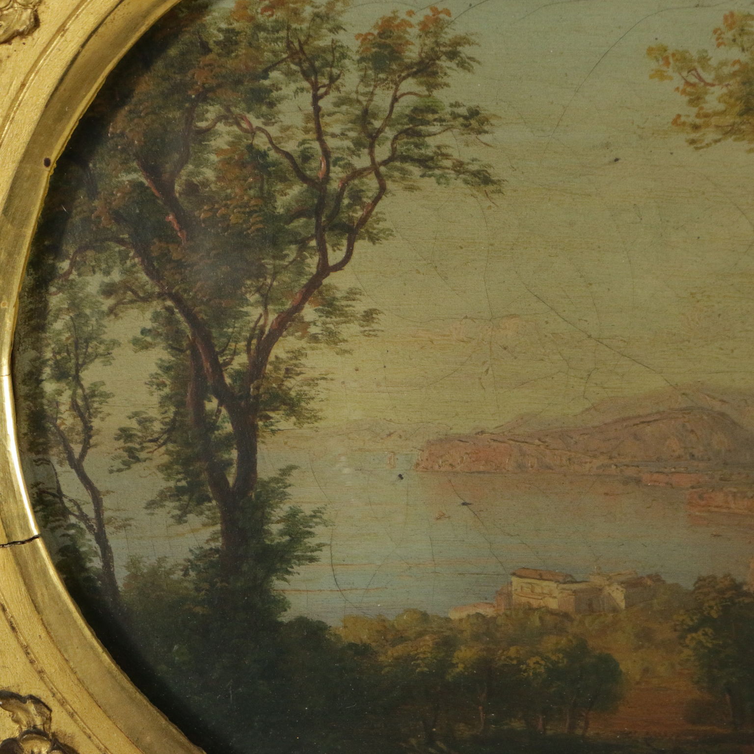Olio su tela. Le due graziose vedute - che raffigurano il golfo di Sorrento e un tratto di scogliera con figure e casetta - ben esprimono per luminosità, spirito romantico e soggetto, lo spirito degli artisti della scuola pittorica di Posillipo. Presentati in belle cornice dorate coeve.