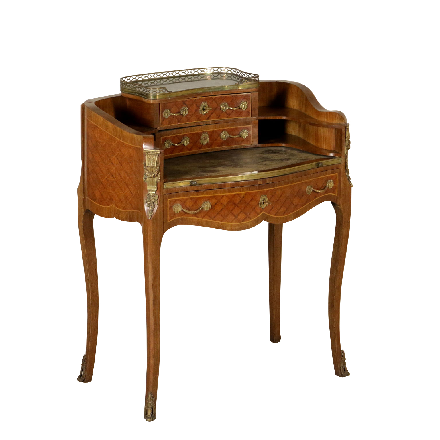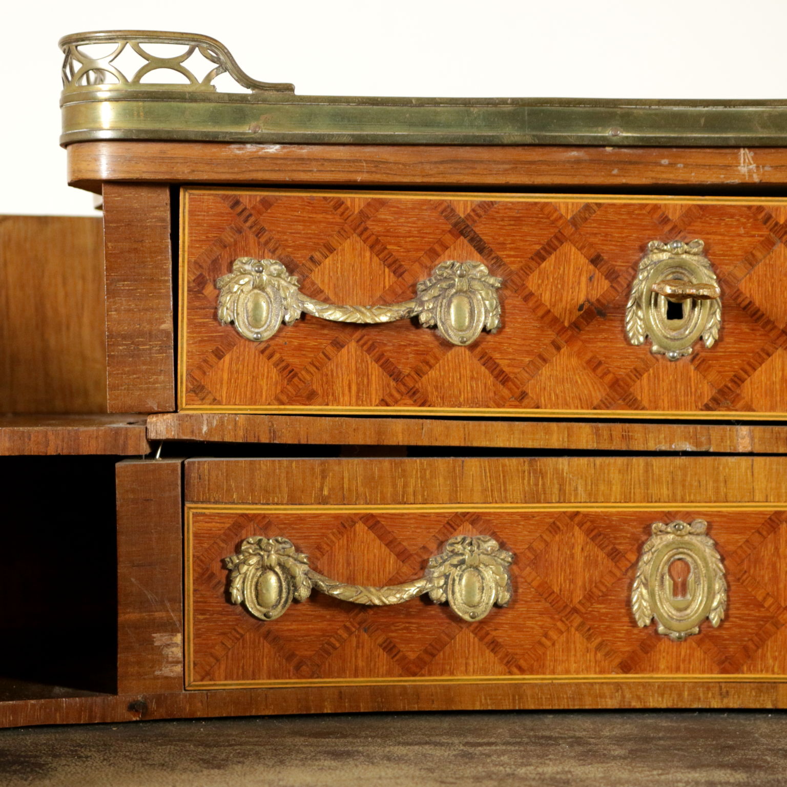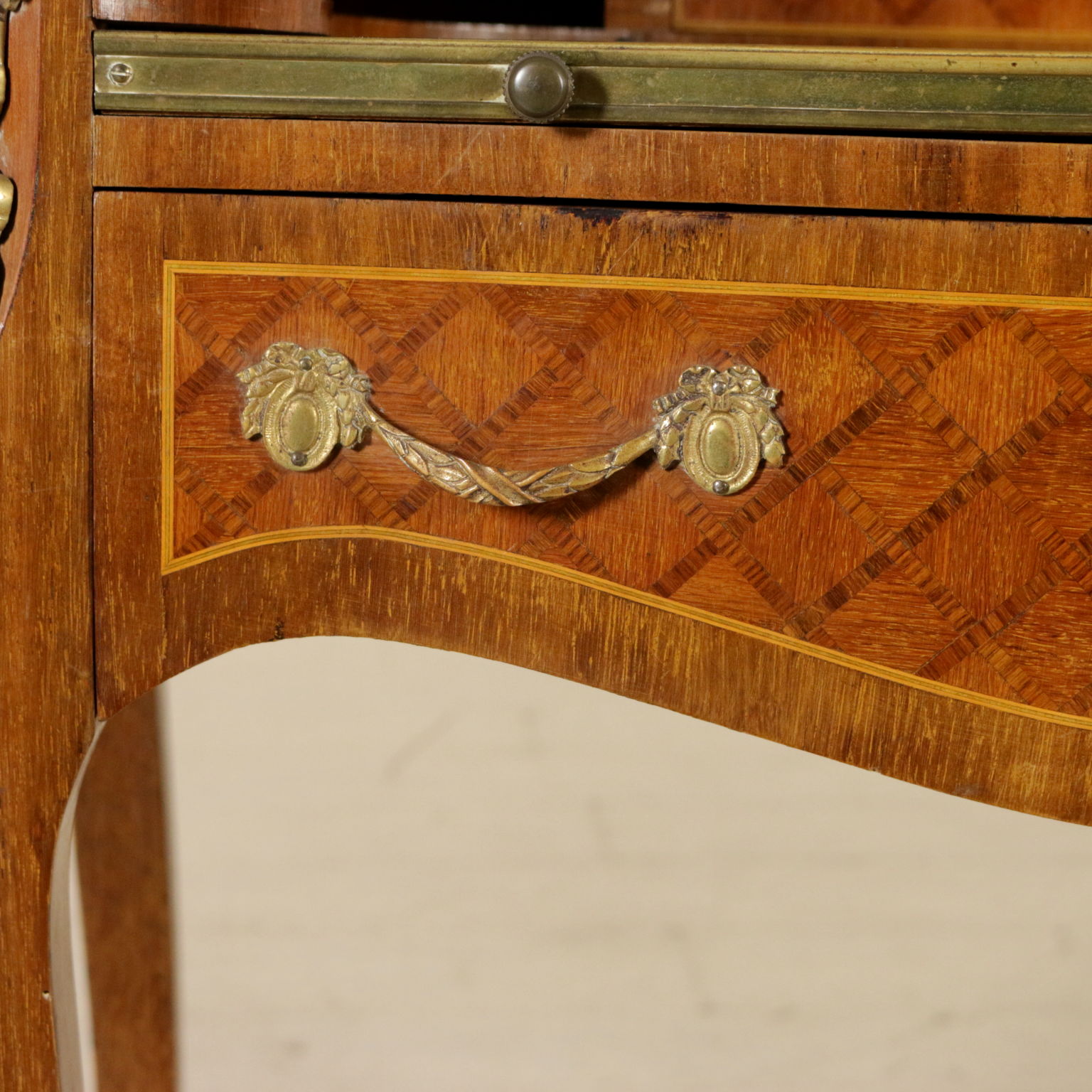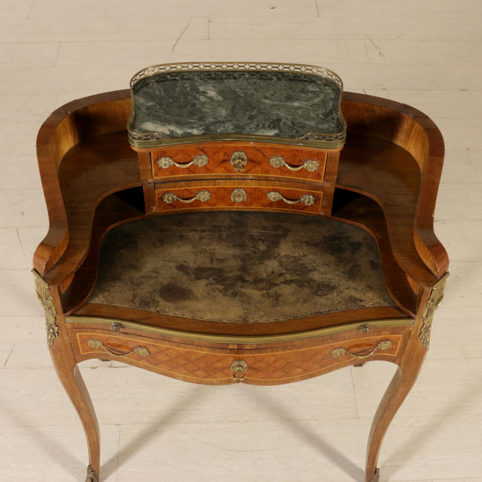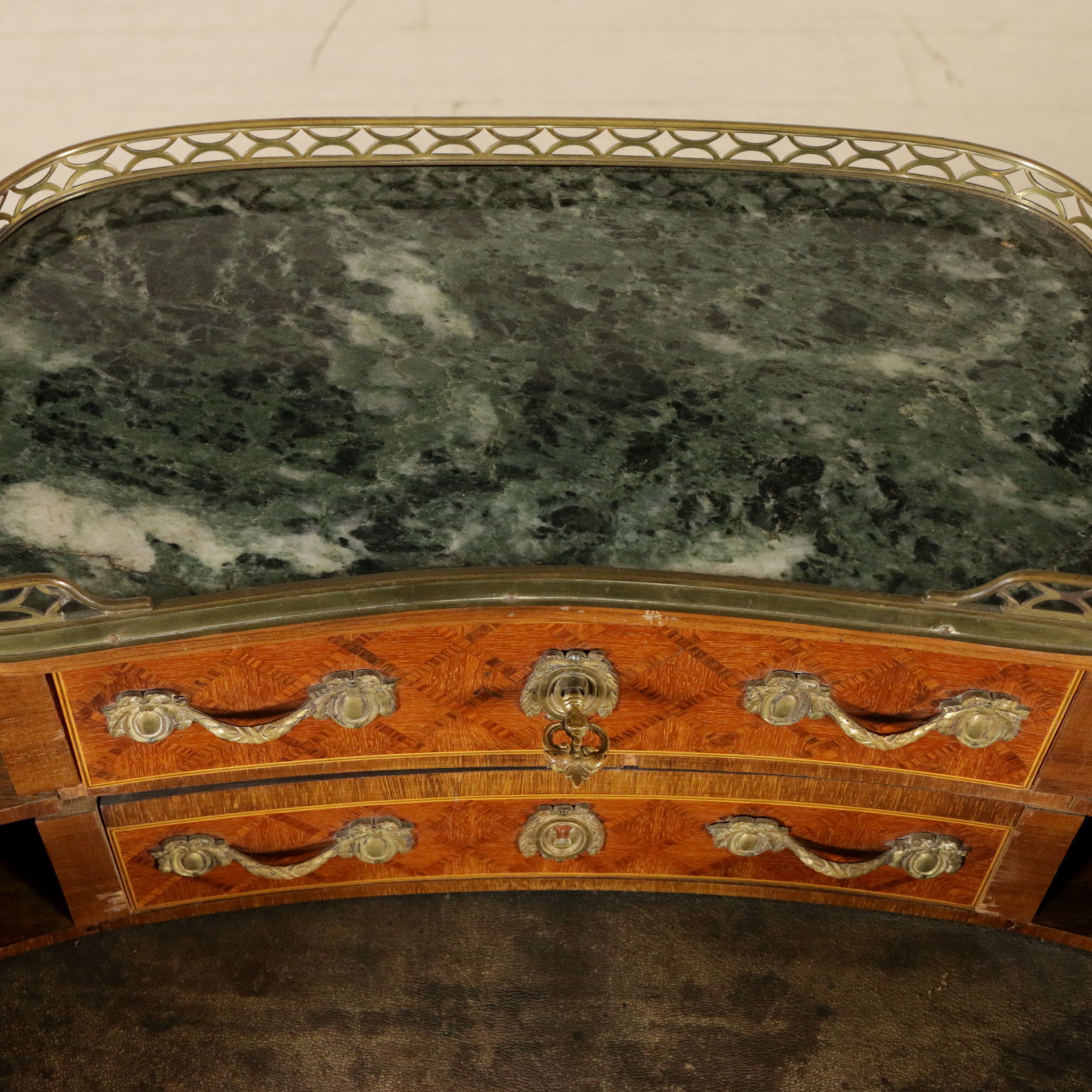 Elegante scrittoio da centro dalla linea mossa, presenta un cassetto e piano con inserto estraibile in pelle. L'alzata con vani a giorno presenta due cassetti e piccolo piano con marmo. Impreziosito da intarsi a marquettere, fregi e cornici in bronzo dorato.