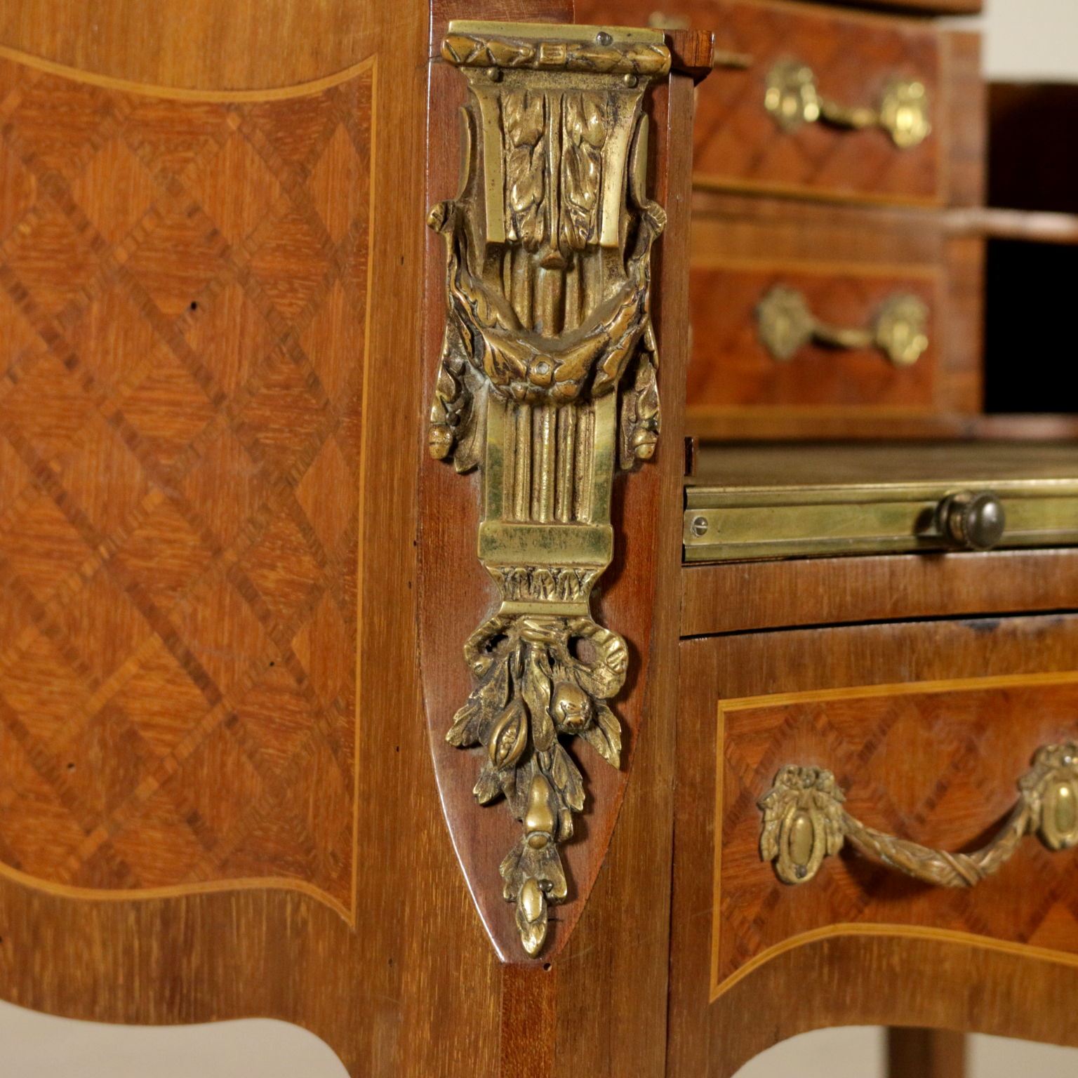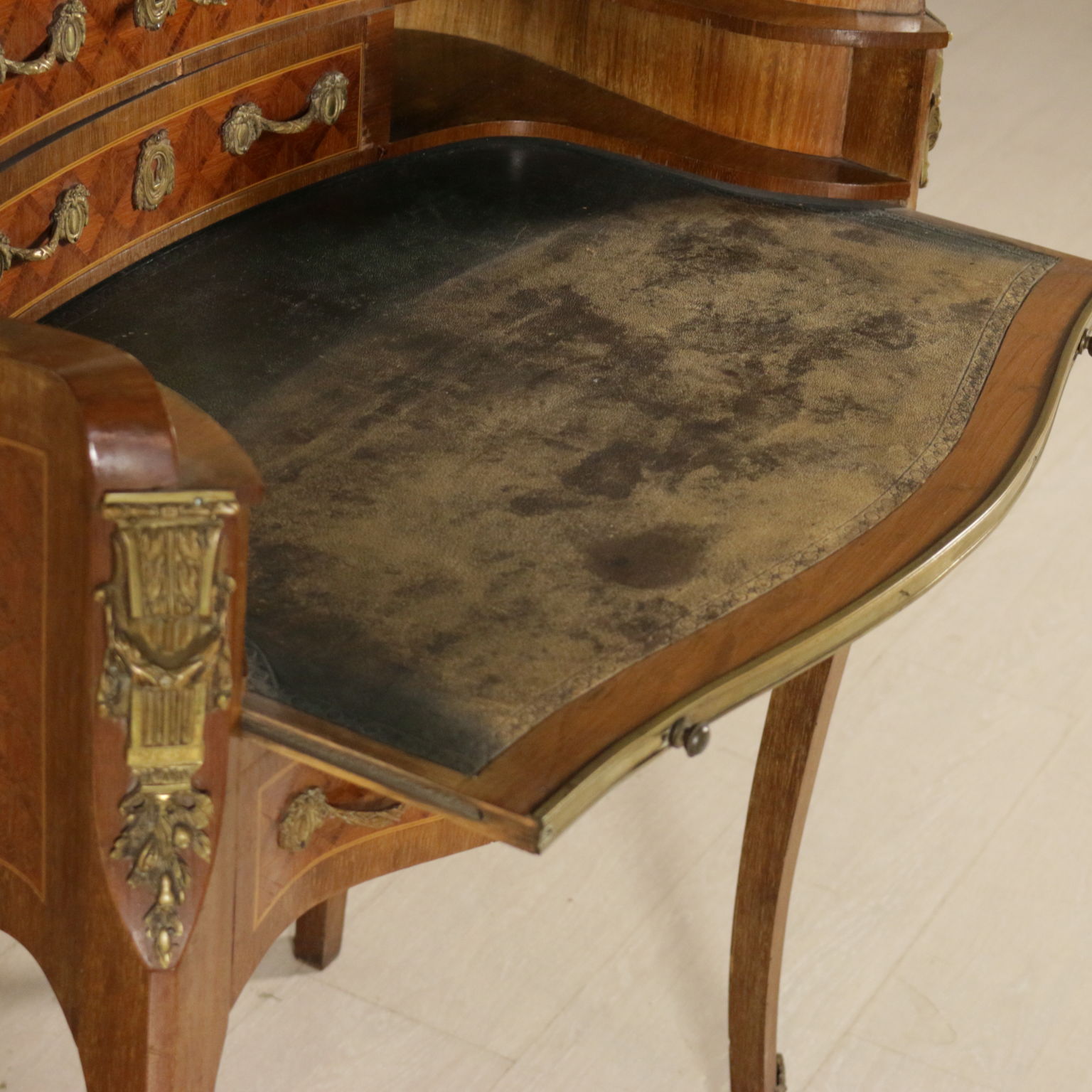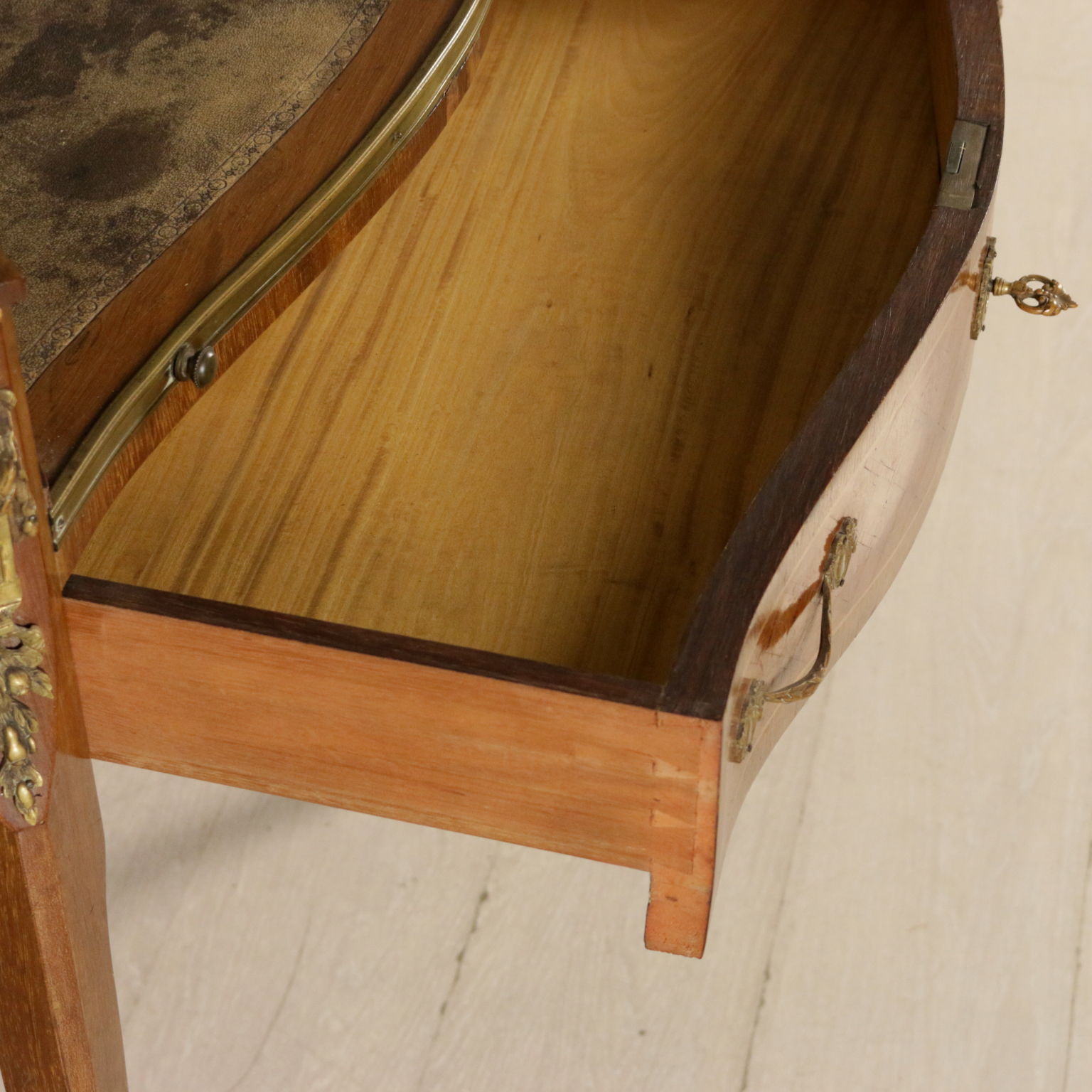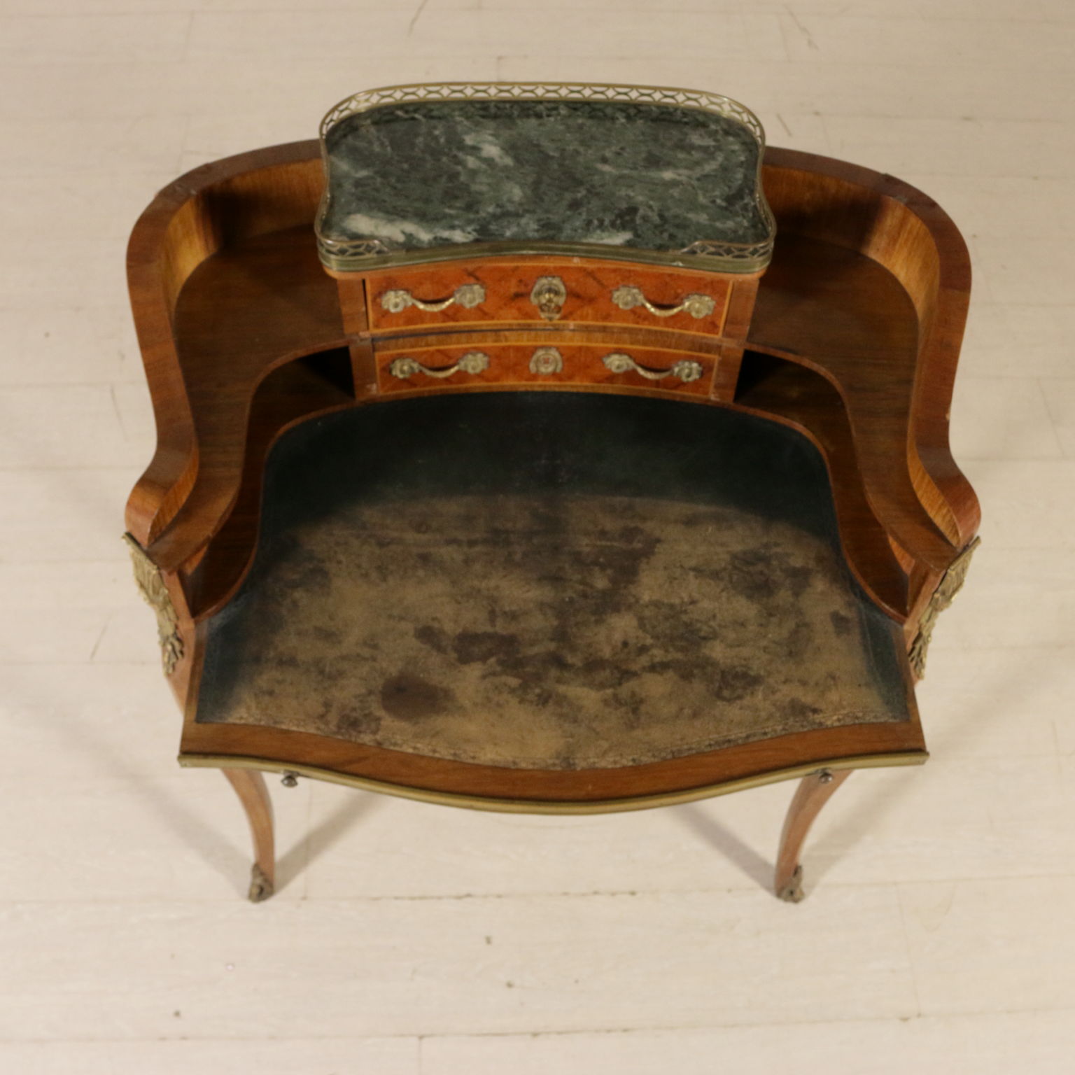 Elegante scrittoio da centro dalla linea mossa, presenta un cassetto e piano con inserto estraibile in pelle. L'alzata con vani a giorno presenta due cassetti e piccolo piano con marmo. Impreziosito da intarsi a marquettere, fregi e cornici in bronzo dorato.