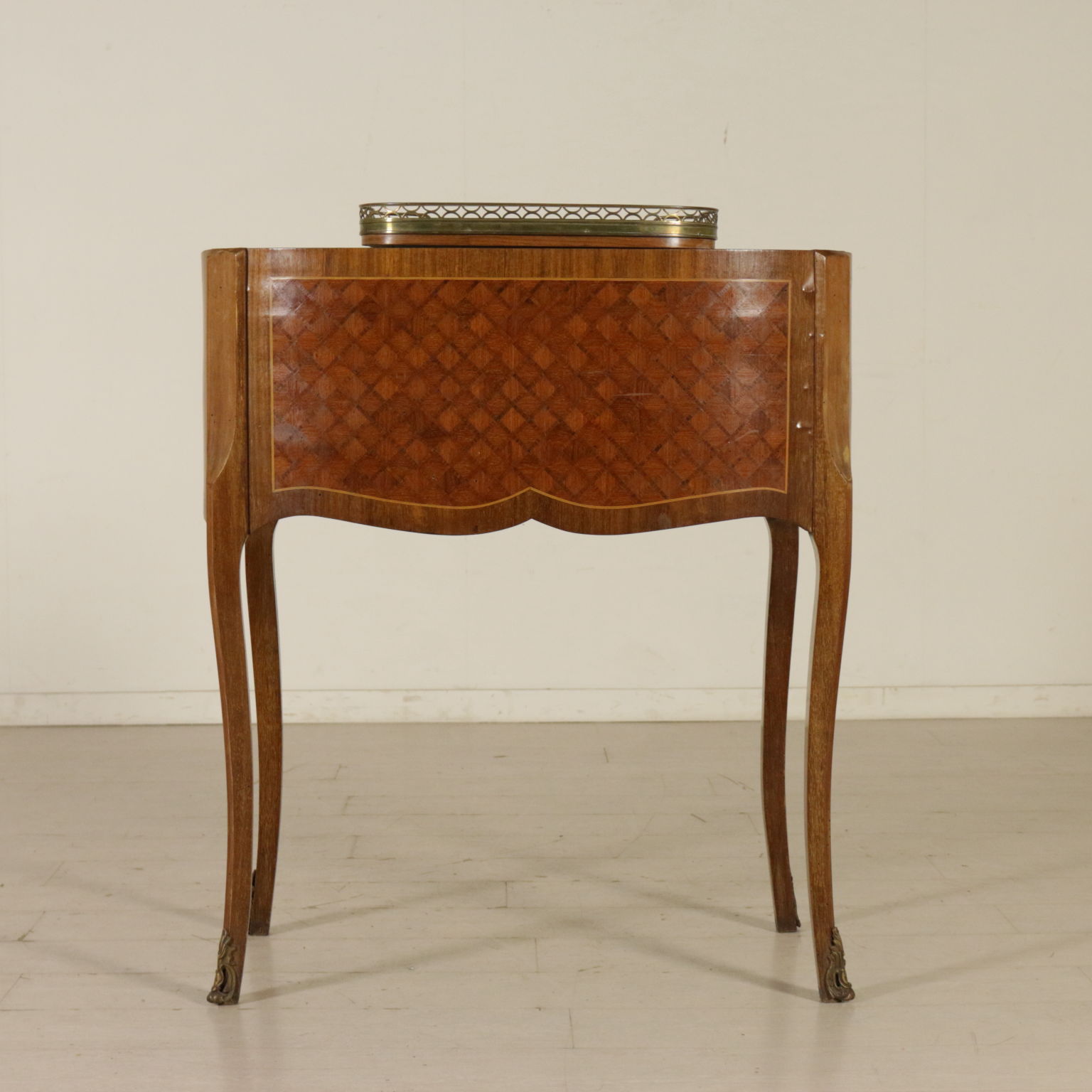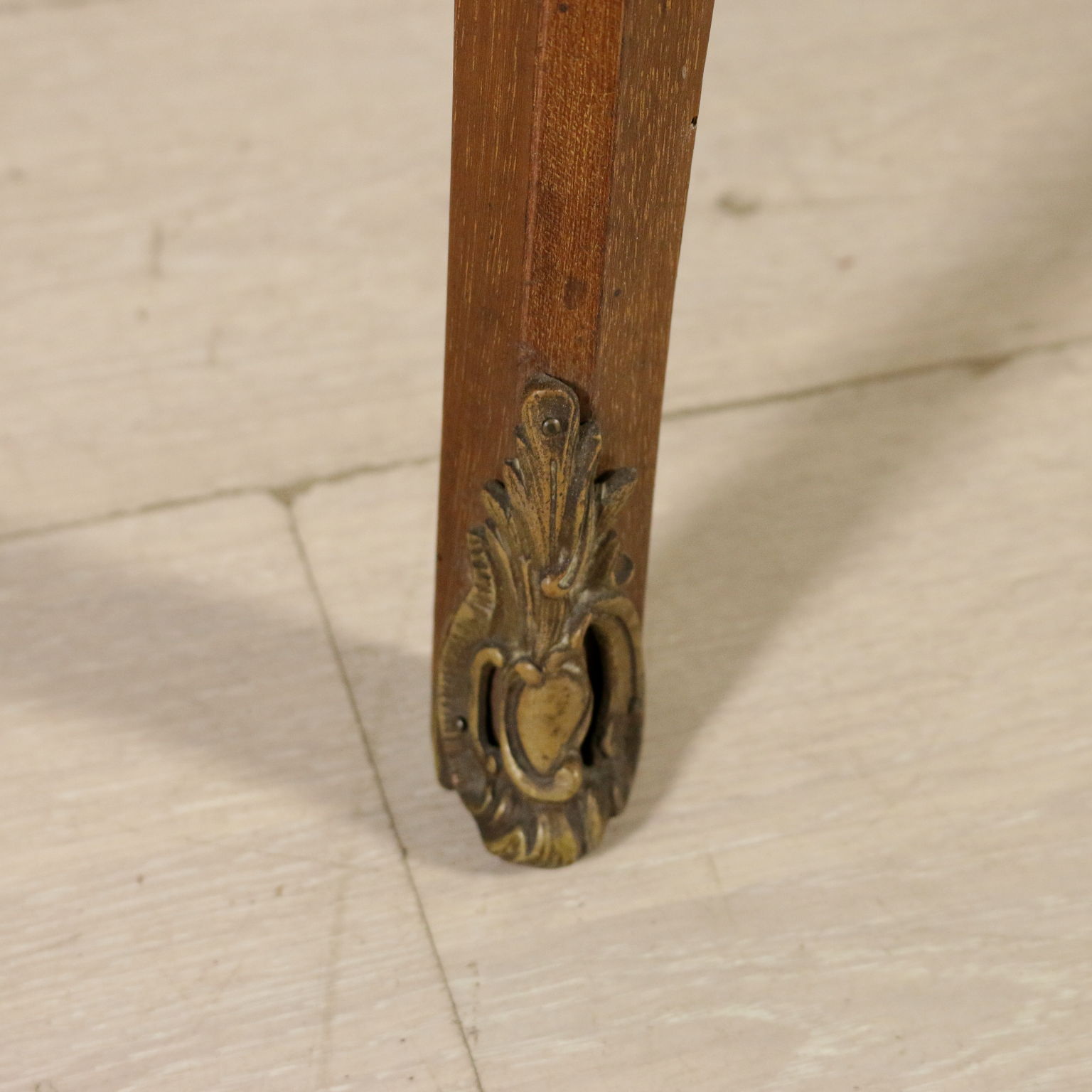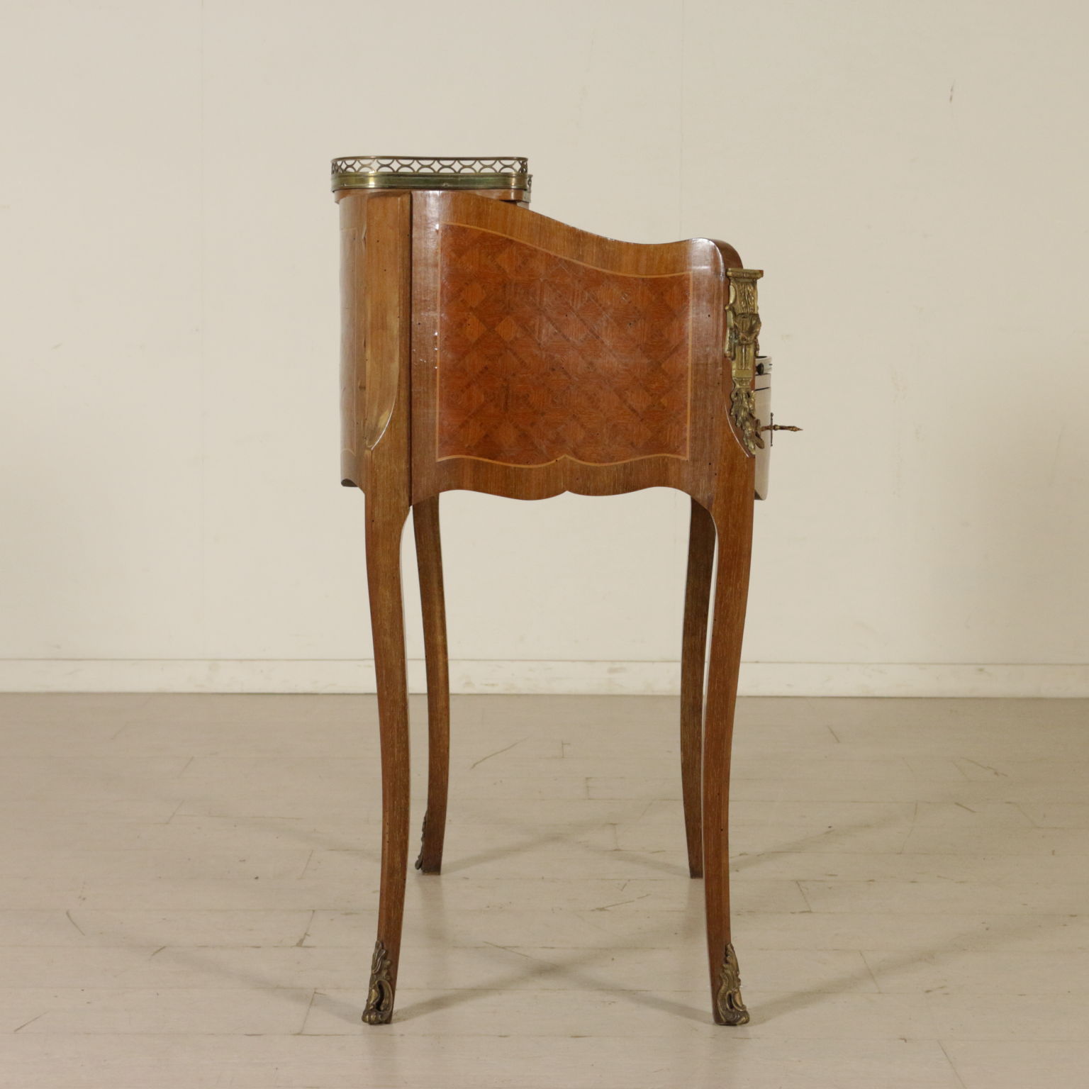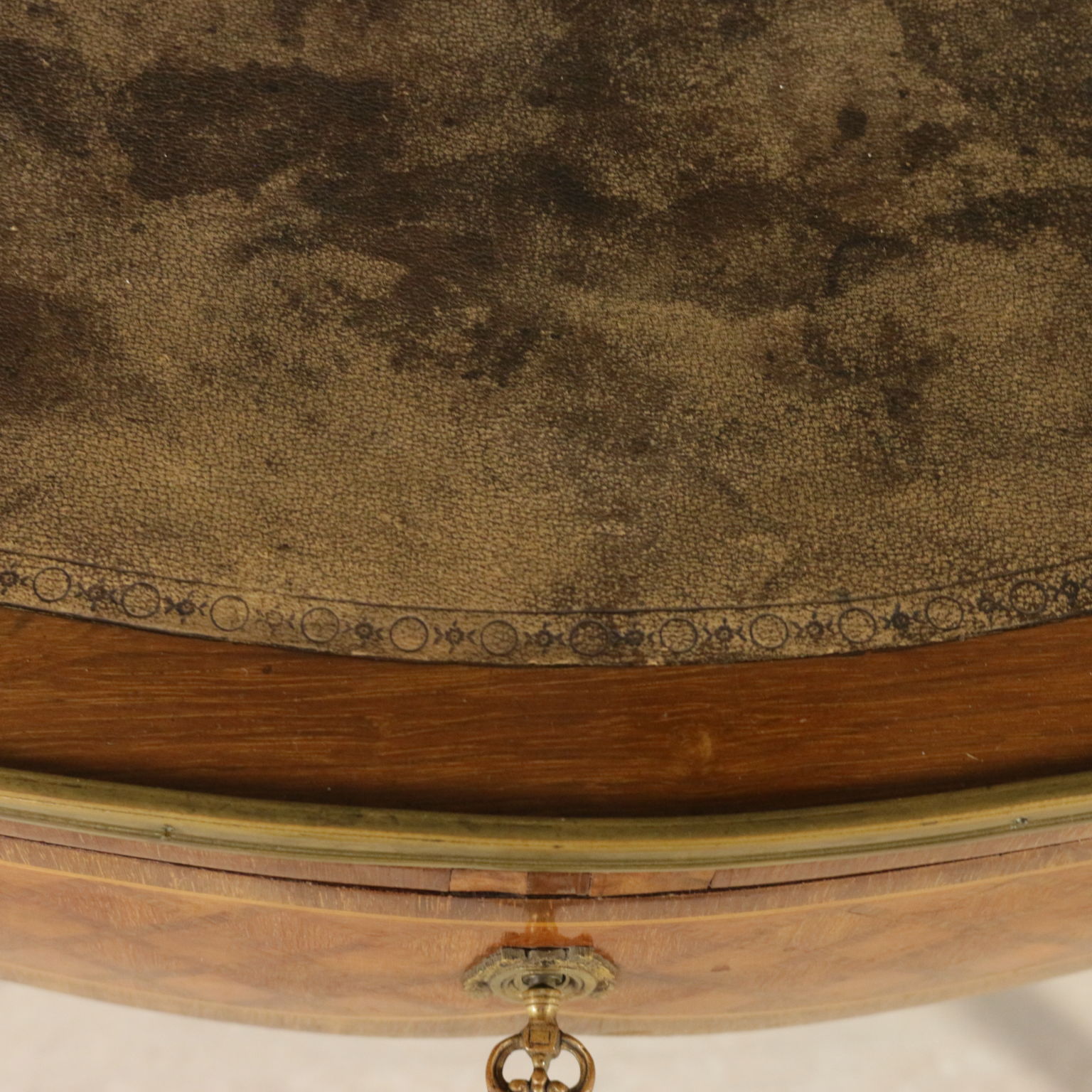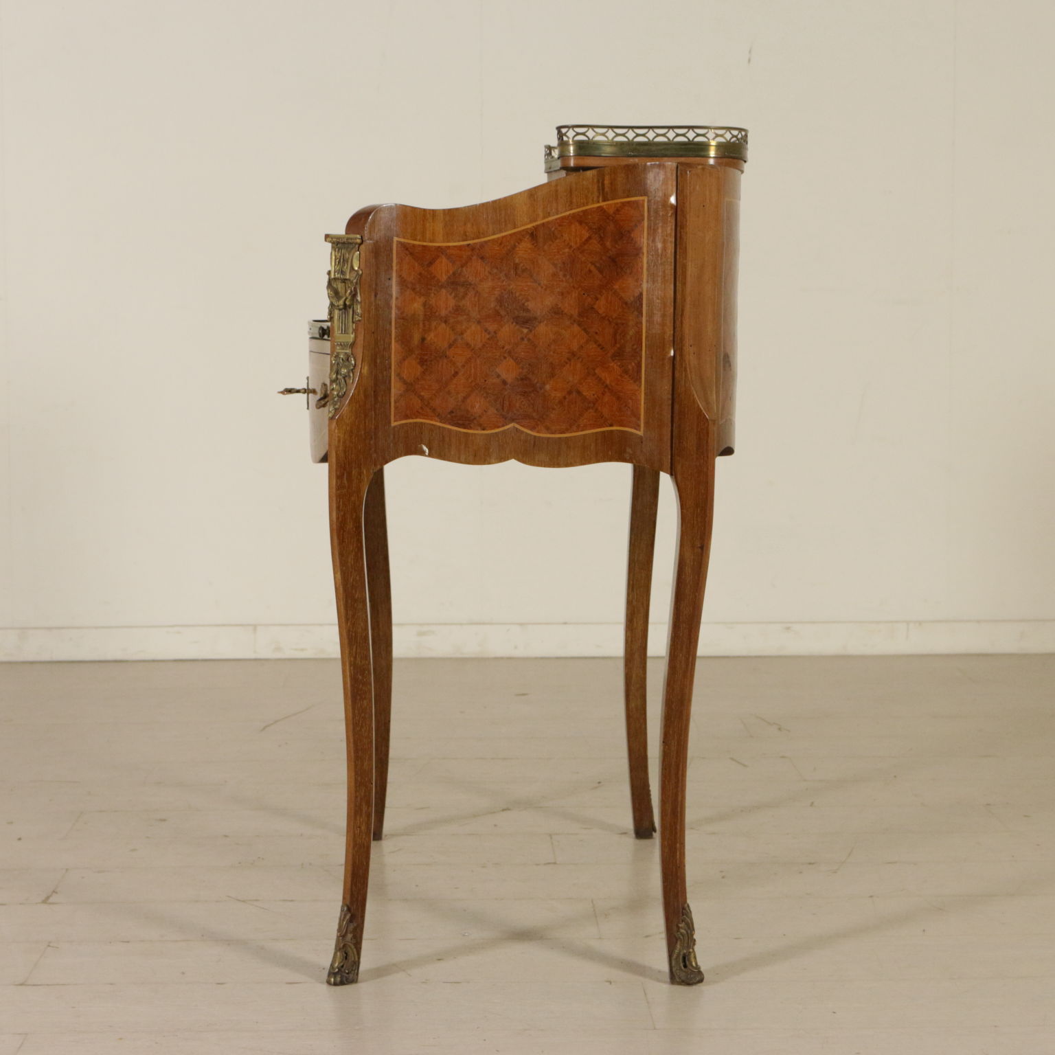 Elegante scrittoio da centro dalla linea mossa, presenta un cassetto e piano con inserto estraibile in pelle. L'alzata con vani a giorno presenta due cassetti e piccolo piano con marmo. Impreziosito da intarsi a marquettere, fregi e cornici in bronzo dorato.