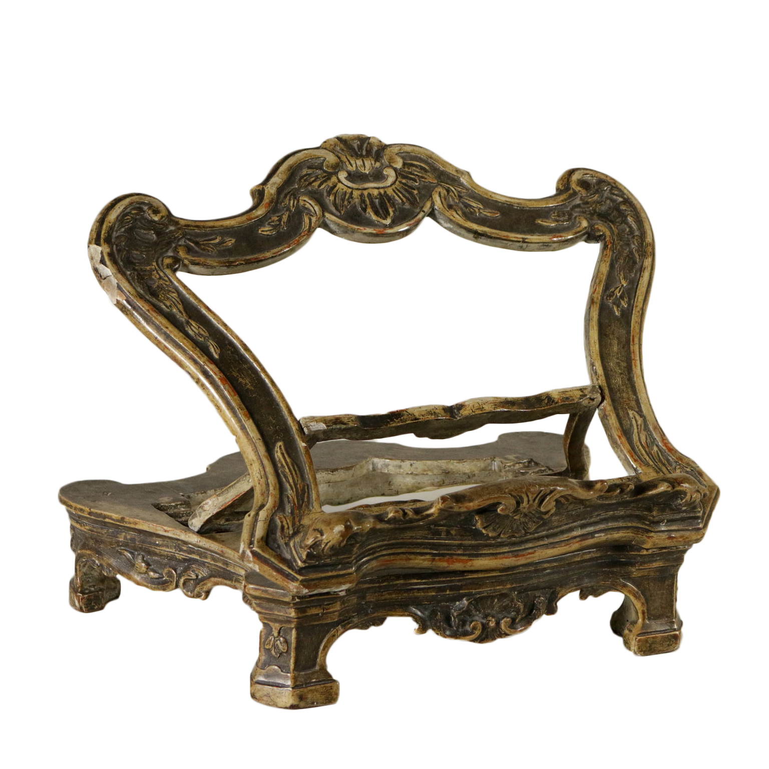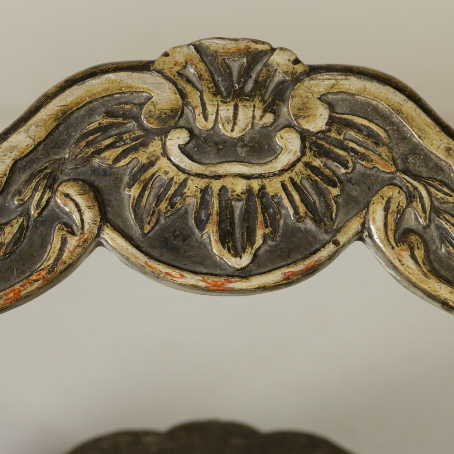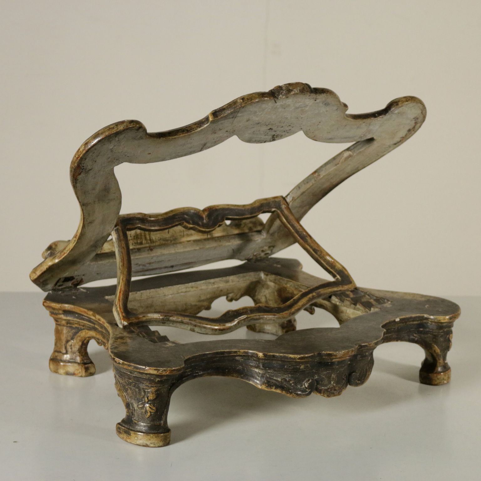 Leggio da tavolo ripiegabile in legno intagliato e argentato a mecca, a linea mossa con decori fogliacei e conchiglie.